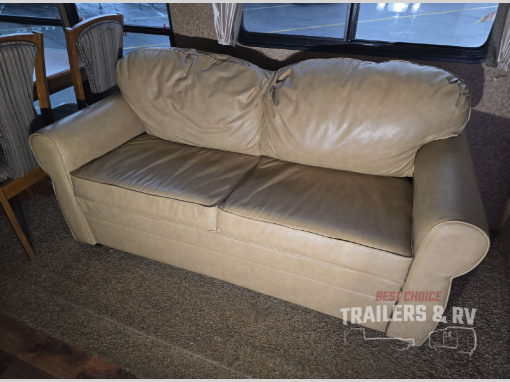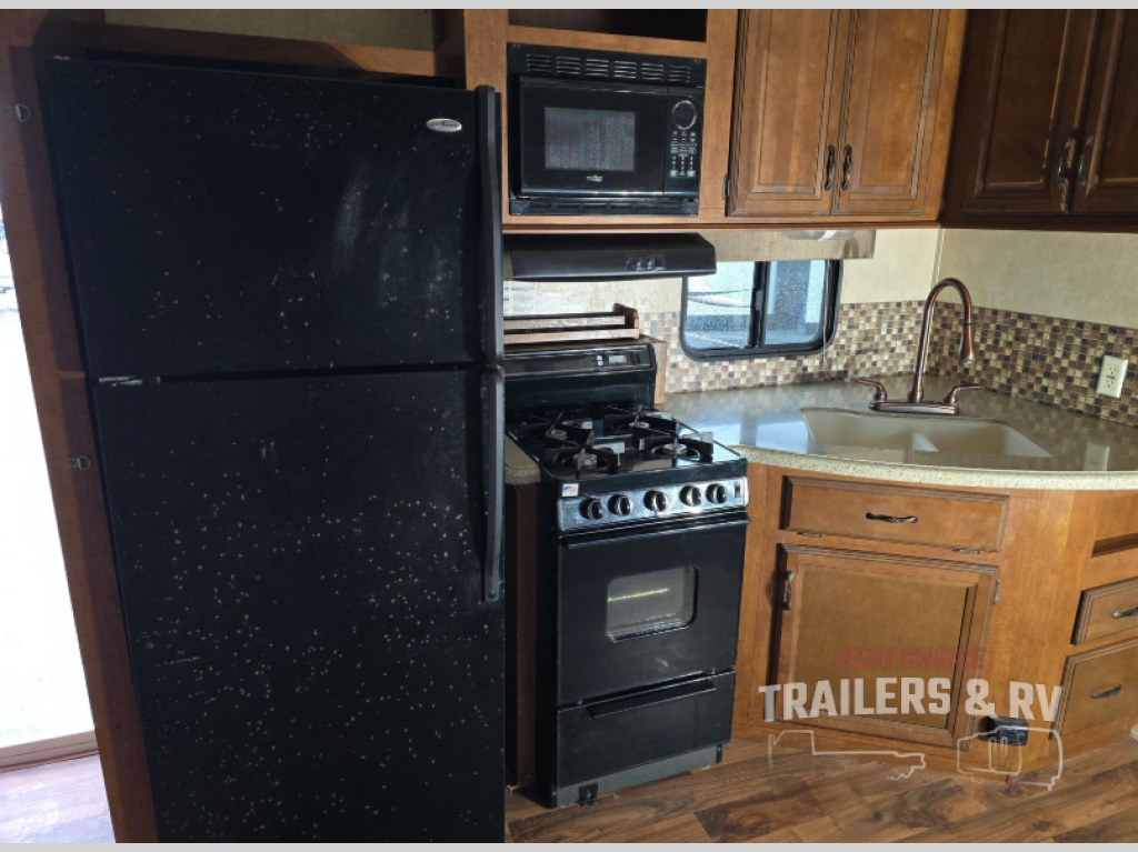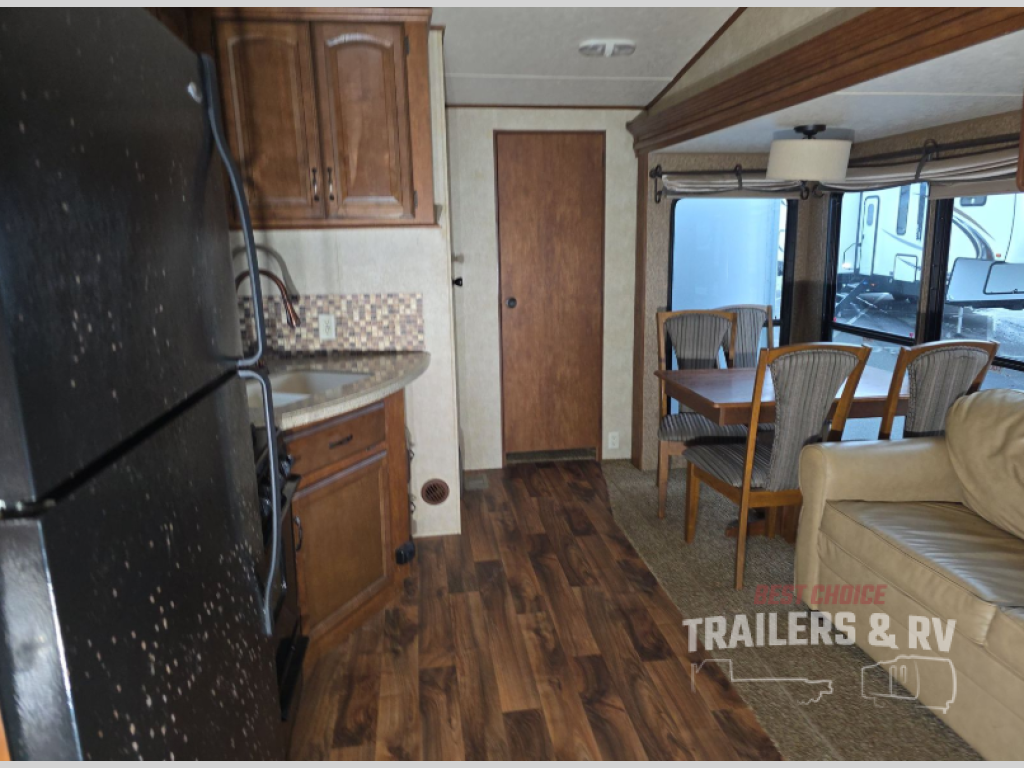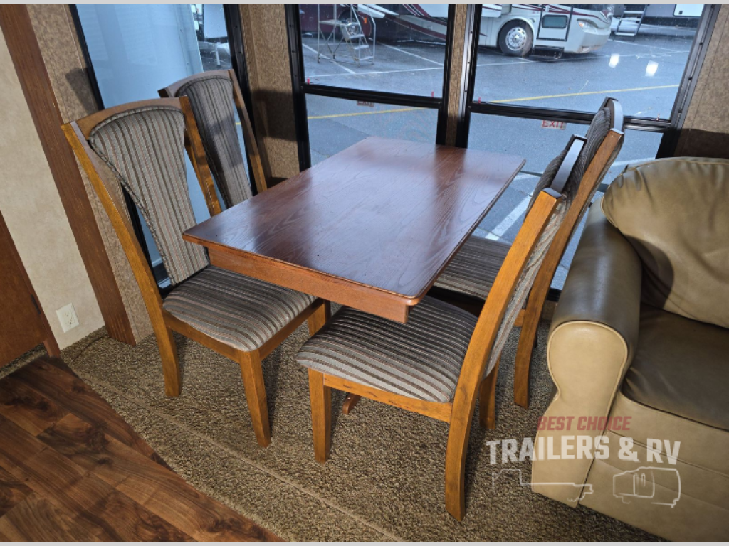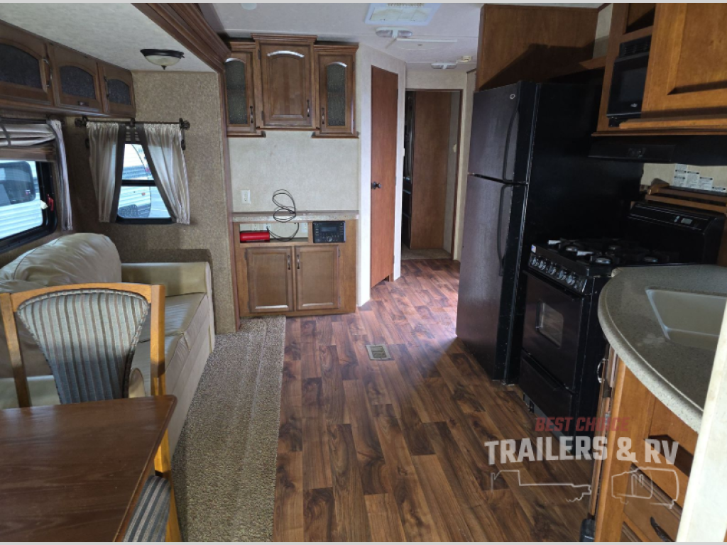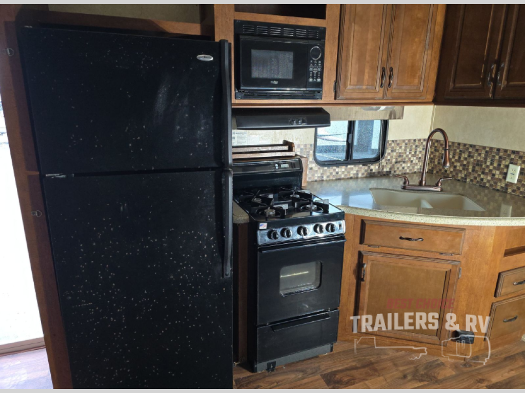 As you enter the destination trailer, to the left is a refrigerator, four burner range, microwave, and double kitchen sink. Around the corner you will find a convenient pantry. The opposite side of the trailer has a slide with a free-standing dinette and sofa. Along one wall you will find an entertainment center.