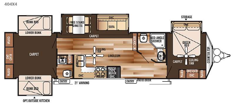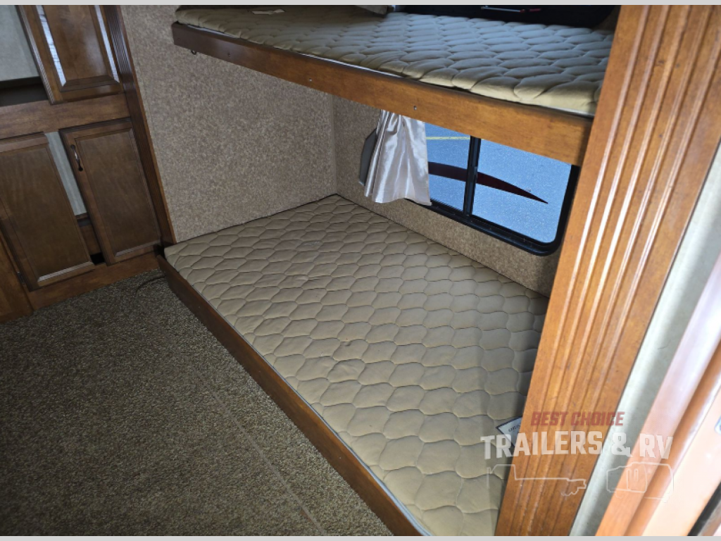 The rear of the destination trailer has two slides. Each slide offers a set of bunks. Along the rear wall you are sure to enjoy the entertainment center. There are also two wardrobes on either side of the entertainment center. Just off of the bunk house there is a convenient half bath. From the bathroom you will find a private entrance door which leads outside.