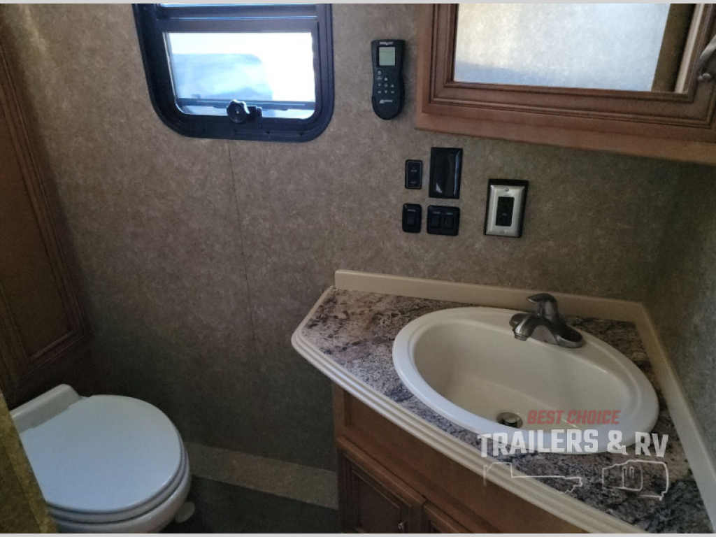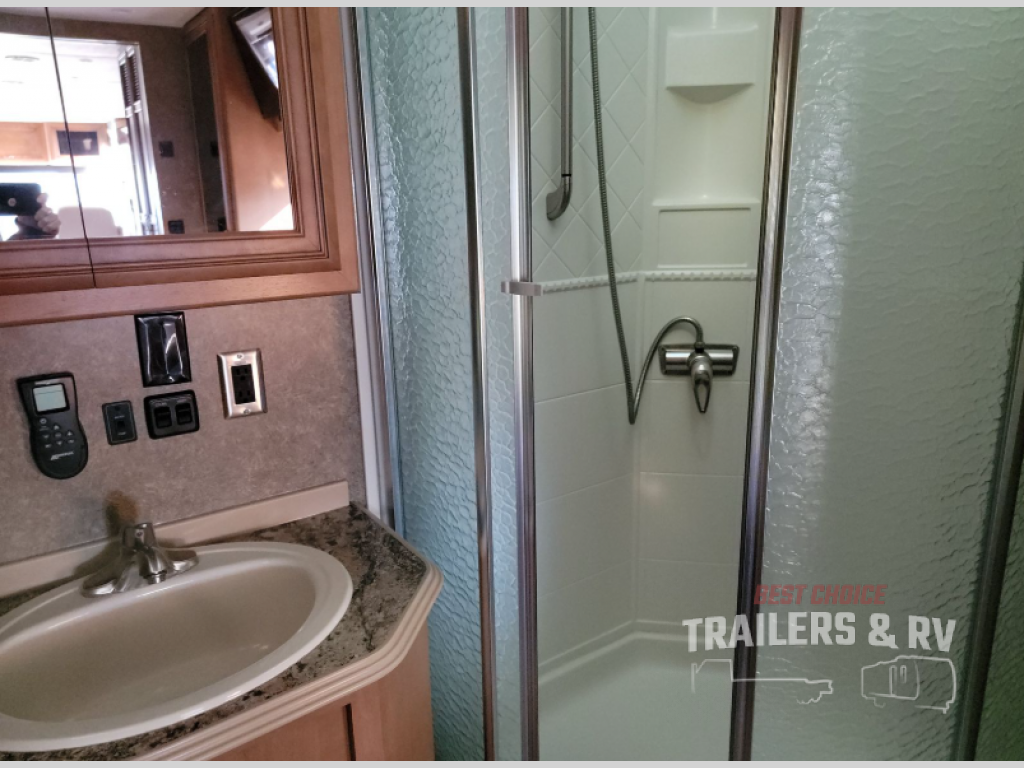 In the very rear of the motor home, you will find a master bath with a shower, sink, linen cabinet, and toilet.