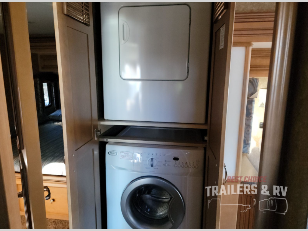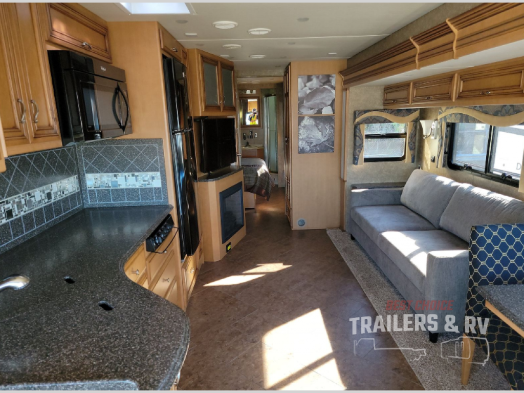 As you enter the 3610, to the left is a double kitchen sink, three burner range, refrigerator, pantry, and linen cabinet. Next to the linen is a dry bar with a TV. The opposite side has a slide with a dinette, sofa, and end table slide. Next to the slide is a wardrobe, which provides added space.