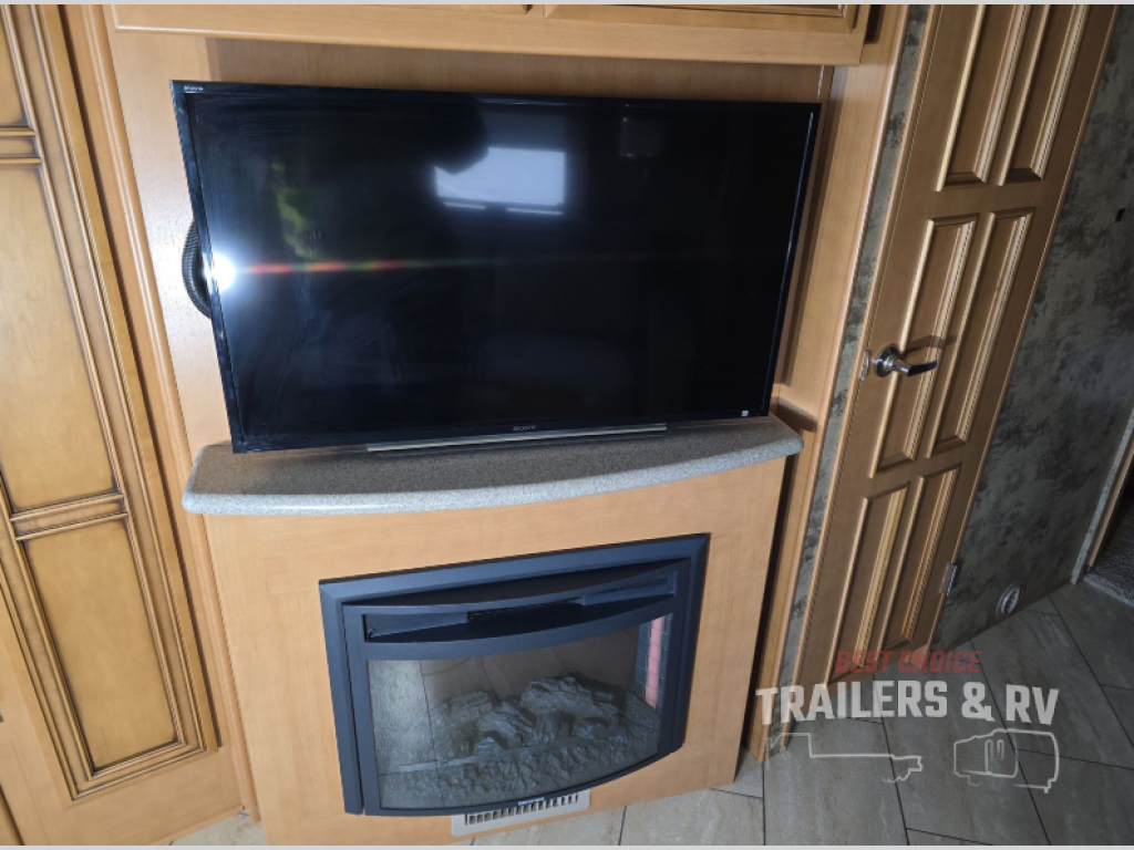 Stepping inside this motor home you will find along the curbside there is an angled double kitchen sink, three burner range, refrigerator, and pantry. Adjacent to the pantry you will find a dry bar with a TV.