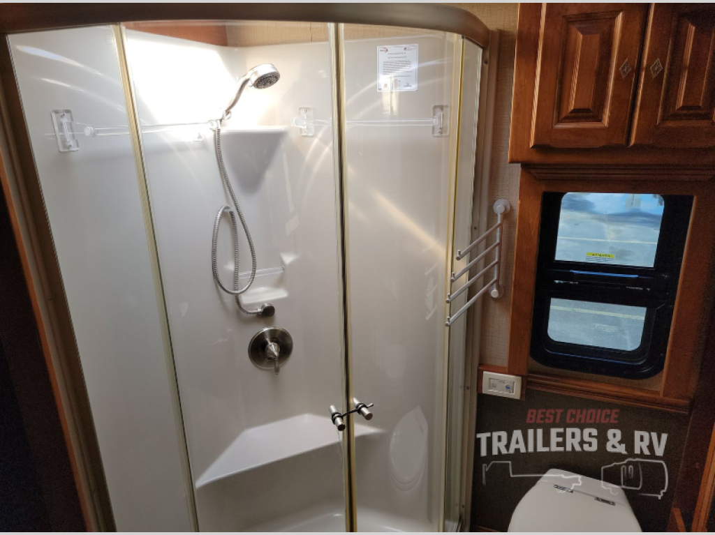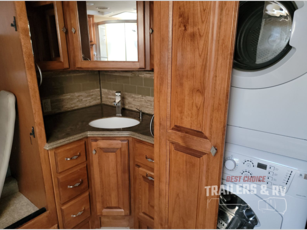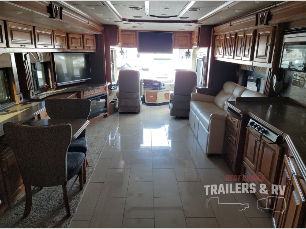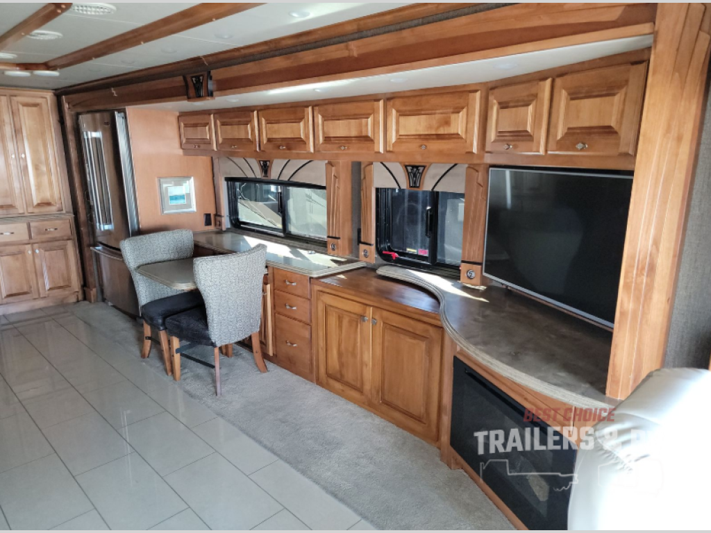 Moving down the road side, the slide has a sofa bed, booth dinette, overhead cabinets, residential refrigerator, and pantry. You may also choose the following optional items for the slide, a u-shaped booth dinette, a dinette with computer workstation, an entertainment center with one leather recliner, and leather recliners. Just back inside the coach, there is a TV facing the front with the option for a fireplace below.