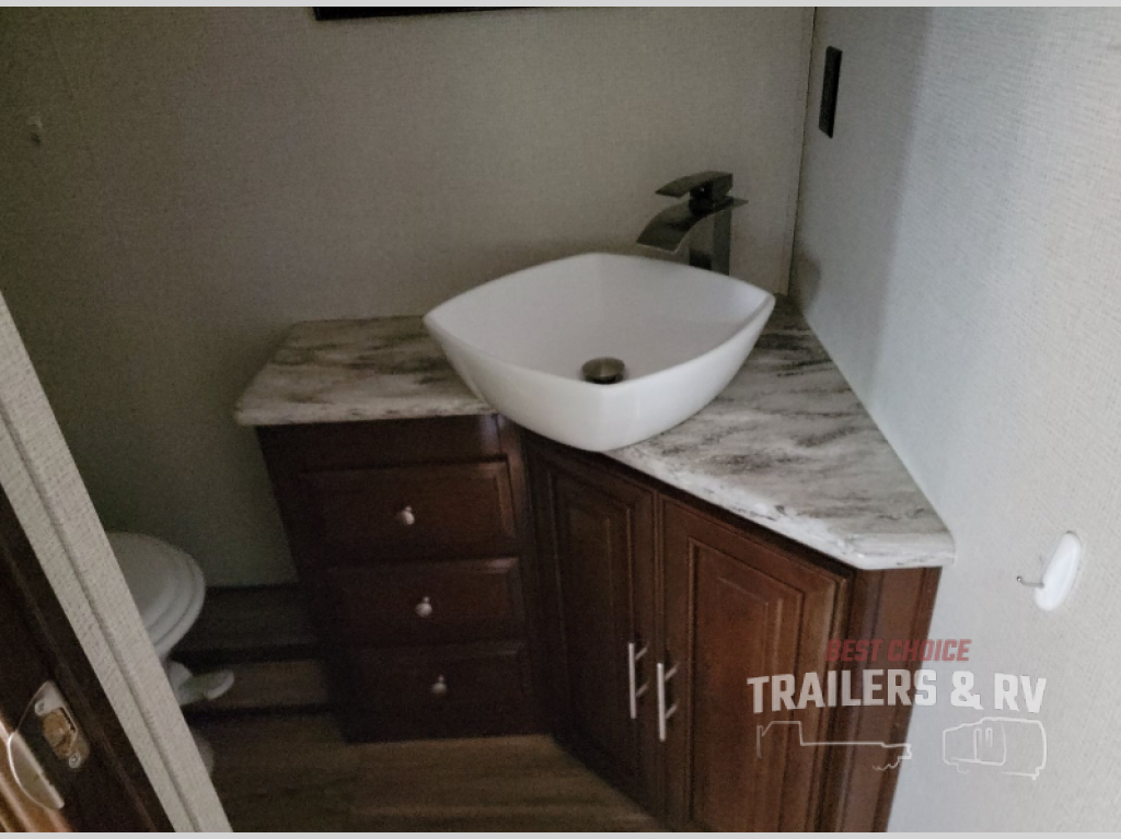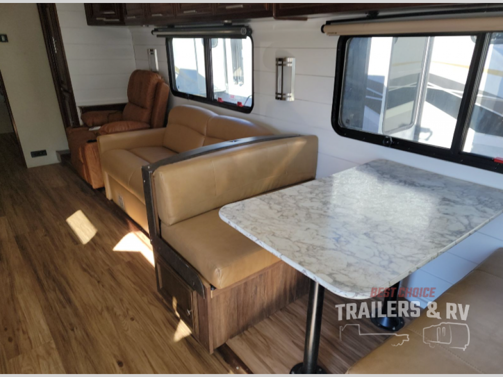 The road side slide in the main living area has a dinette or you can choose an optional free-standing dinette and chairs, an L-shaped sofa, and a wardrobe just across from the half bath.
