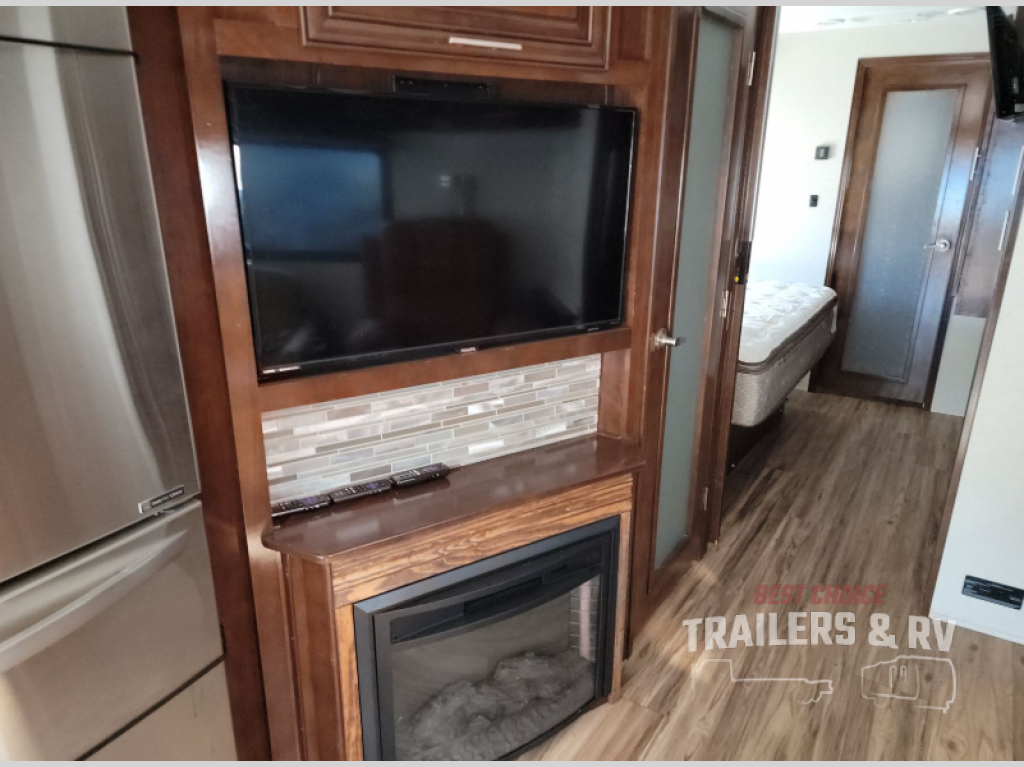 The walk-through bedroom features a king bed slide with overhead cabinets. There is also a wardrobe, TV, and optional washer and dryer.