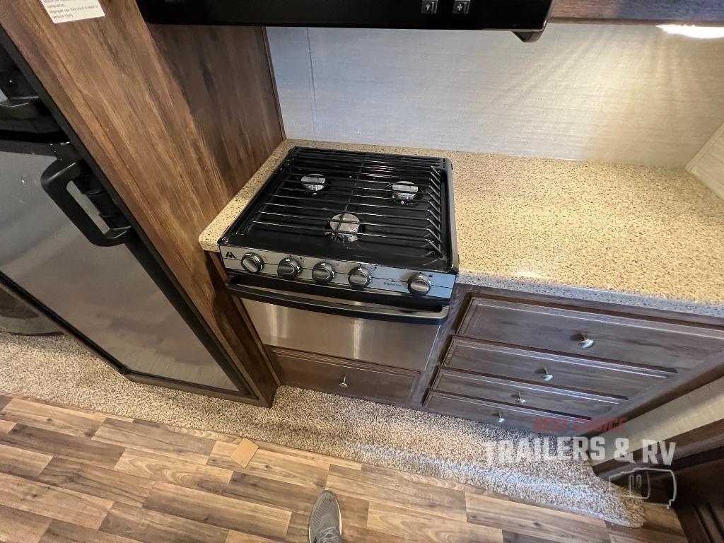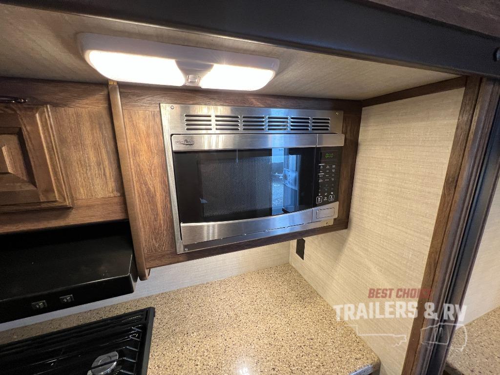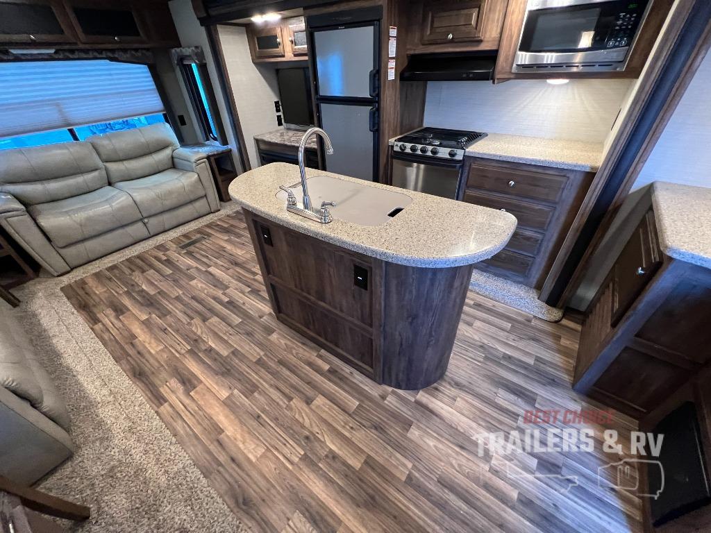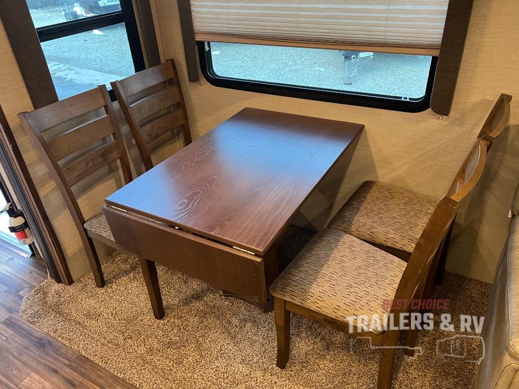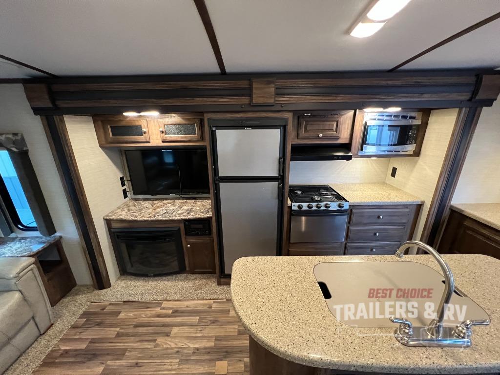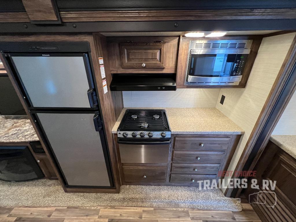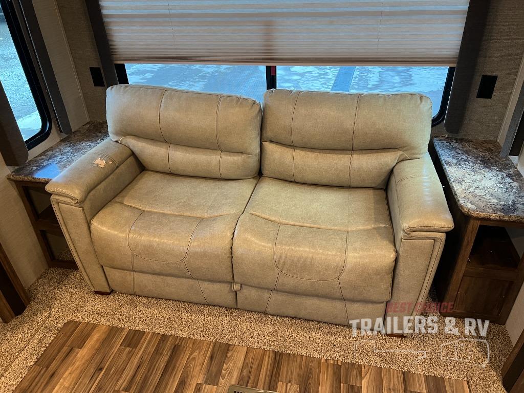 Back in the main living and kitchen space find a free standing dinette with theater seats, cup holders, and storage above, or you can choose an optional booth dinette and optional recliners. Continuing around to the rear wall find a tri-fold sleeper sofa with two end tables and storage above. The second slide in this area features an entertainment center, and the kitchen appliances. You will enjoy having extra sleeping space with the sleeper sofa for guests.