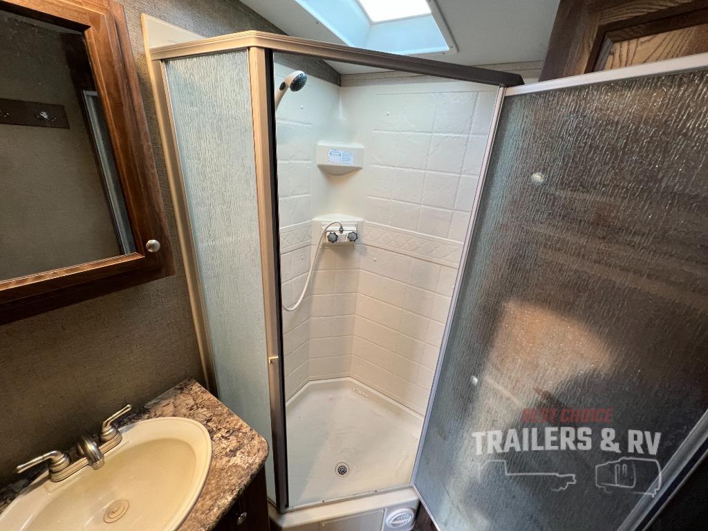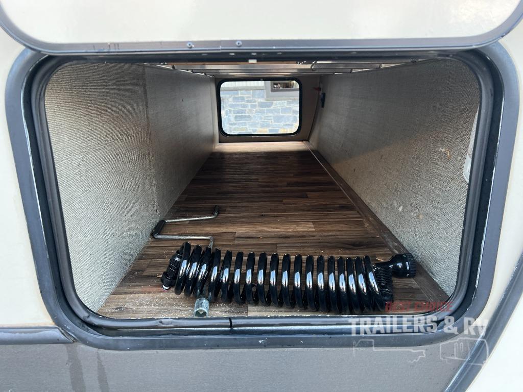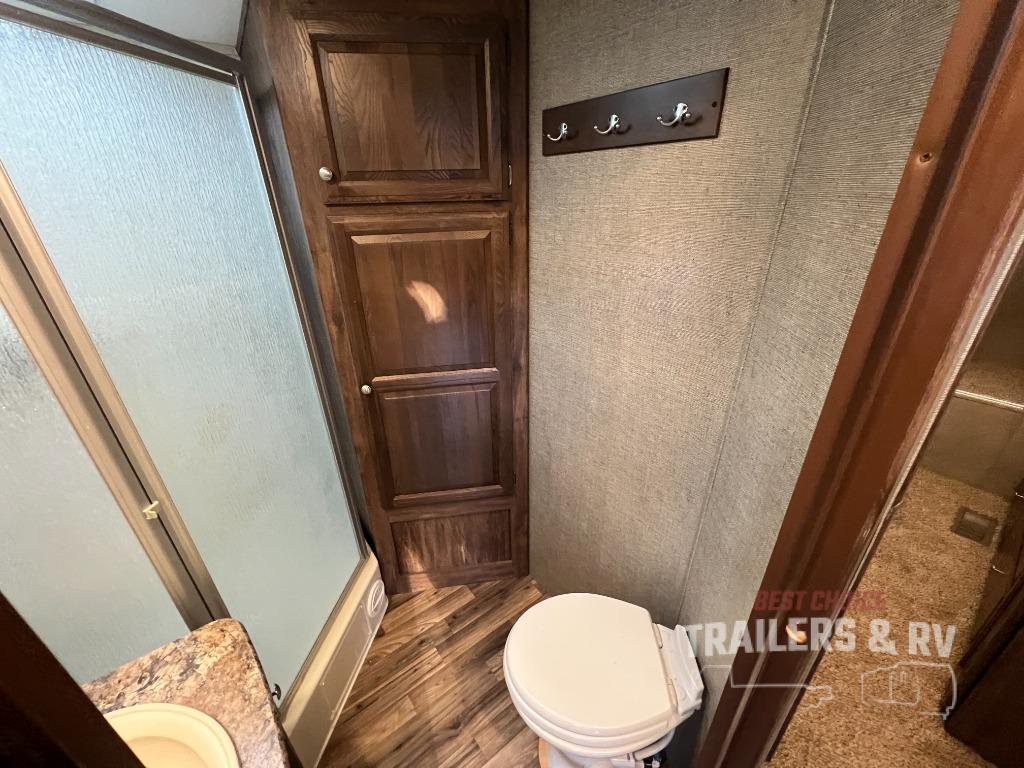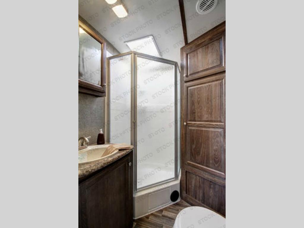 Just outside the bathroom door in the front find a private master bedroom with sliding door. The king bed slides out from the road side wall and includes overhead storage for your things. There is also a full front wardrobe with sliding doors, plus more storage opposite the bed with overhead cabinets as well.