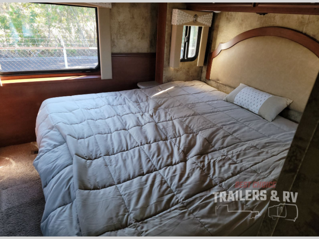 After a full day of exploring and seeing sights come retreat to the bedroom and get a good night's sleep on the king bed. For added room inside the bedroom you will find that the king bed is within a slide out. Also enjoy the storage space that the overhead cabinet and nightstands offer. Across from the bed you will find more storage with the chest of drawers, two shirt closets, and overhead cabinet. There is also a TV along the wall above the chest of drawer, and more!
