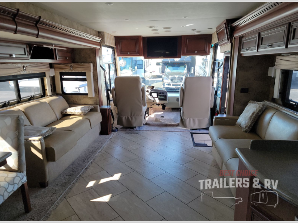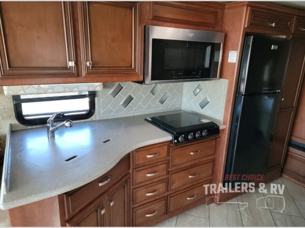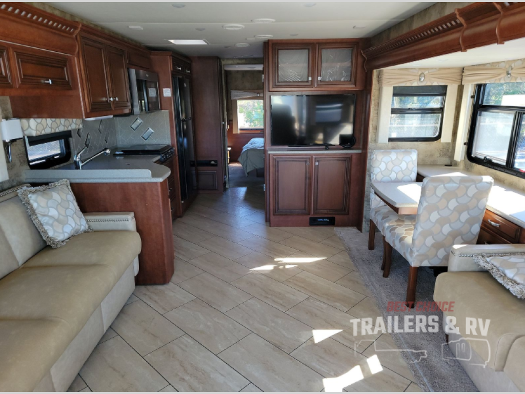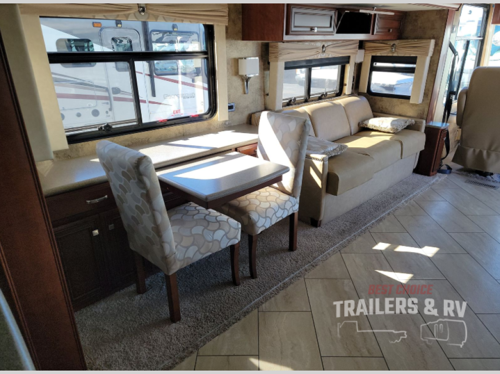 As you enter you will notice that the driver and passenger seat swivel around to add additional seating. There are dual slide outs which open up the living space inside this motor home. The first slide has a jack-knife sofa, and within this slide out you will find all of the kitchen appliances which make fixing meals a breeze. There is a double kitchen sink, three burner range, overhead cabinet, refrigerator, and pantry. The slide out on the road side of the motor home has a jack-knife sofa, overhead cabinet, and a dinette where you can enjoy your meals. Next to the dinette there is a dry bar with a TV.