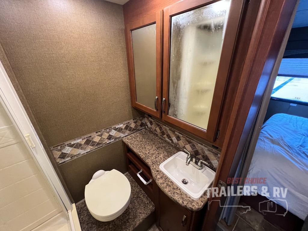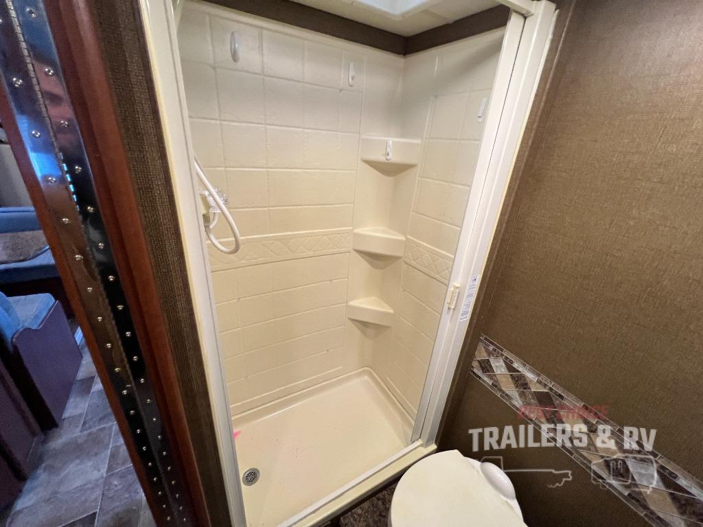 Heading toward the rear of this model, the side aisle bathroom is along the left side. Here there is a sink, plenty of counter space, an overhead cabinet, toilet, and a 24" x 36" shower.
