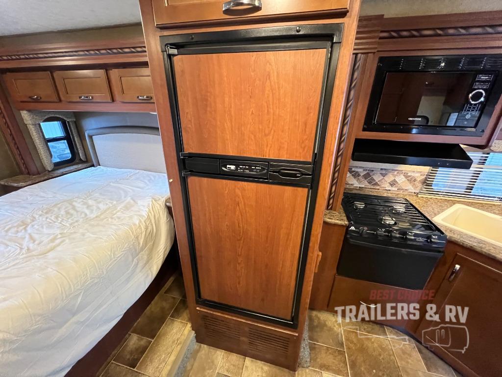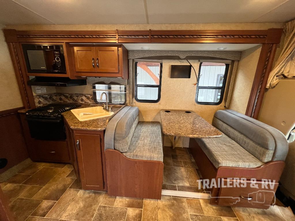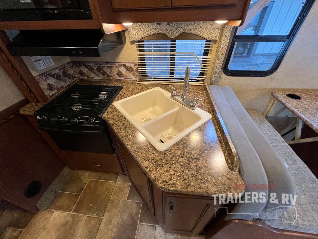 As you enter this model you will find yourself in the combined kitchen and living area. Here there is a slide out along the roadside which features a 71" Dream Dinette with a 40" LED TV above, a large sink, overhead cabinets, a three burner range with a microwave above, and adjacent to the slide out there is a refrigerator for your perishable food items. To the right of the door there is a 68" jack-knife sofa with an overhead cabinet.