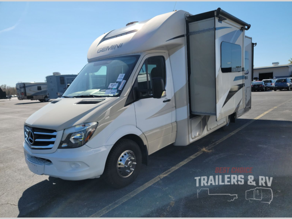 If you are looking for a slide out in the main living area, cushioned seating and a flip-up queen bed slide in the rear, plus a complete bath then take a look inside this Thor Motor Coach Gemini class C diesel motorhome.