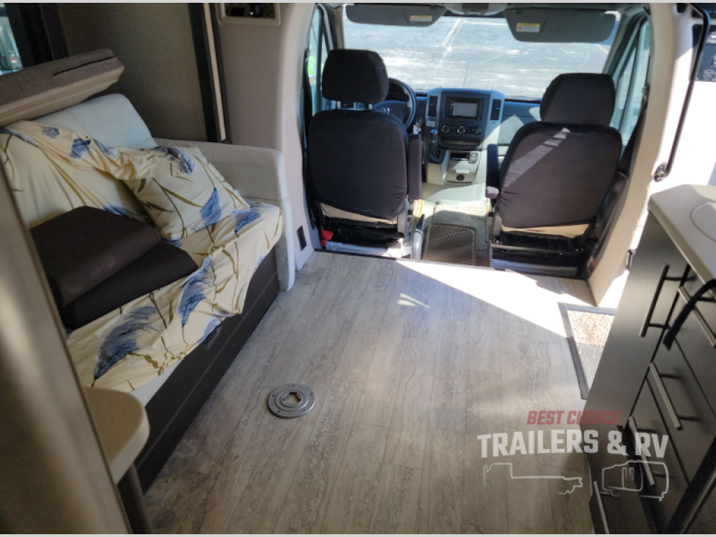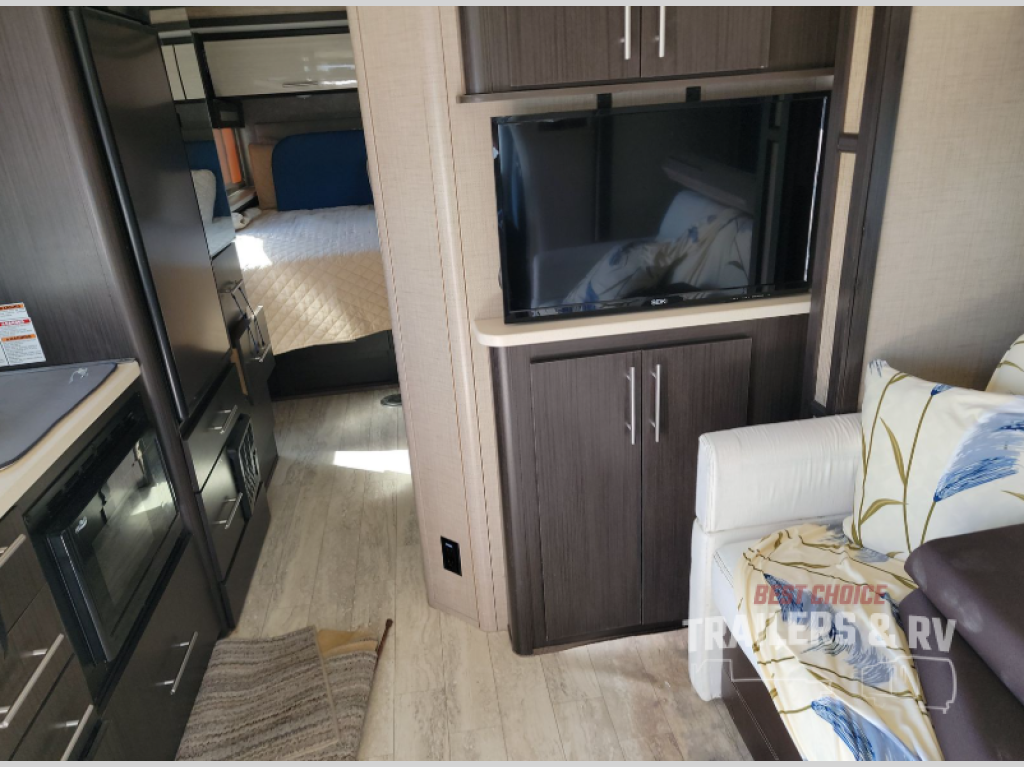 As you enter model 24TX to your left you will find the kitchen sink, counter space, two burner range, convection microwave, and a refrigerator for making meals on the road.