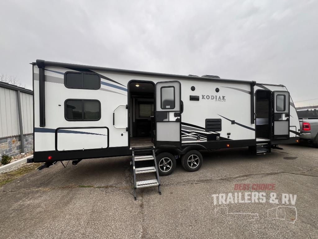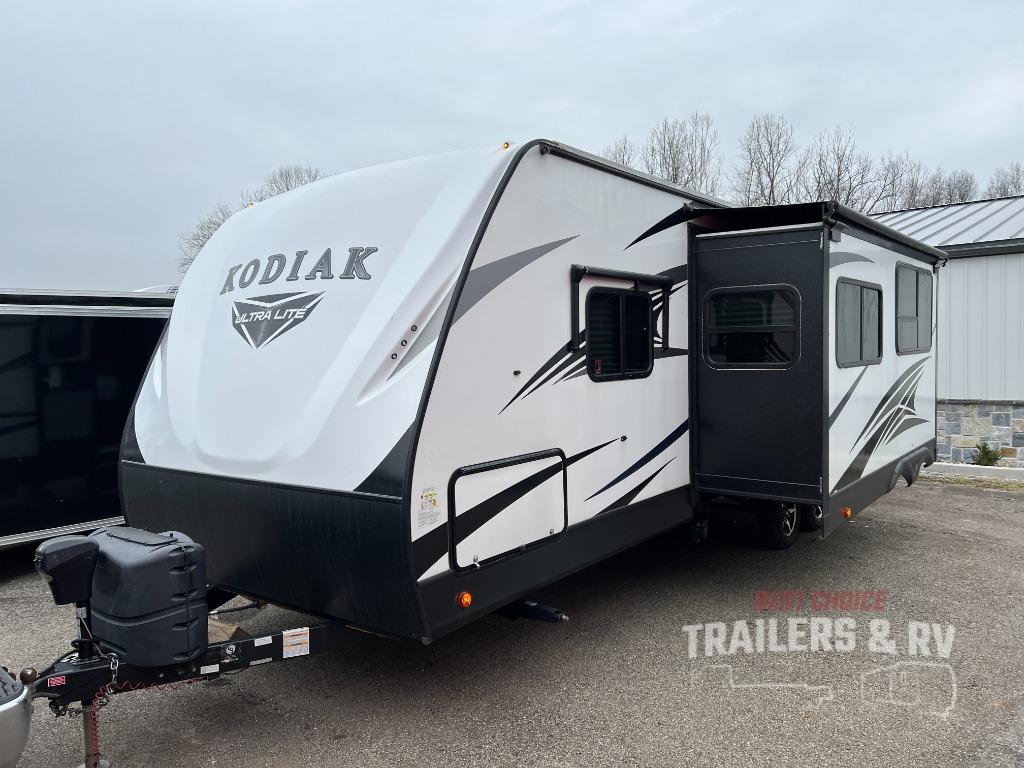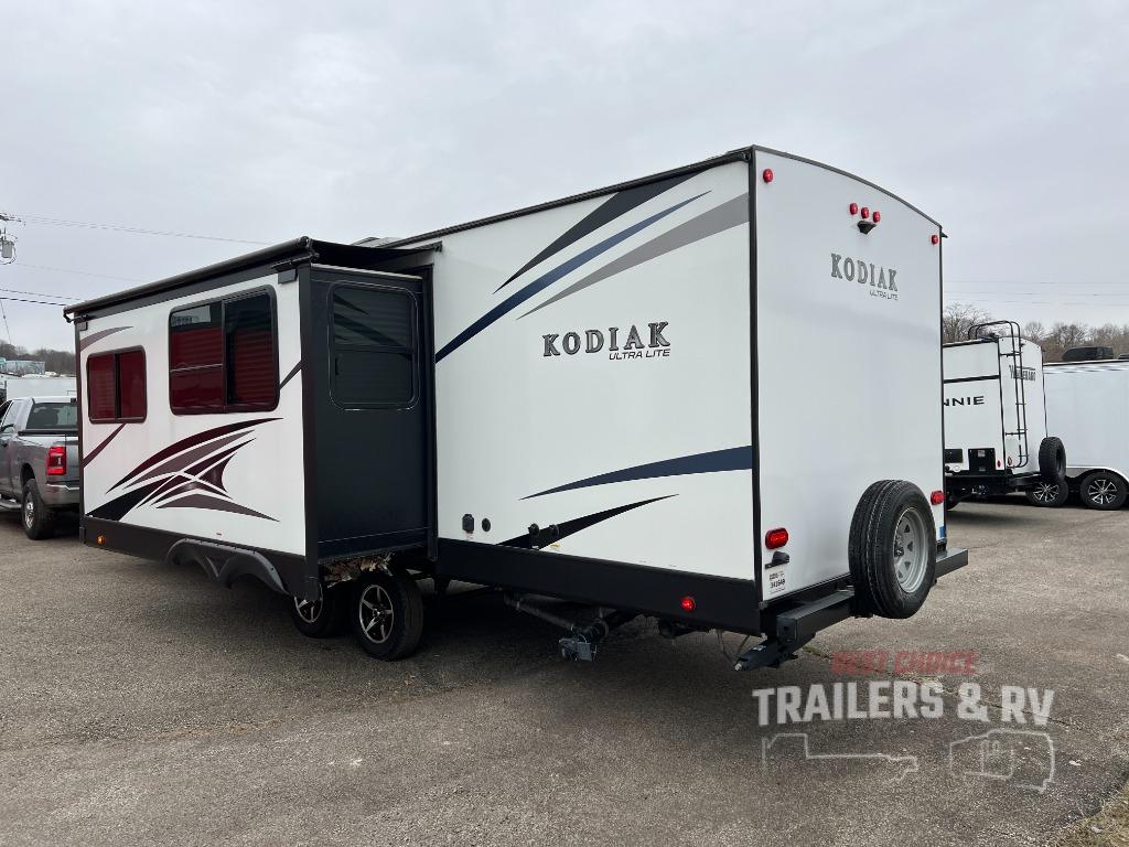 With any Dutchmen Kodiak Ultra-Lite travel trailer you begin with bear cage construction, aluminum framing, a fully laminated exterior, and a fiberglass front cap with LED lights. Some premium features include aluminum entry steps that collapse and expand, solar roof ready prep, and a residential queen bed allowing you to relax in comfort. There are many more reasons you will want to own a Kodiak Ultra-Lite, choose your favorite today!