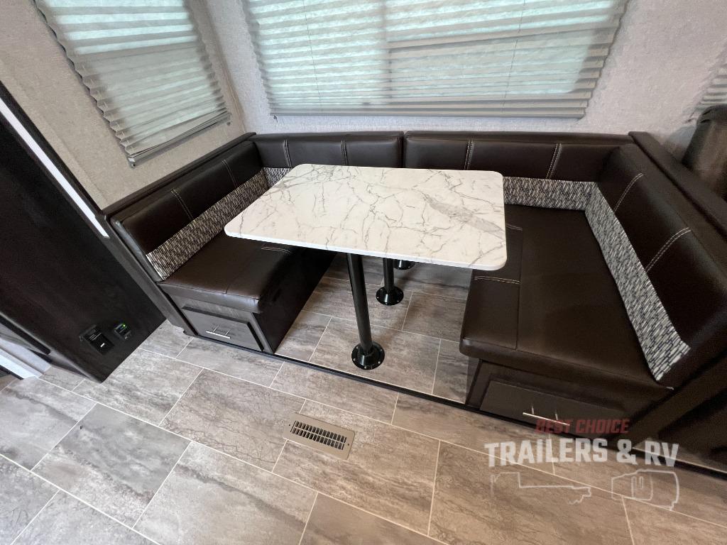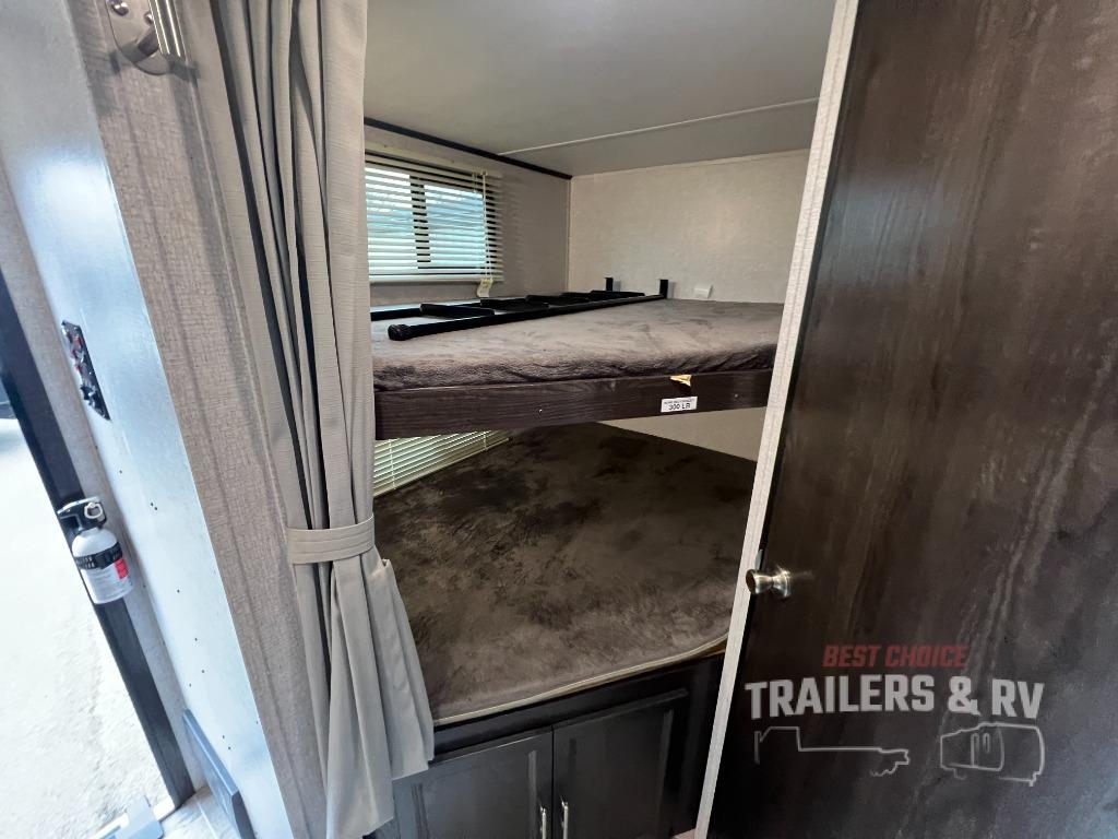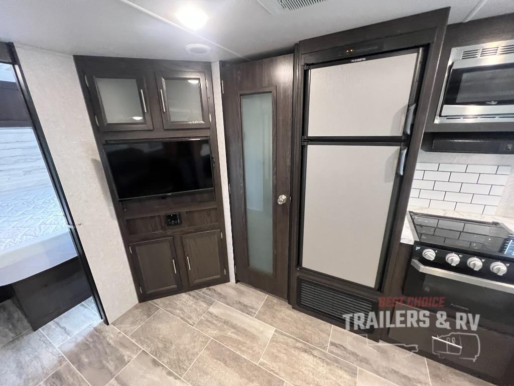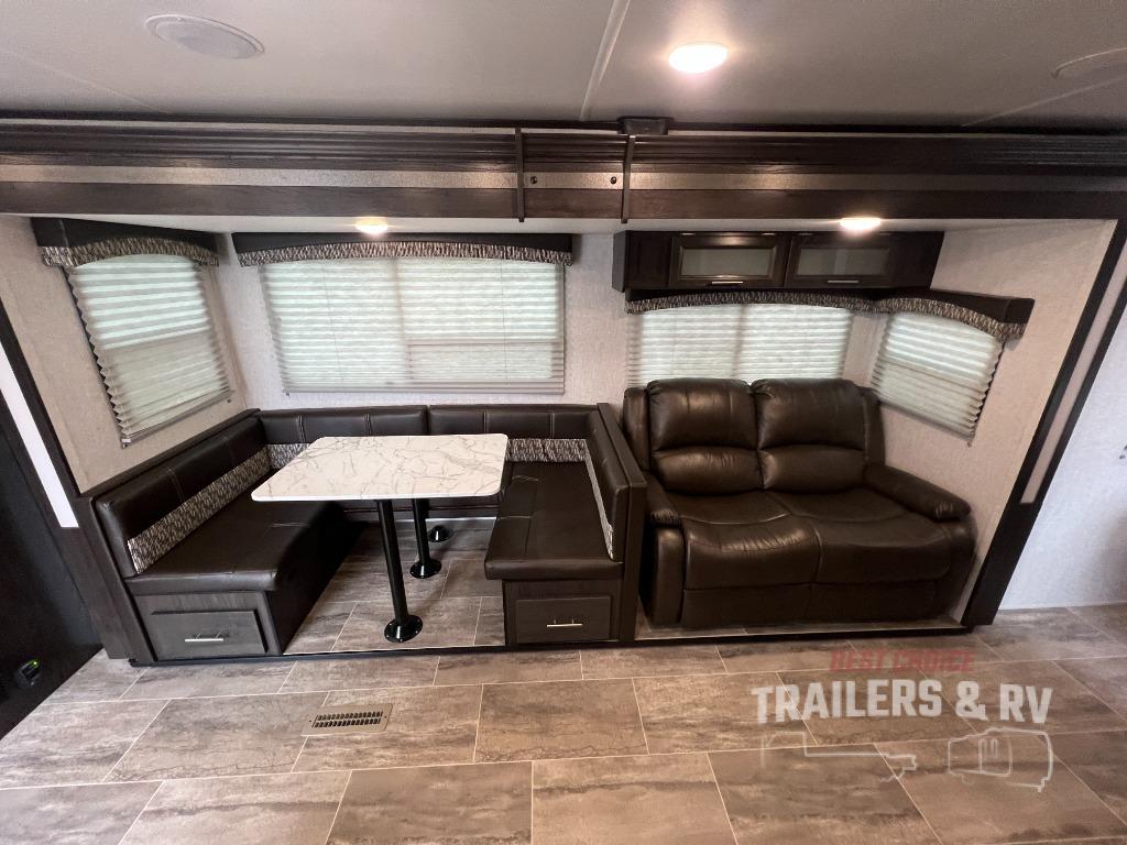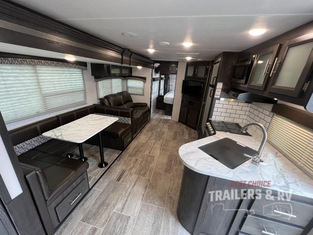 Camping with the comforts of home just sounds more fun! Imagine having your own bedroom with the second exterior entrance and a residential queen bed while the kiddos have their own double size bunks next to the full bathroom. The full bathroom even includes a shower/tub combo. The cook will love being able to make meals outside while watching the kids and visiting with other RVers as well as inside with all the appliances to even make a holiday meal. And the slide out U-shaped dinette and sofa offer a dining area, a game playing headquarters, and sleeping space for friends. You will also find plenty of storage for all your things with two pantries, overhead cabinets, dual wardrobes and compartments along the exterior.