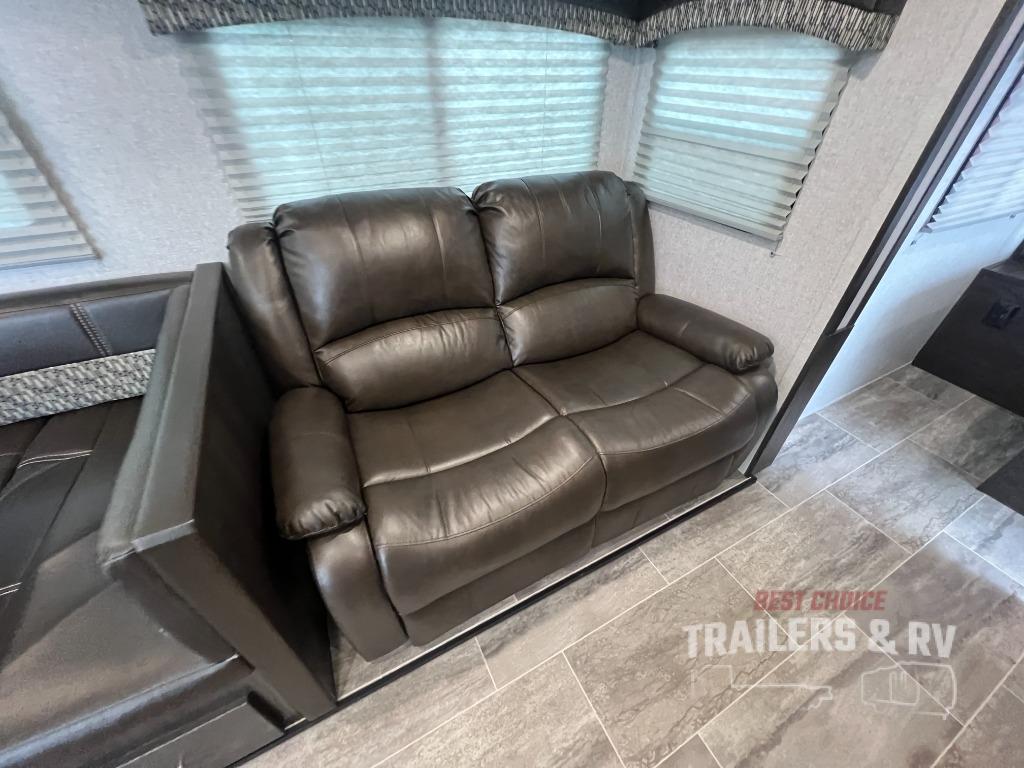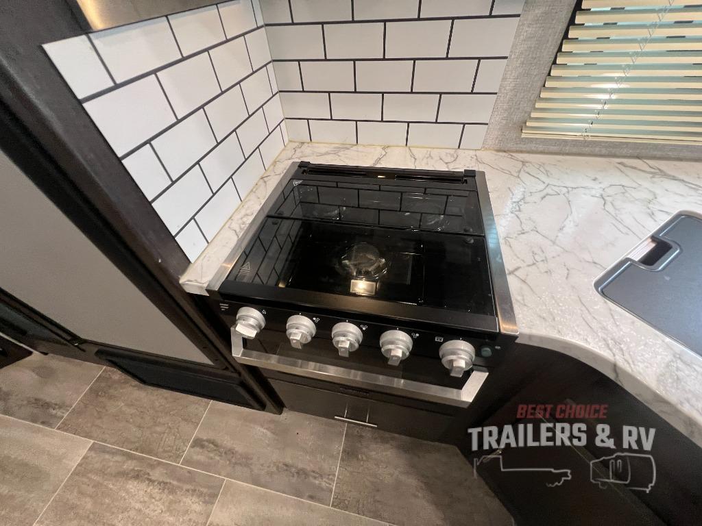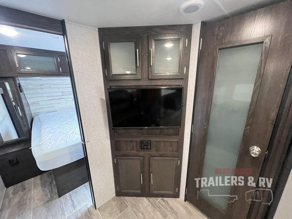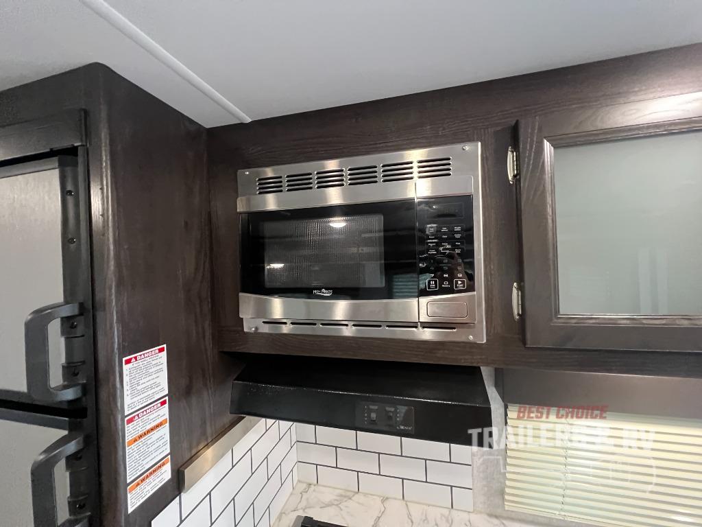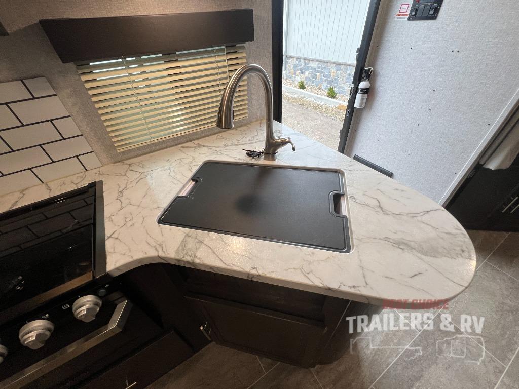 Camping with the comforts of home just sounds more fun! Imagine having your own bedroom with the second exterior entrance and a residential queen bed while the kiddos have their own double size bunks next to the full bathroom. The full bathroom even includes a shower/tub combo. The cook will love being able to make meals outside while watching the kids and visiting with other RVers as well as inside with all the appliances to even make a holiday meal. And the slide out U-shaped dinette and sofa offer a dining area, a game playing headquarters, and sleeping space for friends. You will also find plenty of storage for all your things with two pantries, overhead cabinets, dual wardrobes and compartments along the exterior.