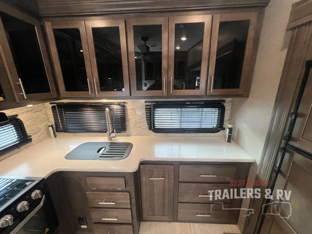 The chef of your group is going to love camping in this rear-kitchen Forest River Rockwood Ultra Lite fifth wheel! There is plenty of counter space for them to create their best meals, and the sliding waste bin makes it easy to dispose of any trash. If they don't feel like cooking indoors, then they can head to the outdoor gas griddle to grill up some juicy burgers. The 44" x 81" king U-shaped dinette is the perfect place for you to enjoy your meals or play some card games while you enjoy the comforts of the fireplace across from it. The front master suite features a queen Serta bed for you to enjoy a good night's rest, and if you need more sleeping spaces for your guests, then you can transform the 60" hide-a-bed sofa and even the dinette!