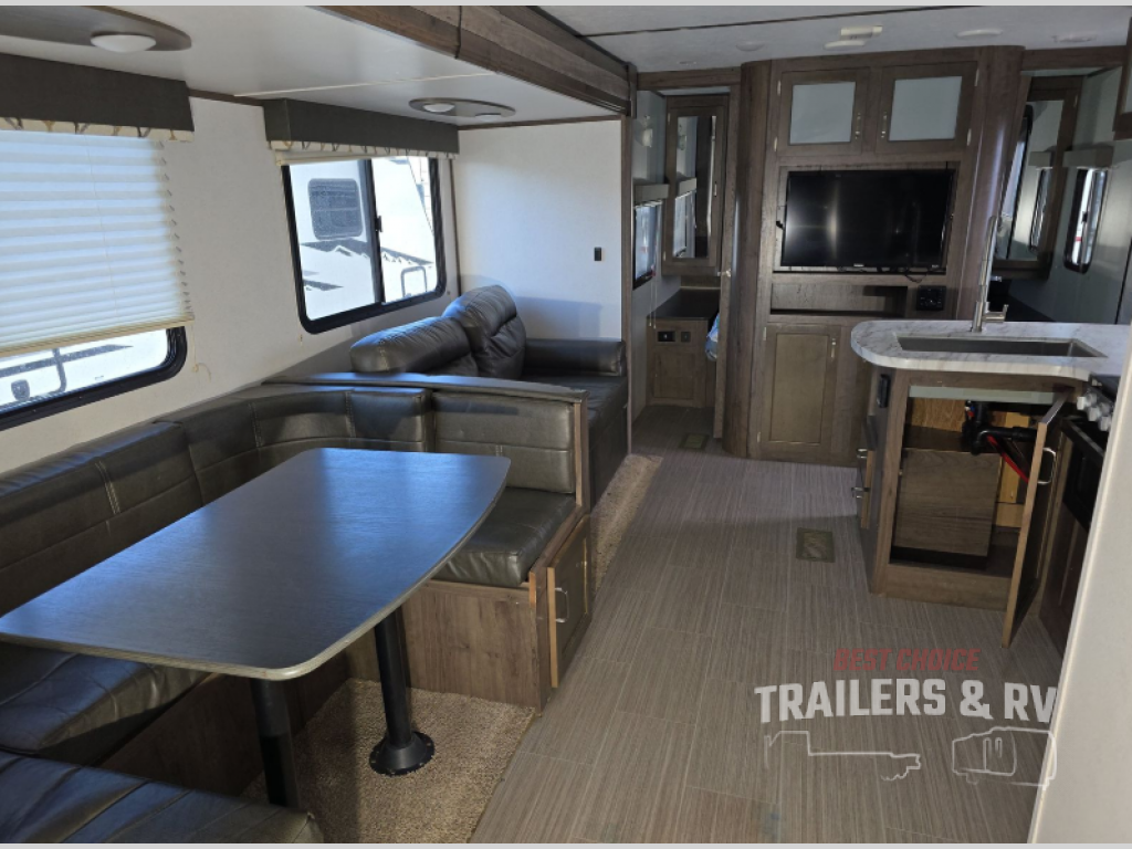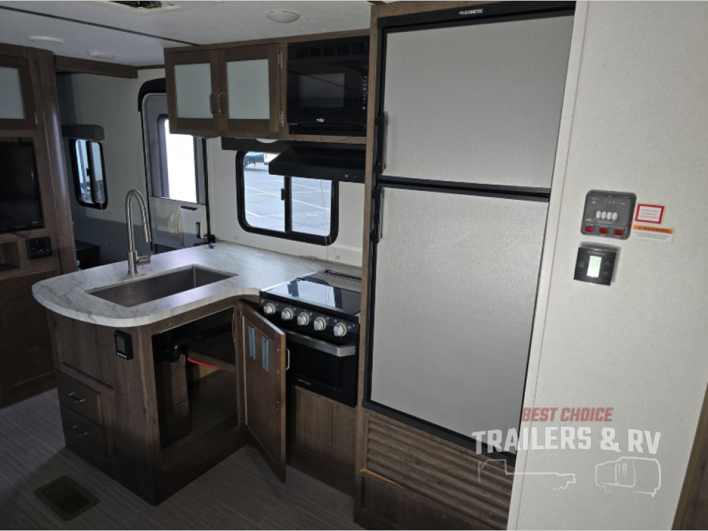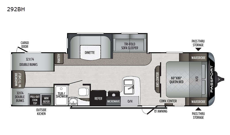 Are you looking for your ticket to fun and comfort with your larger family when enjoying the great outdoors? This Passport travel trailer offers sleeping space for ten happy campers! The kids will surely love choosing from two top bunks and two bottom bunks in the rear bunkhouse with a wardrobe to store their clothes. You will be able to escape to your own bedroom up front, and everyone can make meals together inside with all the appliances in the kitchen. Or, you can head outside and create a summer barbecue at the outdoor kitchen. The full bathroom will keep everyone clean and smelling fresh after biking, hiking, and roasting marshmallows.