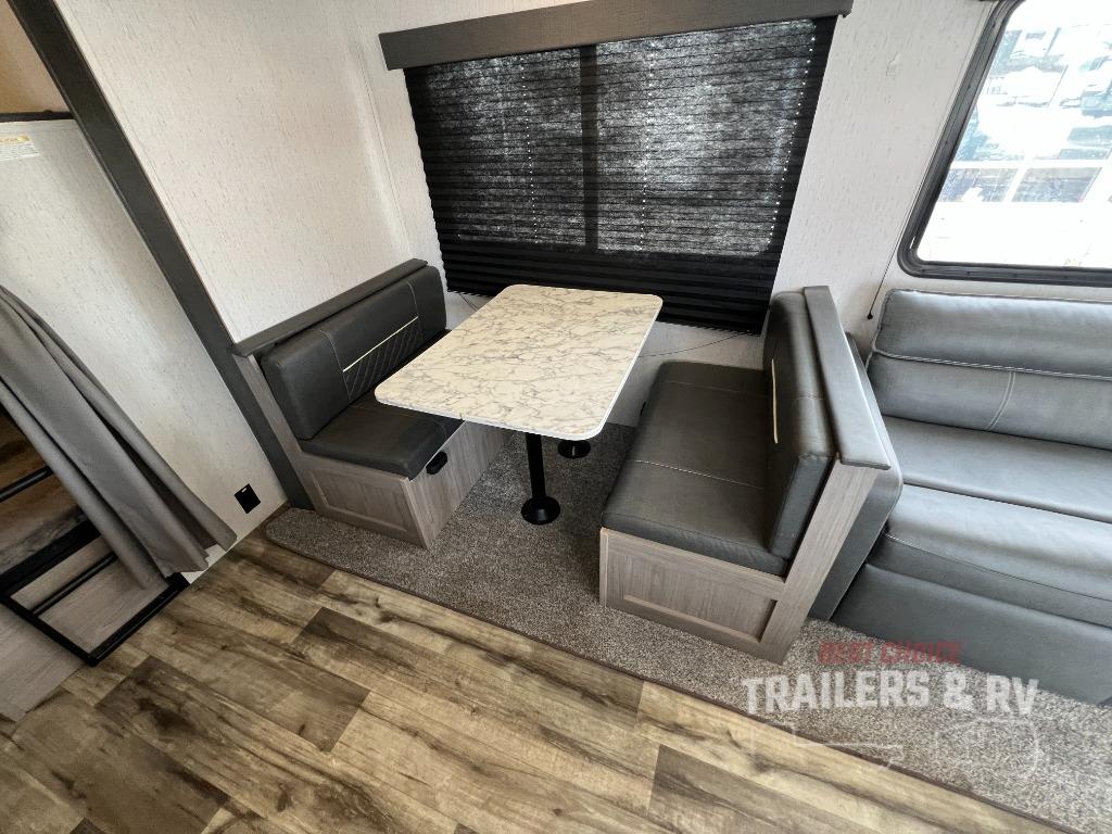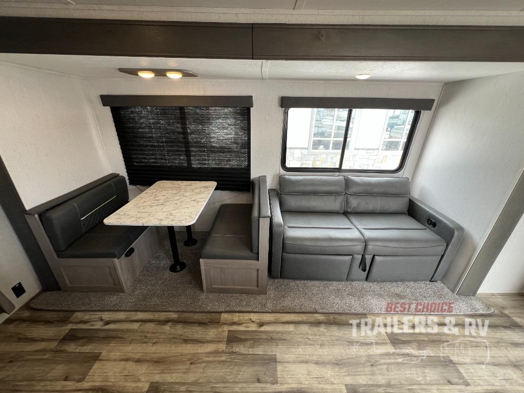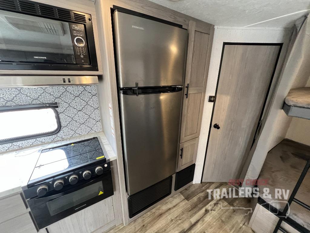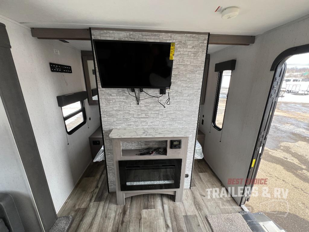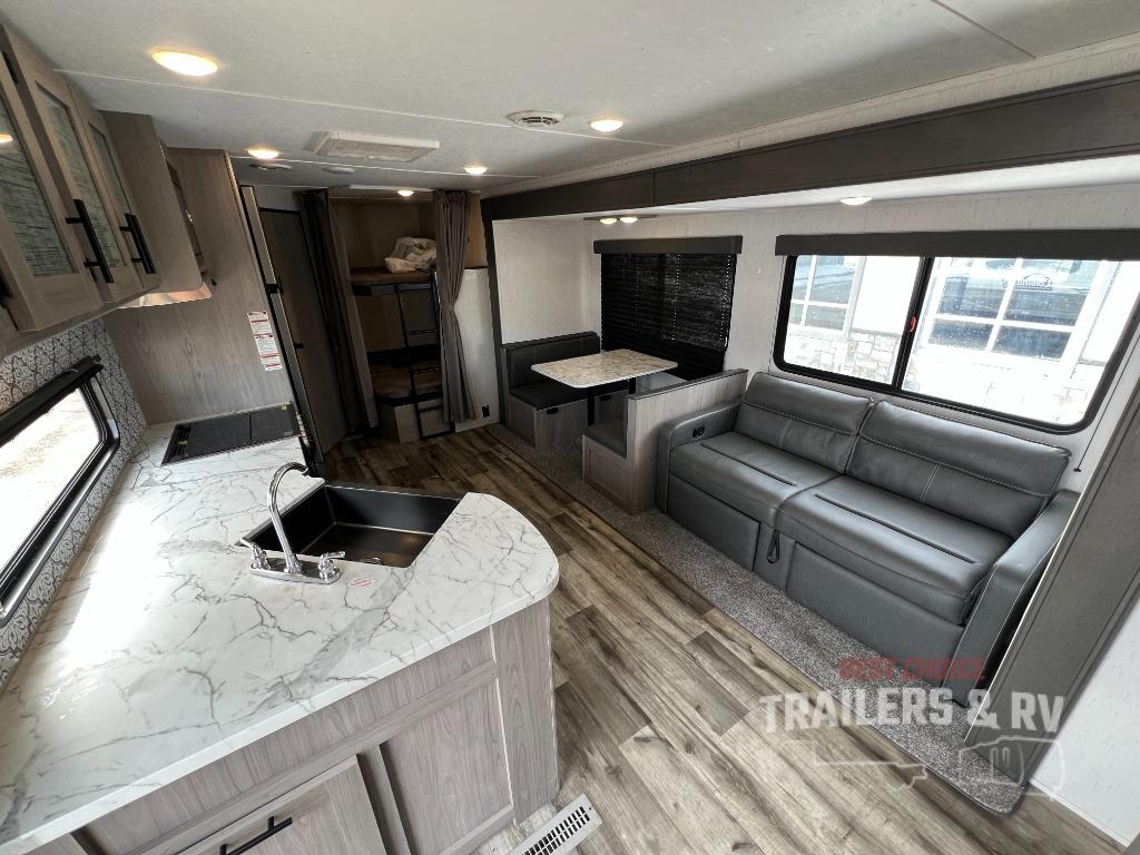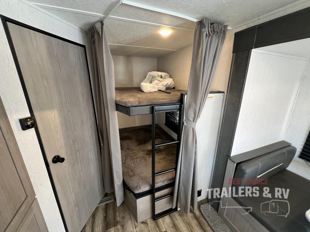 This Coleman Lantern Series travel trailer will provide you and your family with comfort and convenience while you enjoy the great outdoors. You might even meet other RV owners to camp with as well. From having your own private bedroom with wardrobe space and USB power outlet to your kids having double-size bunks, you will not be missing home at all. The cook can make meals while the others take turns getting ready in the full bathroom, and the second exterior entry door into the bathroom is a huge convenience for many reasons. Make this model yours today!
