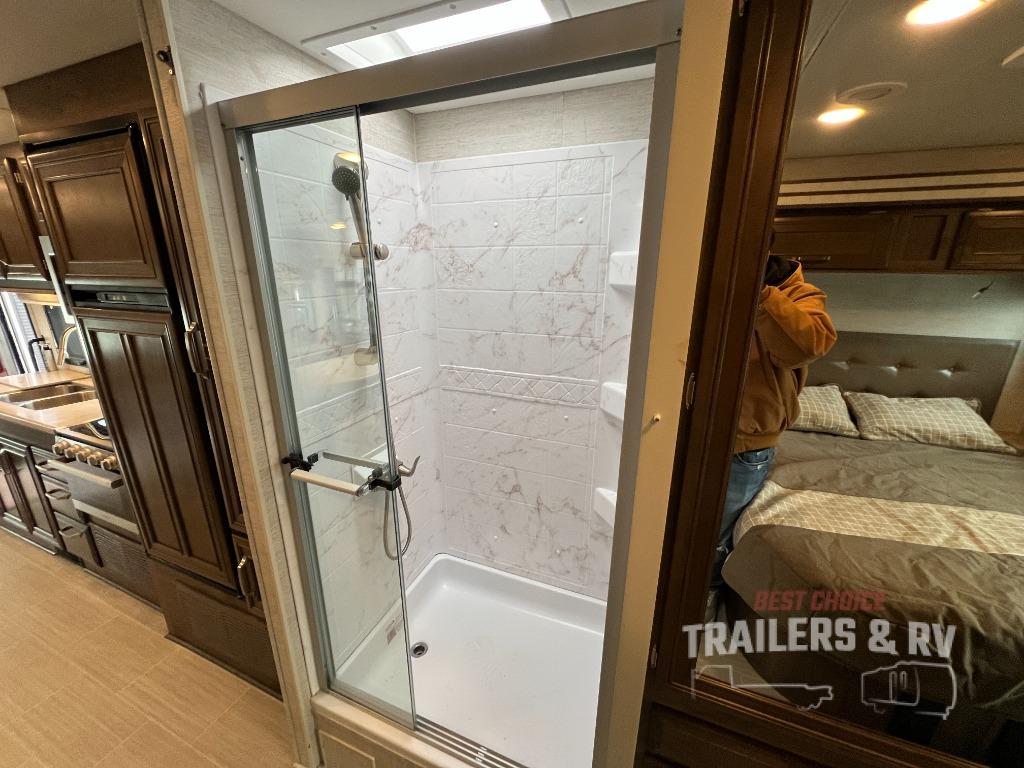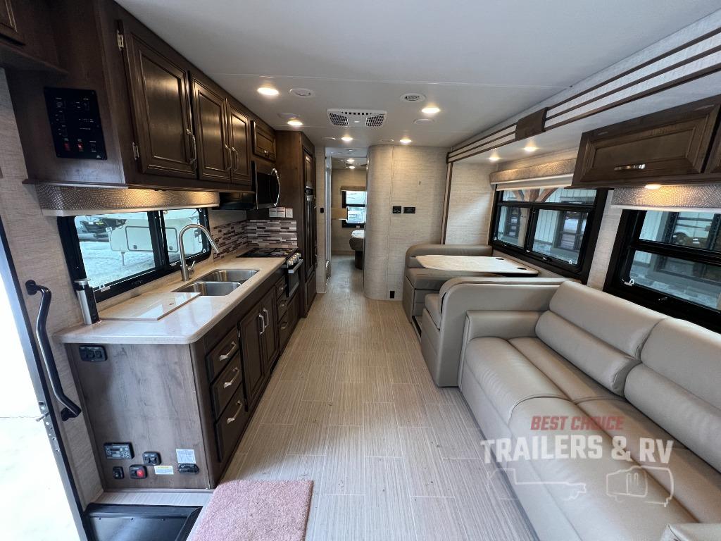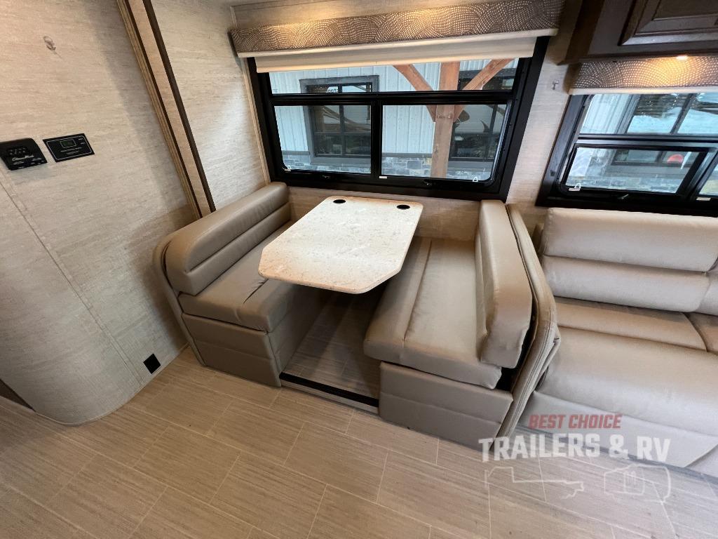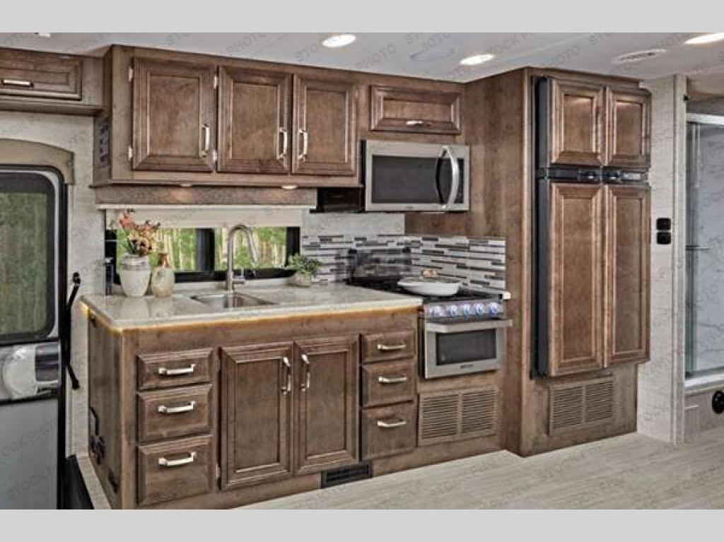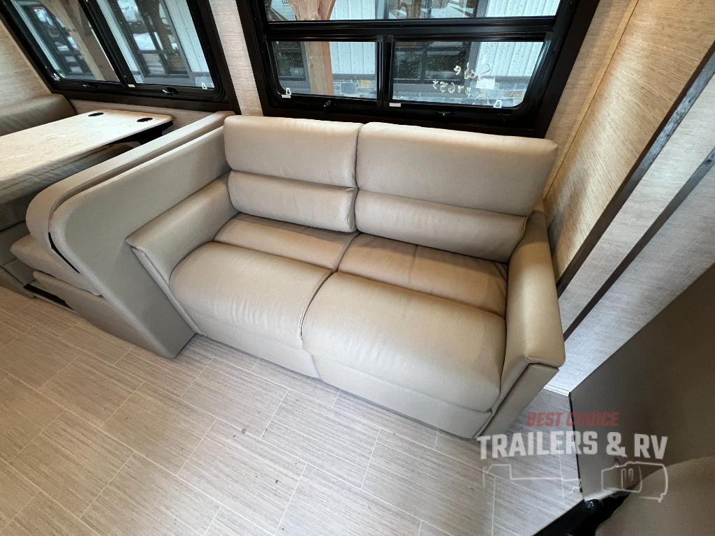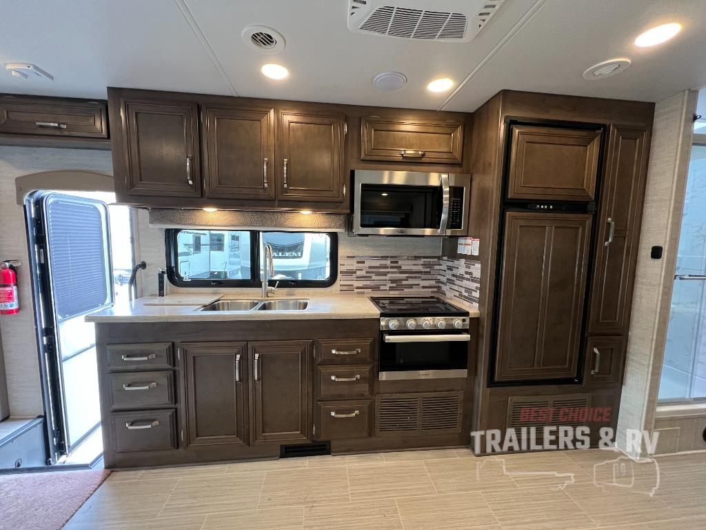 Entegra Coach Esteem Class C gas motorhome is equipped with E-Z Drive Elite offering a powerful blend of precise handling and renowned stability. The chassis also provides automatic hydraulic leveling jacks for easy setup, a tire pressure monitoring system for safety on the road, and a 7,500 lb. hitch for towing. The fully custom-molded ABS surround in the cab-over area with overhead bunk, the panoramic window for scenic views and the power shade when you have enough lighting, are all impressive features you will enjoy. The interior offers a 7-foot ceiling height, hardwood cabinet doors and drawers with ball-bearing drawer guides, blackout night roller shades, residential kitchen amenities, and much more! Get out and roam in your favorite Esteem today!