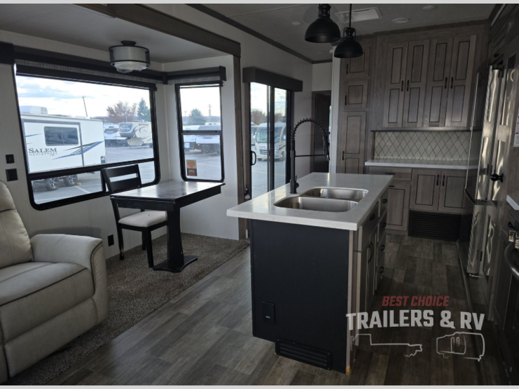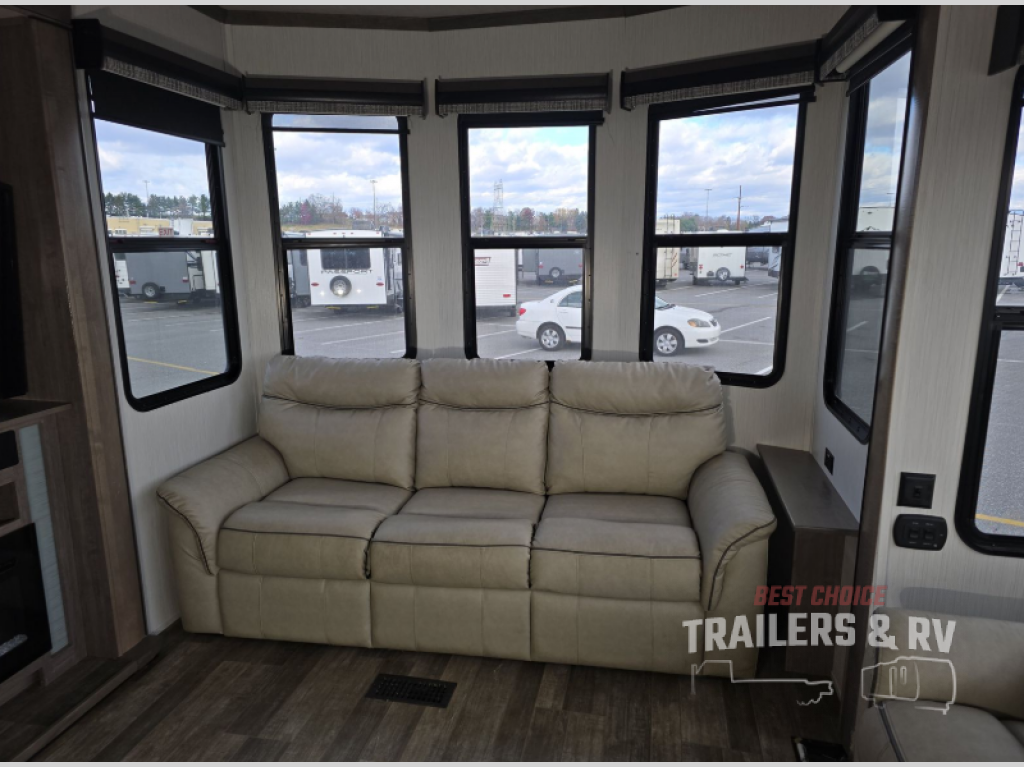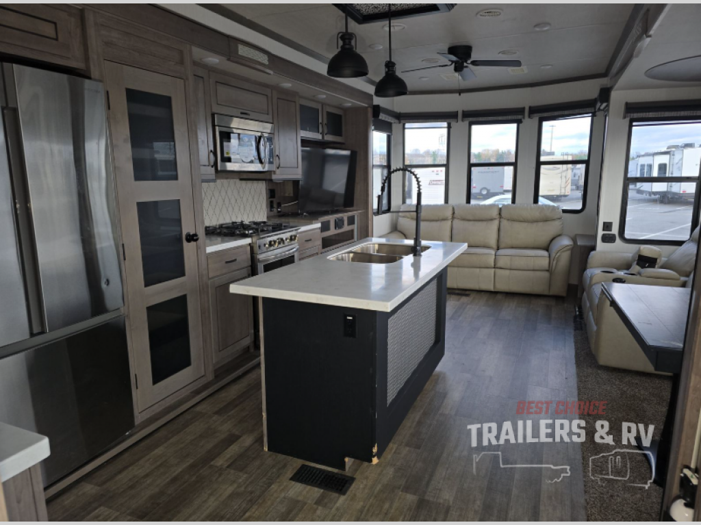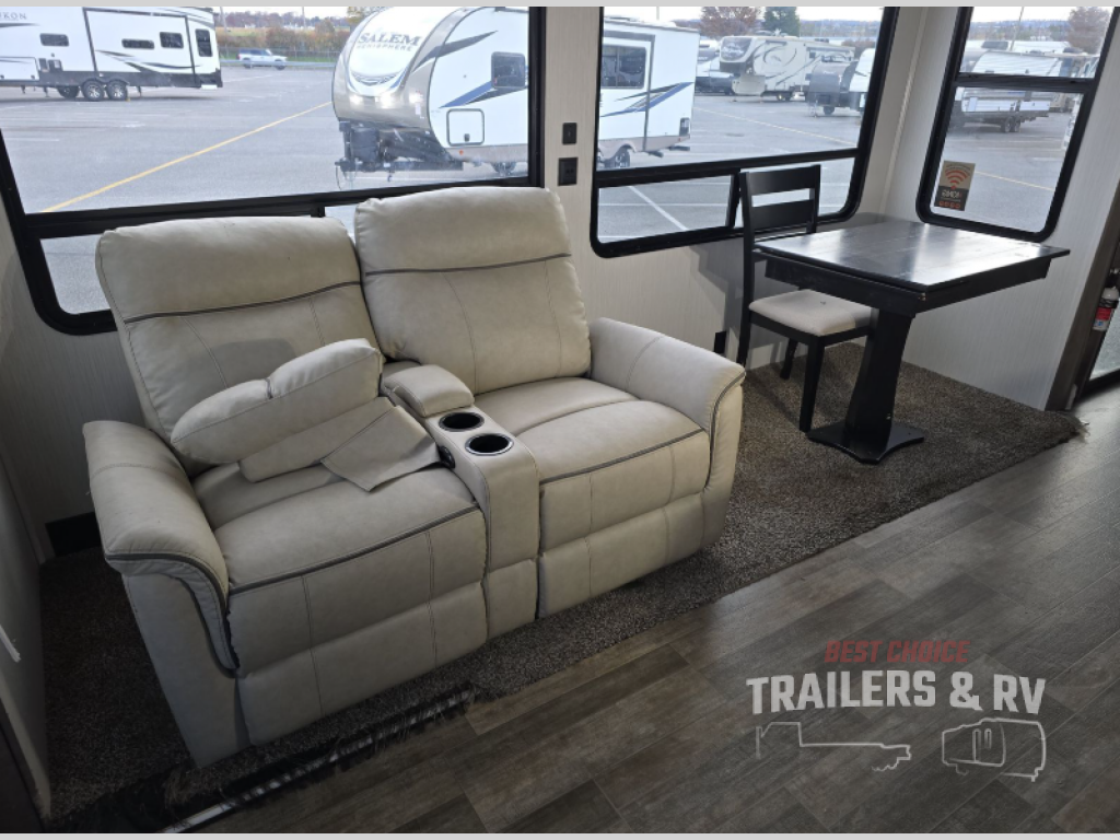 Your wait is over, this destination trailer is ready for your next stay! As you enter you will feel the comfort and spaciousness of the combined kitchen and living area with dual slide outs, and you can relax on the hide-a-bed sofa up front, the power theater seats or eat a snack at the free-standing dinette. You can enjoy the outdoors inside through the full view windows, and will have residential style throughout, plus full amenities in the kitchen. The rear master bedroom offers you a king bed slide, a dresser, a wardrobe and a closet prepped for a washer/dryer option as well as the second entry so you can get outside quickly to relax under the 18' electric awning. You will find so many more features to enjoy, plus there are several options you might like to add to enhance this already amazing destination trailer.