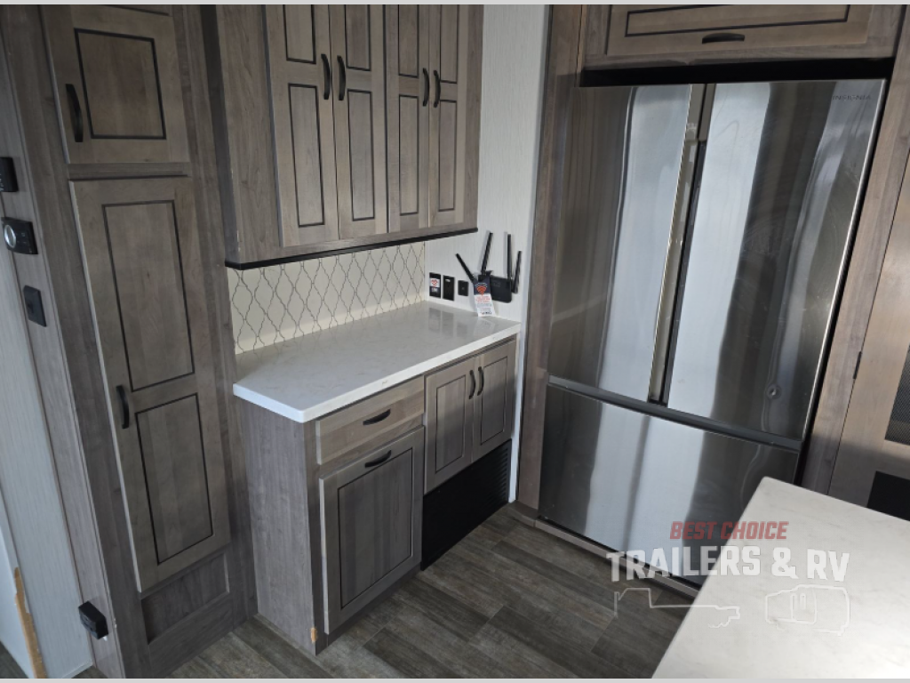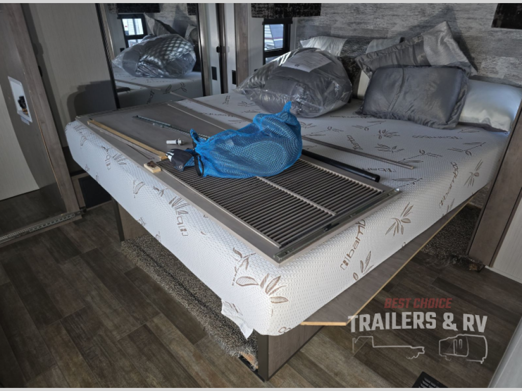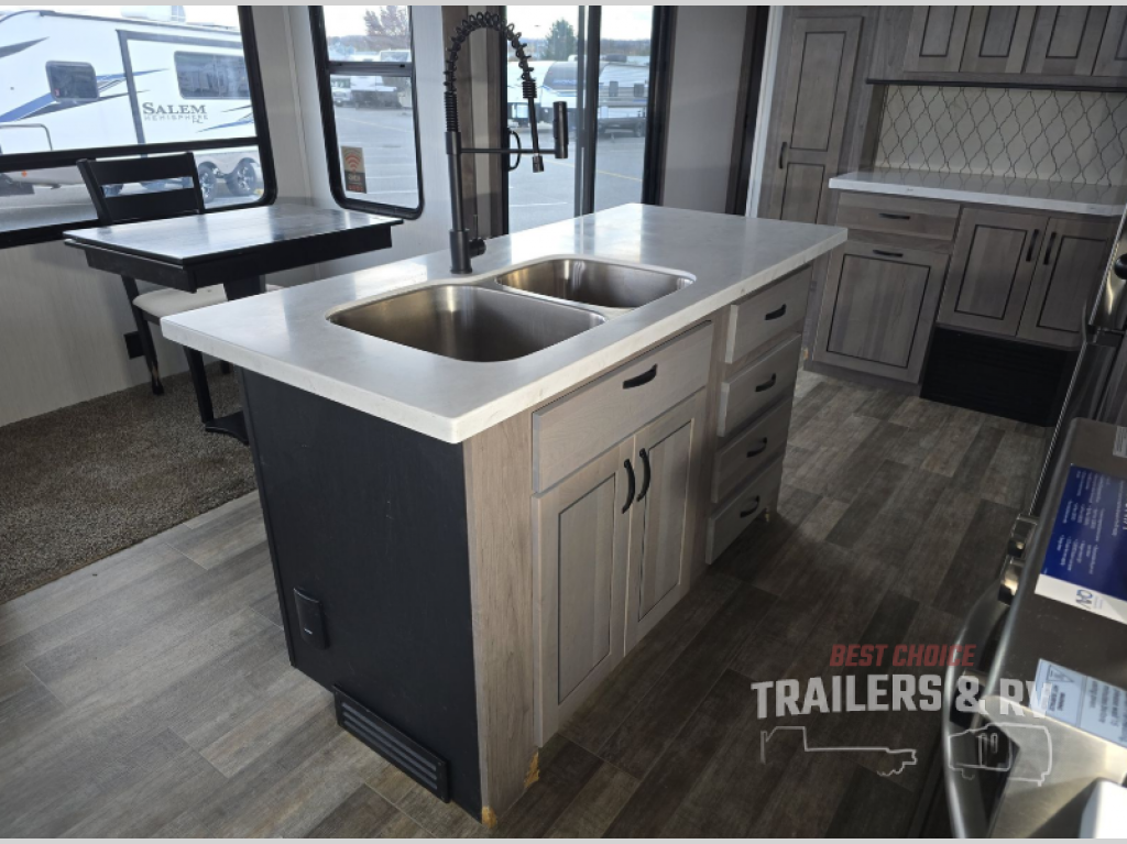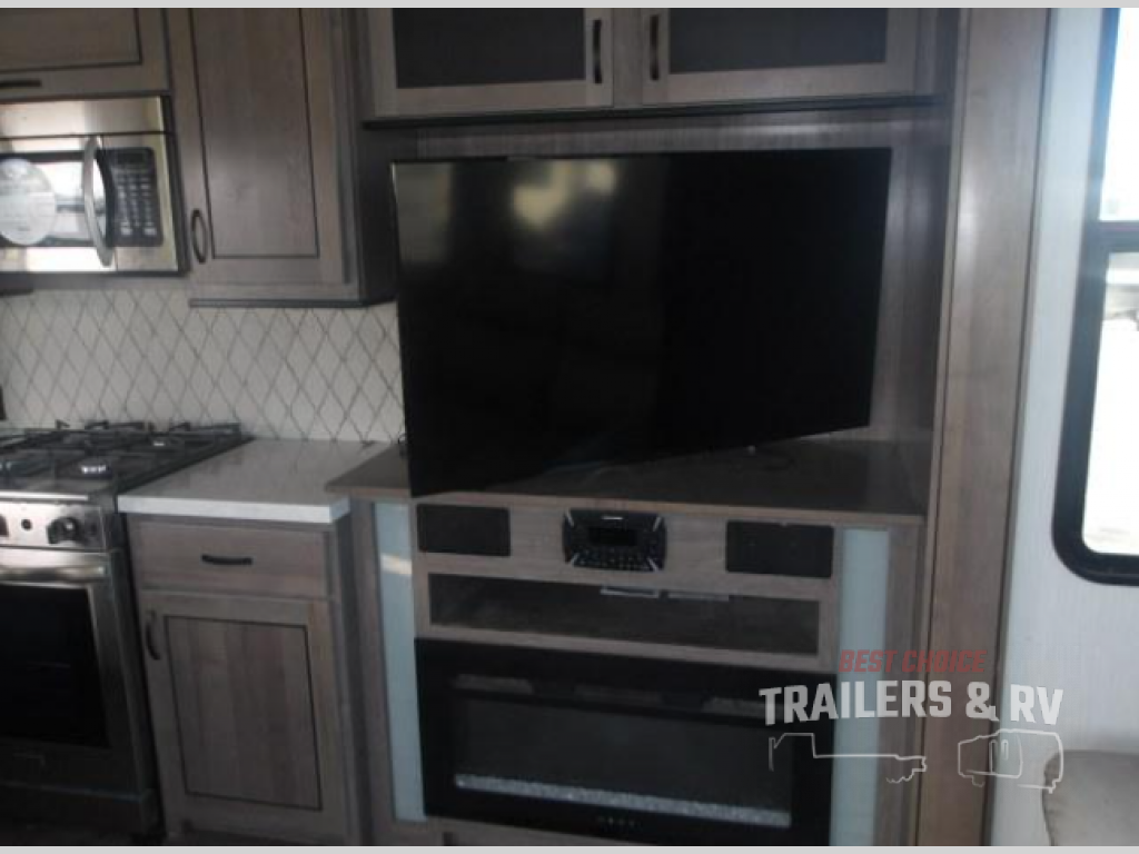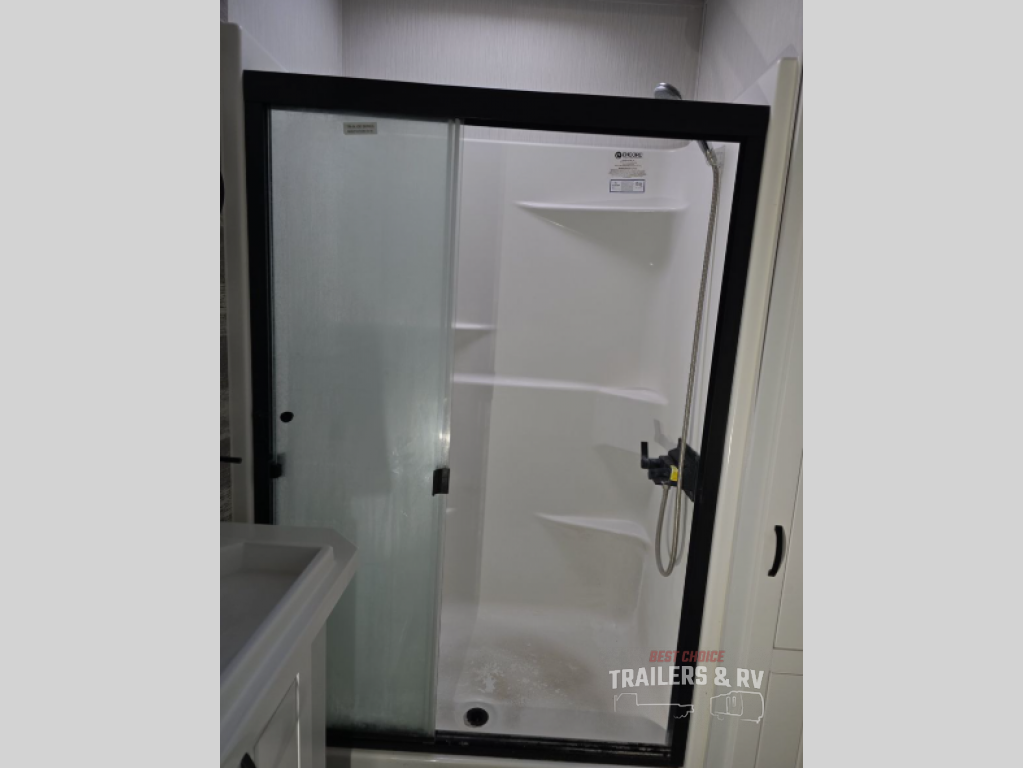 Your wait is over, this destination trailer is ready for your next stay! As you enter you will feel the comfort and spaciousness of the combined kitchen and living area with dual slide outs, and you can relax on the hide-a-bed sofa up front, the power theater seats or eat a snack at the free-standing dinette. You can enjoy the outdoors inside through the full view windows, and will have residential style throughout, plus full amenities in the kitchen. The rear master bedroom offers you a king bed slide, a dresser, a wardrobe and a closet prepped for a washer/dryer option as well as the second entry so you can get outside quickly to relax under the 18' electric awning. You will find so many more features to enjoy, plus there are several options you might like to add to enhance this already amazing destination trailer.
