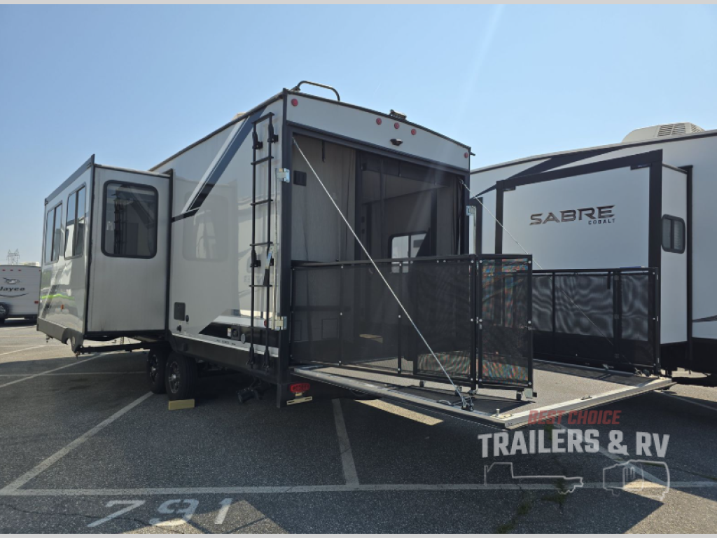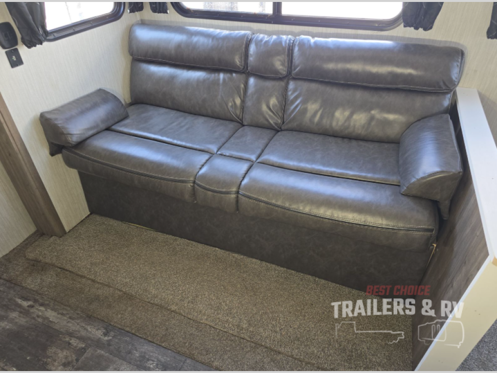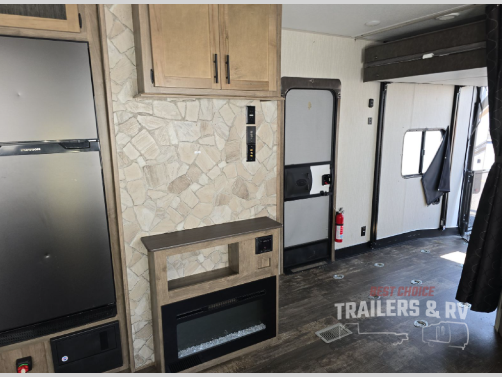 Load up the kids or invite your neighbors and head out on adventure in this toy hauler that can comfortably sleep eight people each night. When the Happijac beds are not in use, you will have garage space to store your kayaks or dirt bike. Within the large slide you will find the jack knife sofa and booth dinette that will be perfect for relaxing, game night, and additional sleeping space, and the fireplace will make it feel more like home. The chef of your group will have their choice to cook indoors or outdoors on the outside kitchen, and there is a 15' power awning for shade. This model also includes a front private bedroom with a Wolf Pack king bed, dual night stands, and dual wardrobes for all your clothes!