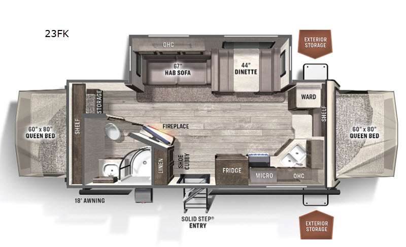 Your search for the perfect expandable is over with this spacious unit! The two queen tent end beds provide comfortable sleeping space each night, and there is additional sleeping space on the hide-a-bed sofa and dinette. You will love the fireplace and LED TV in perfect view of the seating, and the spacious full bath will allow everyone space to clean up each day. Don't worry about leaving any of your valuables behind since this model includes plenty of storage, including overhead shelves, a wardrobe, plus convenient shoe storage!