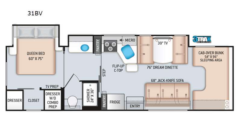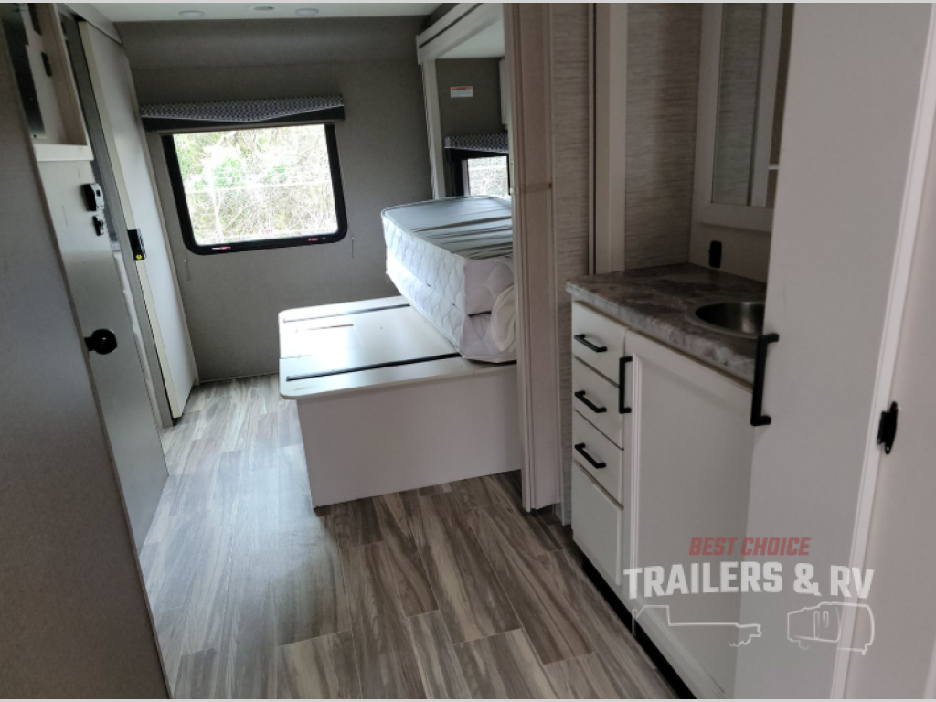 When the open road starts calling your name, you need this Four Winds model 31BV. After you've reached your destination, you'll find comfortable seating space on the jackknife sofa or at the Dream Dinette. The chef of the family can prepare lunch on the recessed three burner cooktop/oven or use the 30" over-the-range microwave oven. This model includes a private toilet and 24" x 36" shower area with the sink just across the hall so two people can freshen up at once. The rear private bedroom will feel just like home with its RV queen bed and a walk-in closet with a dresser. There is even a space to add an optional washer and dryer if you choose.