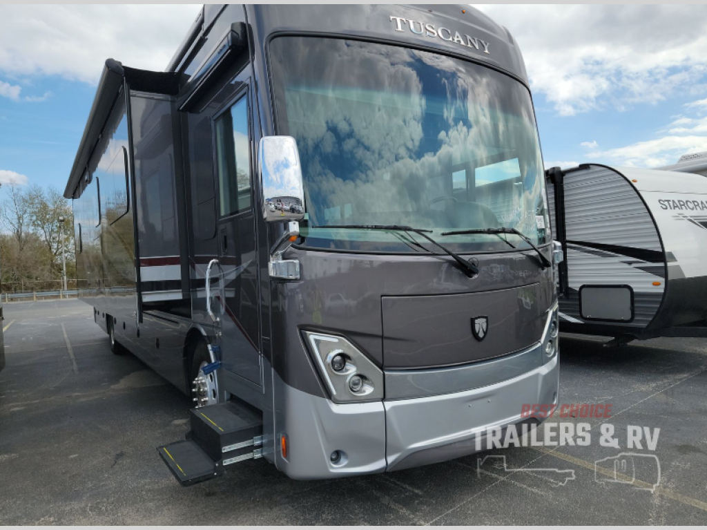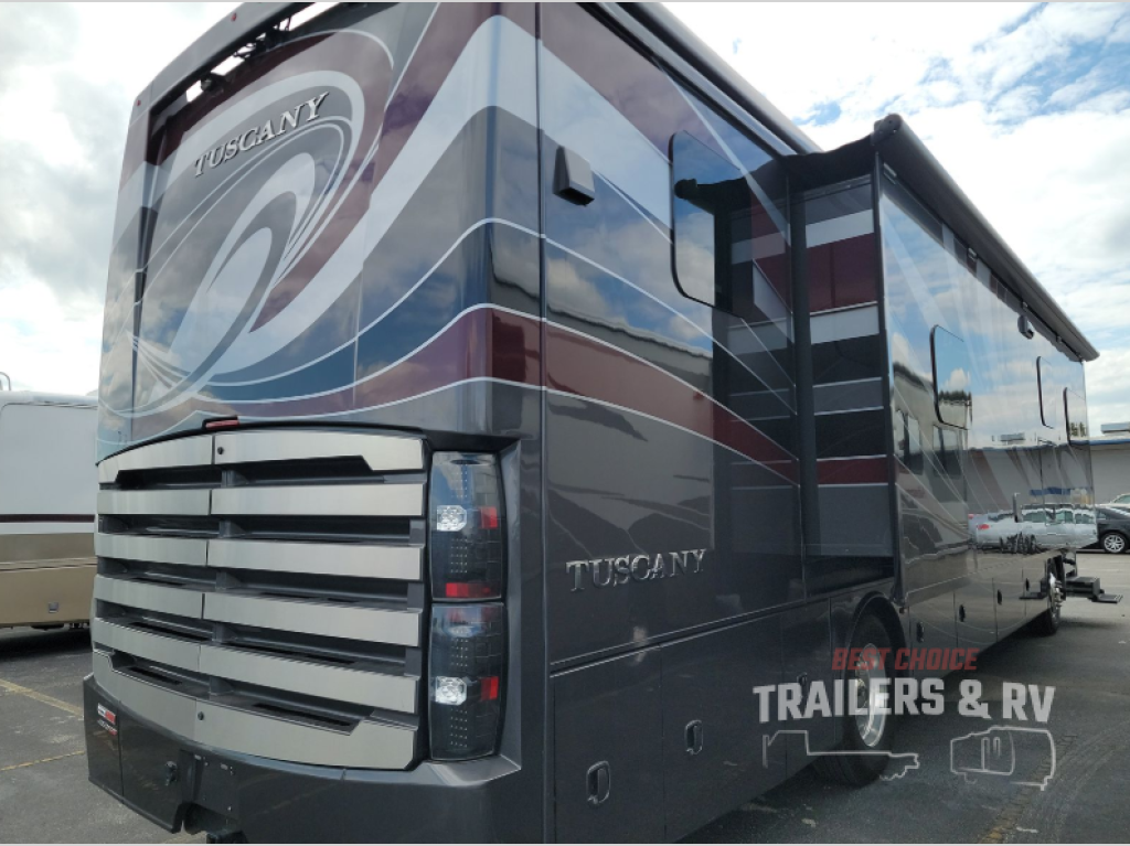 This Tuscany Class A diesel motorhome will impress you and your friends! From the decorative ceiling treatment with mood lighting and seven-foot ceilings to the stainless steel steel residential French door refrigerator with in-door ice and water dispenser, the stainless steel over-the-range convection microwave oven, and residential drawer-style dishwasher, you will feel right at home. Watching your favorite programs is easier than ever before with the retractable 55" LED Smart TV and 40" LED TV in the living area, the 32" TV in the bedroom, and the exterior 39" LED TV, and when you're ready to rest for the night, you will find ultimate relaxation while sleeping on the Tilt-a-View inclining king-size bed in the private master suite. And don't forget about having a rear full bathroom complete with a stackable washer/dryer and dual medicine cabinets, plus a half bath for your guests.