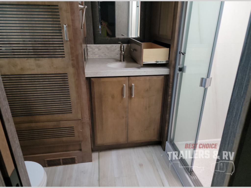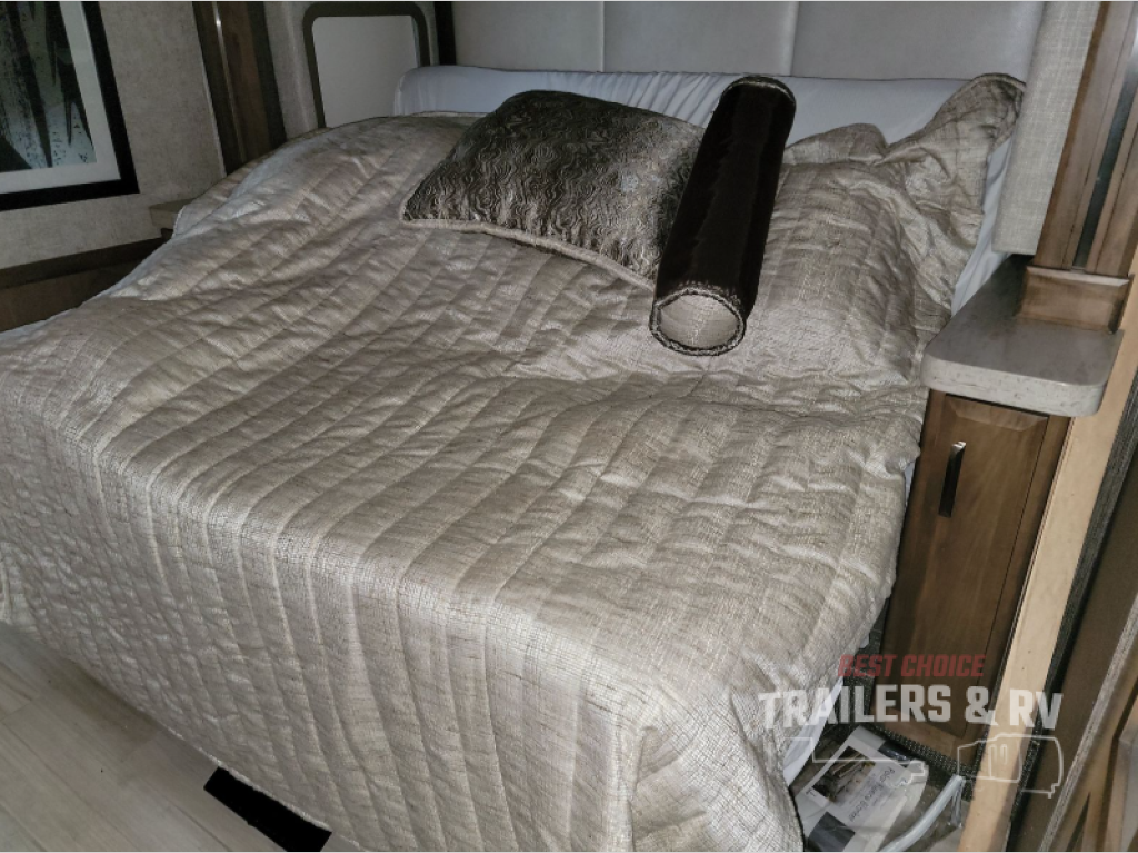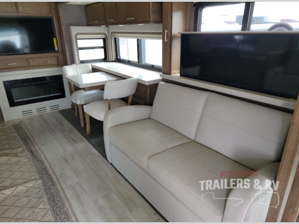 With any Tuscany Class A diesel motorhome by Thor Motor Coach, you will find a finely constructed motorhome with a welded tubular aluminum roof and sidewall cage construction, vacu-bond laminated roof, walls and floor with block foam insulation, and a domed fiberglass roof on a Freightliner XC-R chassis with Atlas Foundation. The VIP tilt/telescoping smart wheel, the 15" touchscreen dash radio with Bluetooth, Garmin RV GPS navigation, and back-up monitor, and the Winegard ConnecT 2.0 WiFi/4G/TV antenna provide the technology that makes traveling safe and easy. The interior offers comfortable furniture, solid-surface countertops, a designer tile backsplash, a residential tile shower with door, plus so much more, so choose a Tuscany today!