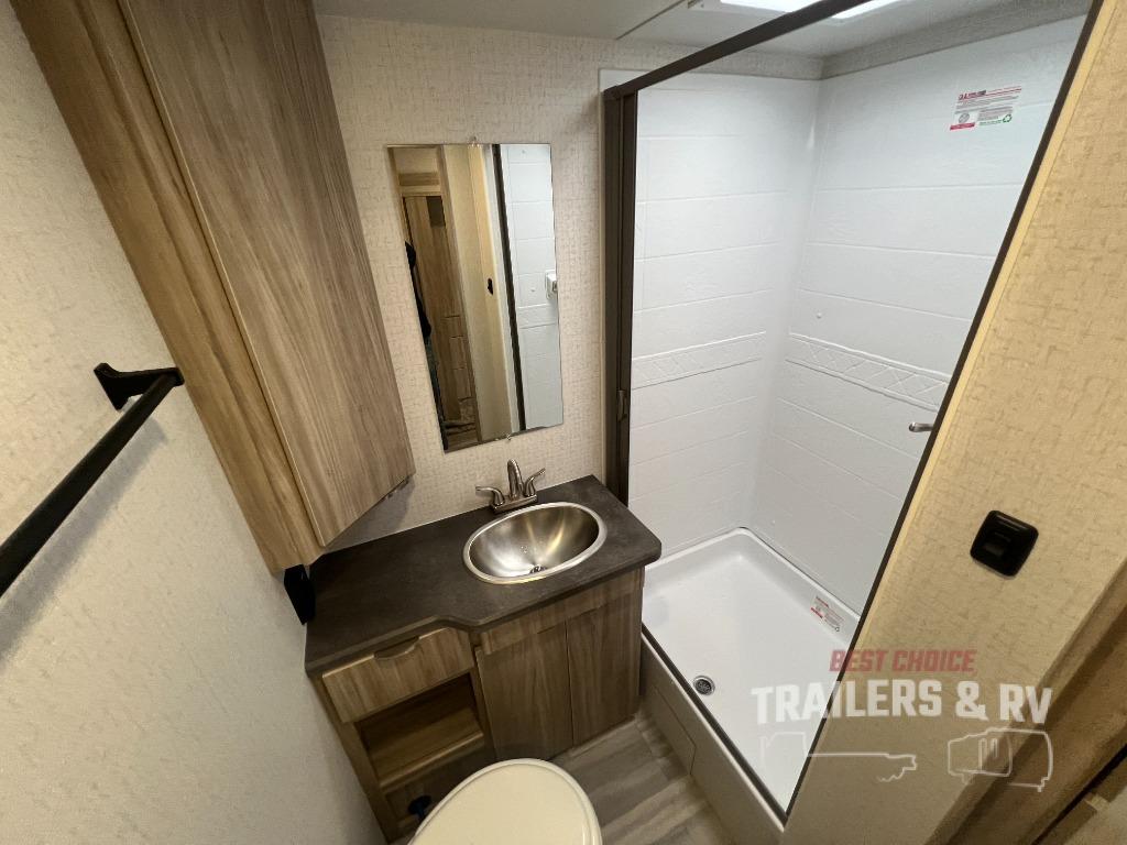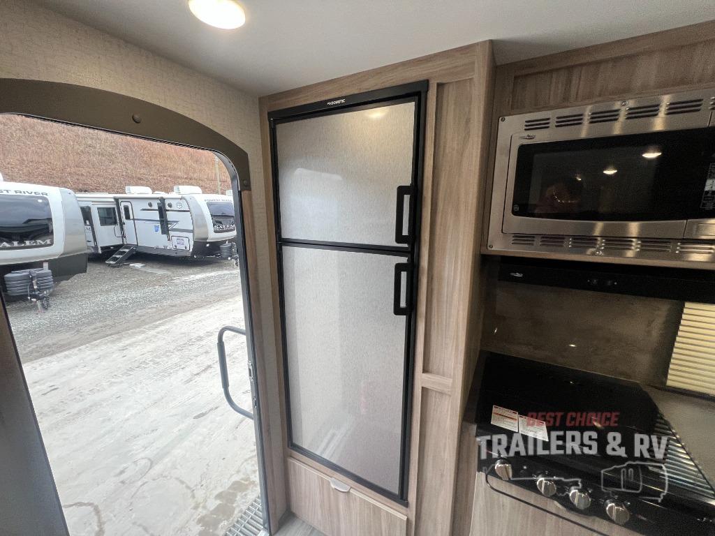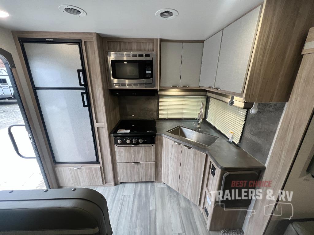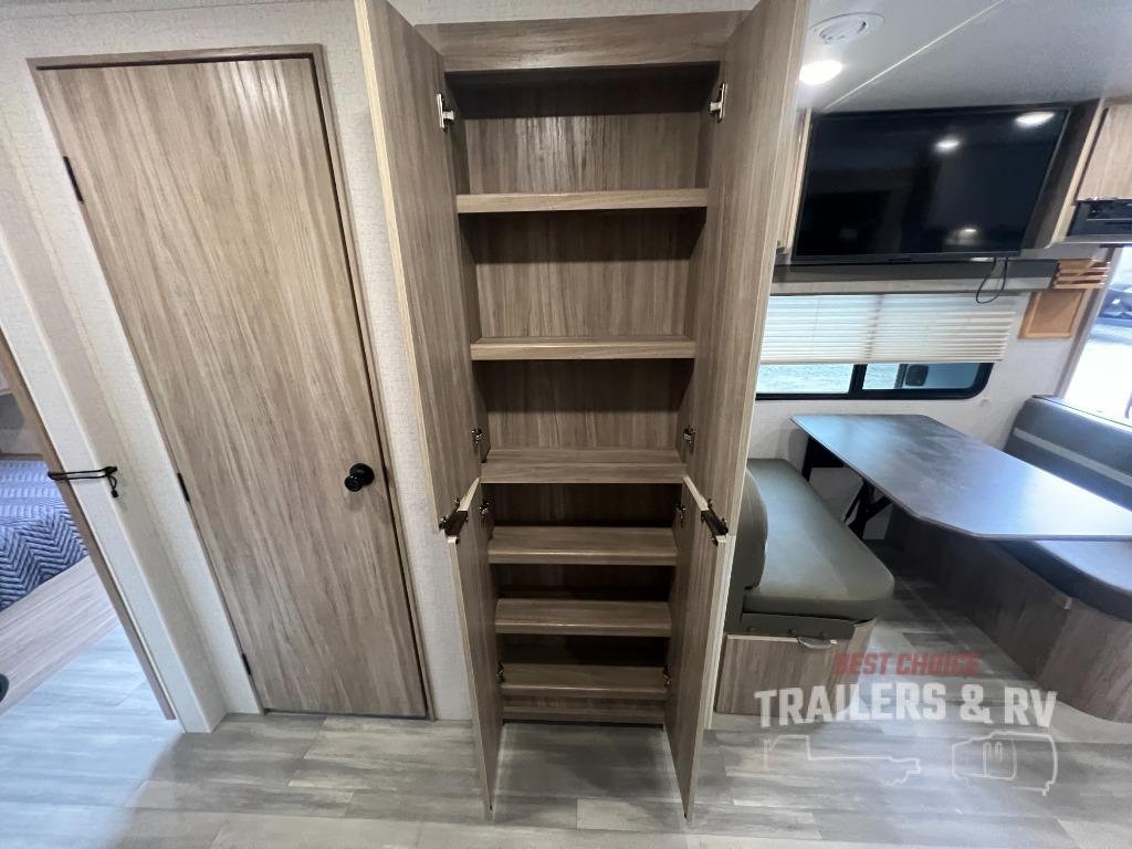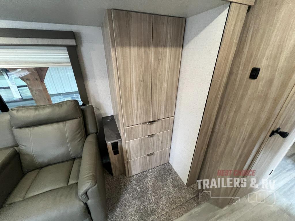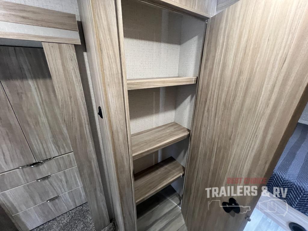 Looking to have sleeping space for your family of five, plus a spacious living area and plenty of storage for everyone's clothing, and enjoy the outdoors just steps away? Look no further, step inside this dual entry trailer for a weekend of memories inside and outside. The rear kitchen allows you to grab a drink from the 10.3 cu. ft. refrigerator or choose the 8 cu. ft. gas/electric option, and a snack from the pantry as you head outside to relax under the power awning with LED lighting. Just grab your camping chairs from the exterior storage. When you have explored outdoors, head back inside to get cleaned up in the full bathroom and fall quickly asleep in your own private bedroom with a sliding door that saves on space. The walk-around queen bed and second exterior entry plus dual wardrobes can be your retreat as the kiddos sleep on the furniture in the main living area.