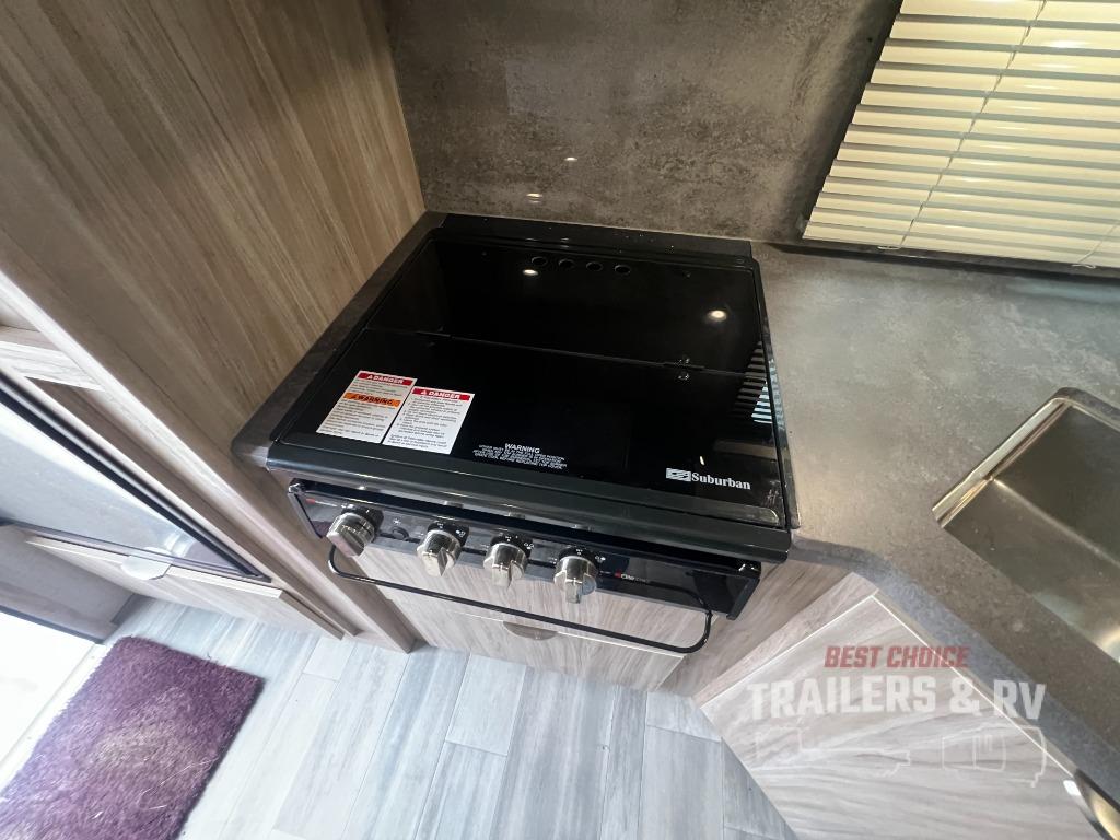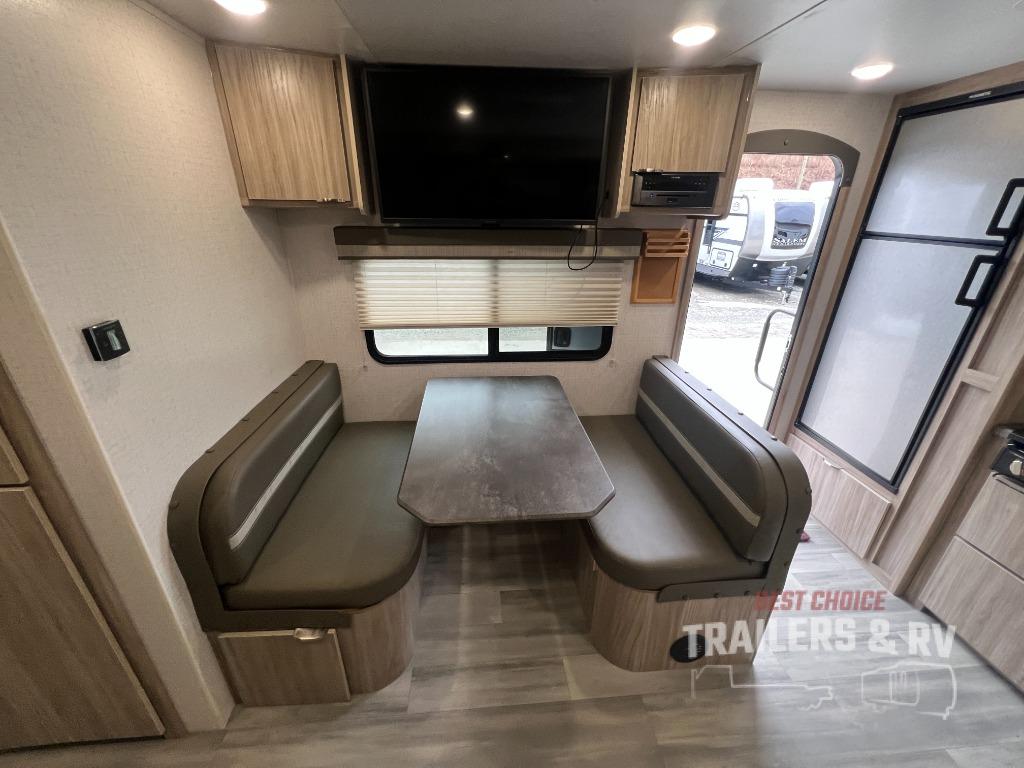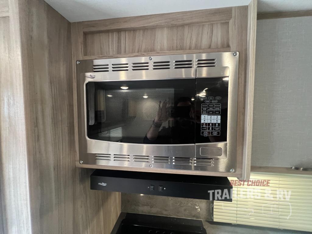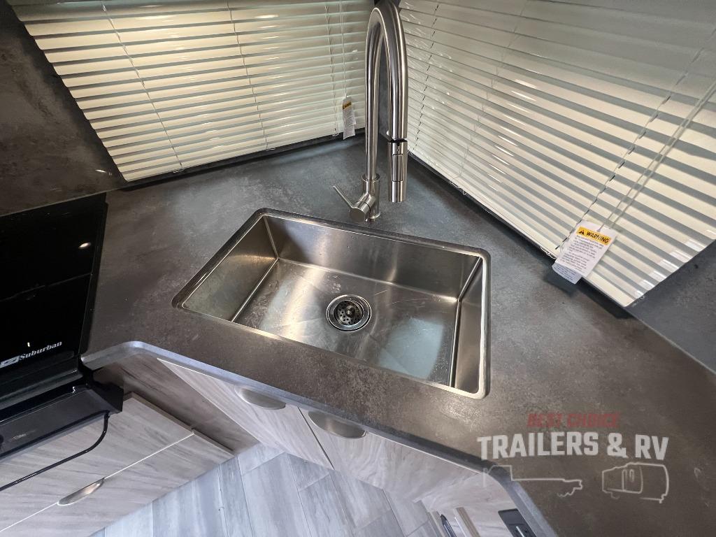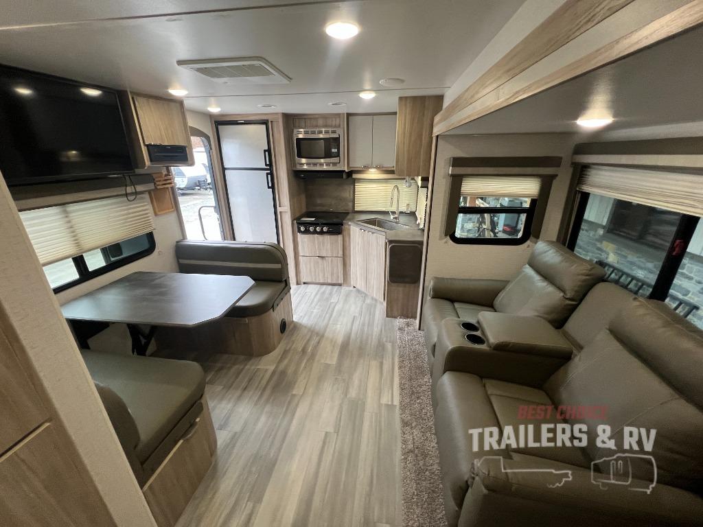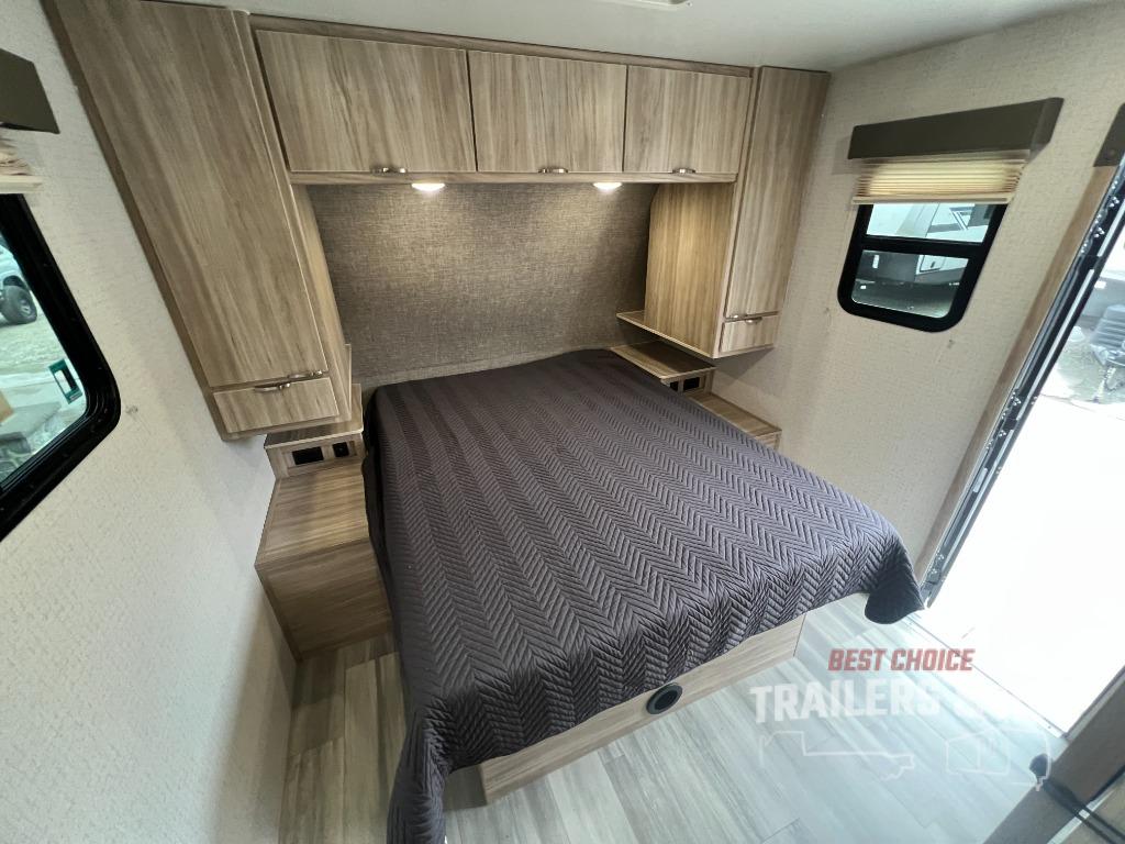 Looking to have sleeping space for your family of five, plus a spacious living area and plenty of storage for everyone's clothing, and enjoy the outdoors just steps away? Look no further, step inside this dual entry trailer for a weekend of memories inside and outside. The rear kitchen allows you to grab a drink from the 10.3 cu. ft. refrigerator or choose the 8 cu. ft. gas/electric option, and a snack from the pantry as you head outside to relax under the power awning with LED lighting. Just grab your camping chairs from the exterior storage. When you have explored outdoors, head back inside to get cleaned up in the full bathroom and fall quickly asleep in your own private bedroom with a sliding door that saves on space. The walk-around queen bed and second exterior entry plus dual wardrobes can be your retreat as the kiddos sleep on the furniture in the main living area.