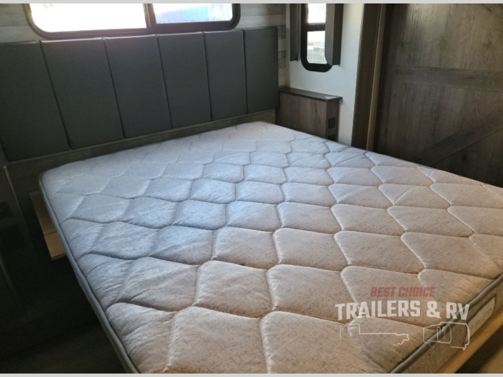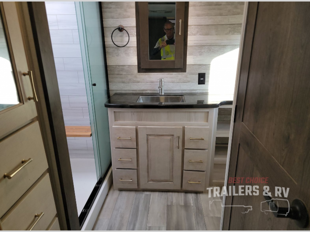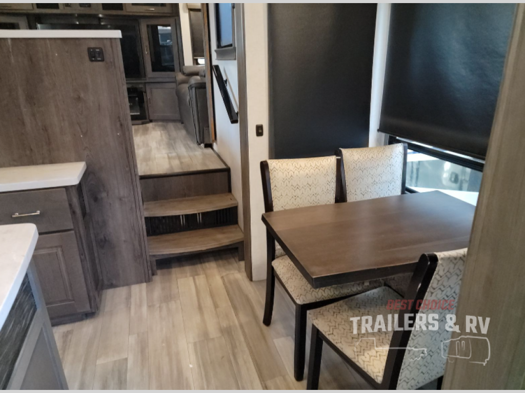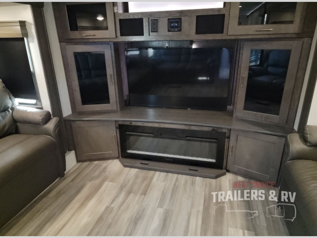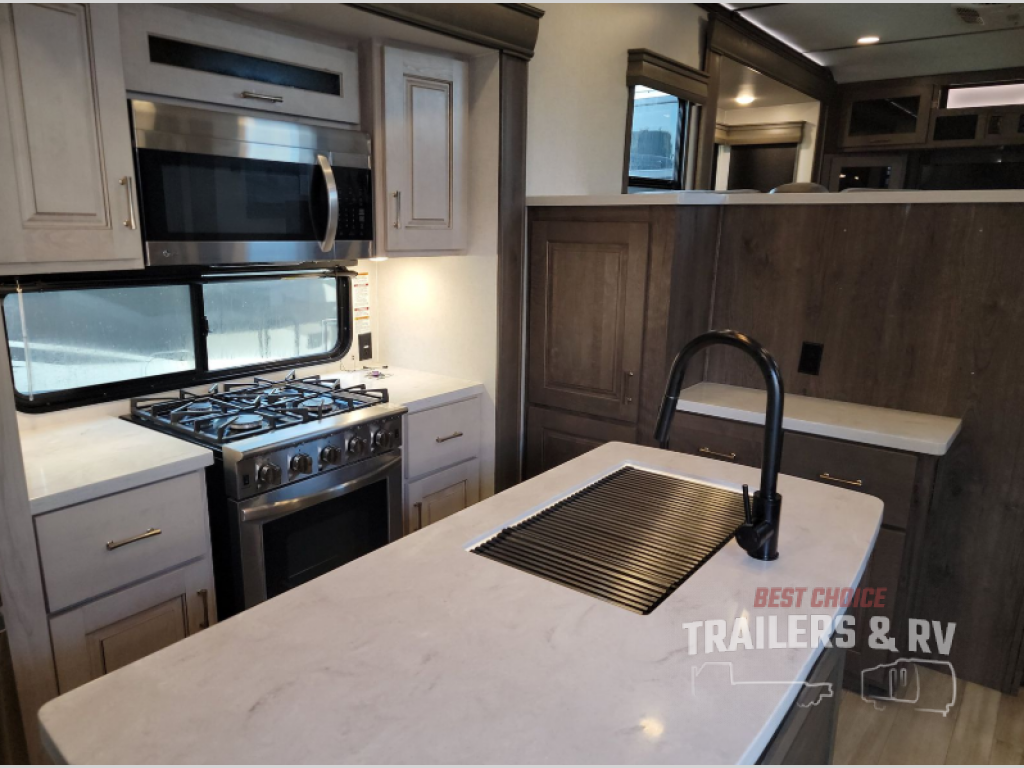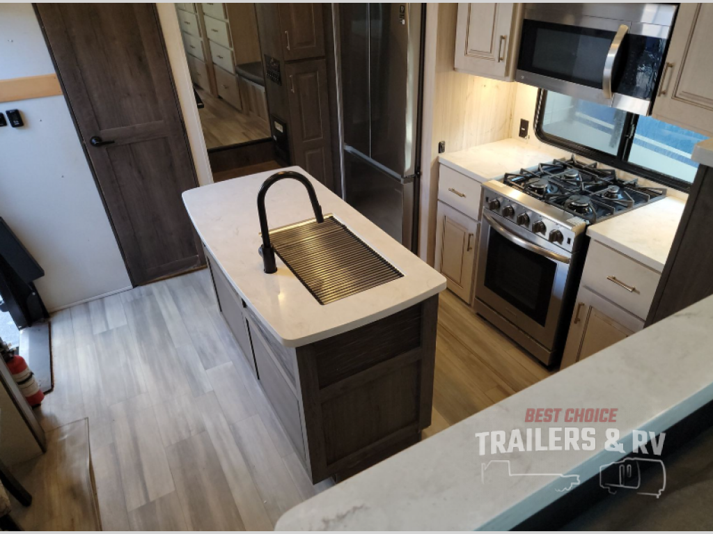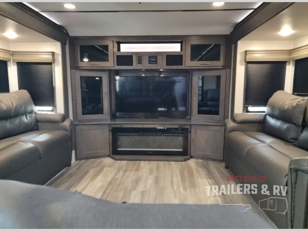 An active family will want this fifth wheel with its exterior basement pull-out tray that measures at 48" x 115" to load up your kayaks and such. Just above this area is the master suite with a rear bathroom that offers a residential shower, a porcelain toilet with soft close seat, plus a wardrobe and shelf storage. The king bed slide gives you more floor space, and you will have a seat, a flip-top dresser, and a Smart TV to watch. The half bath is next to the main entry which is super convenient, and the middle kitchen is separate from the front living area. The cook will love the residential microwave, range and oven, plus the option to add a residential refrigerator, plus the pantry, and the extra counter space on the kitchen island with a stainless steel farm sink. And the views out of the atrium windows in the slide out which includes the floating dinette table are a must see. And when you need to watch the big game, the 55" Smart TV with pull-out fireplace below are up front with the dual recliner love seat and two sleeper sofas.