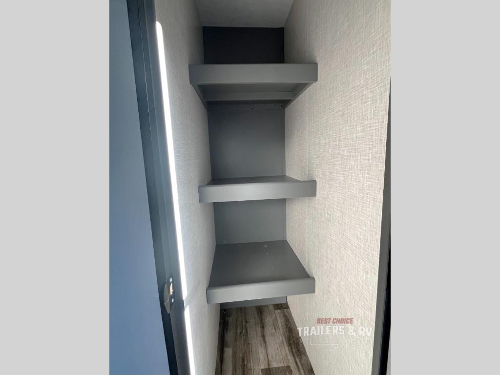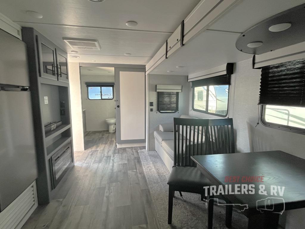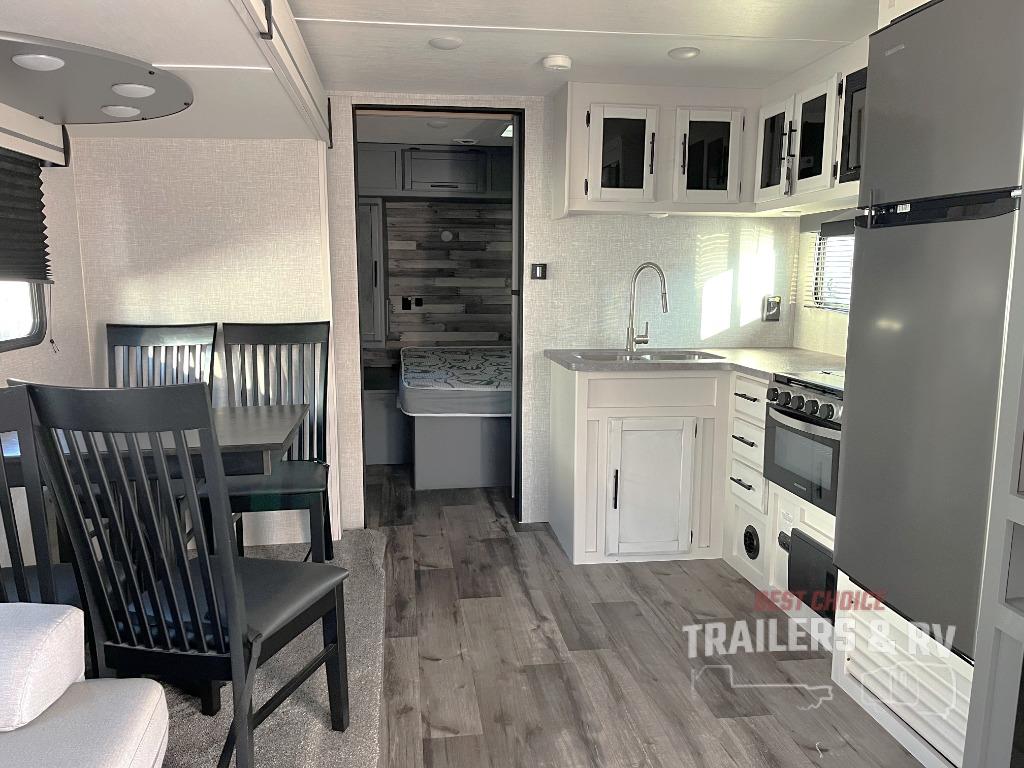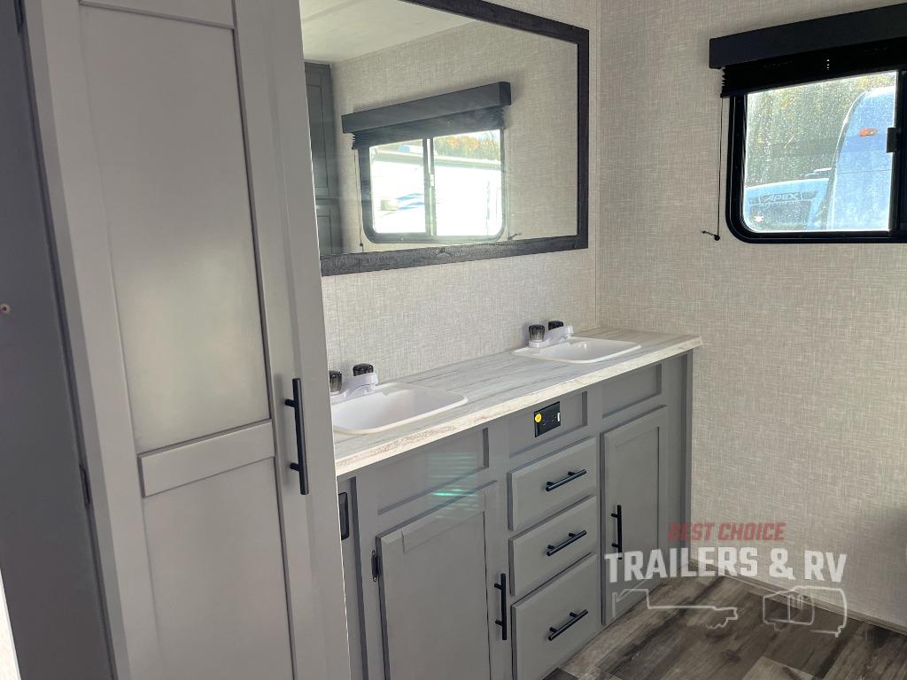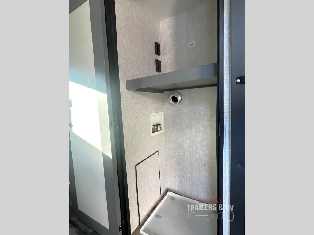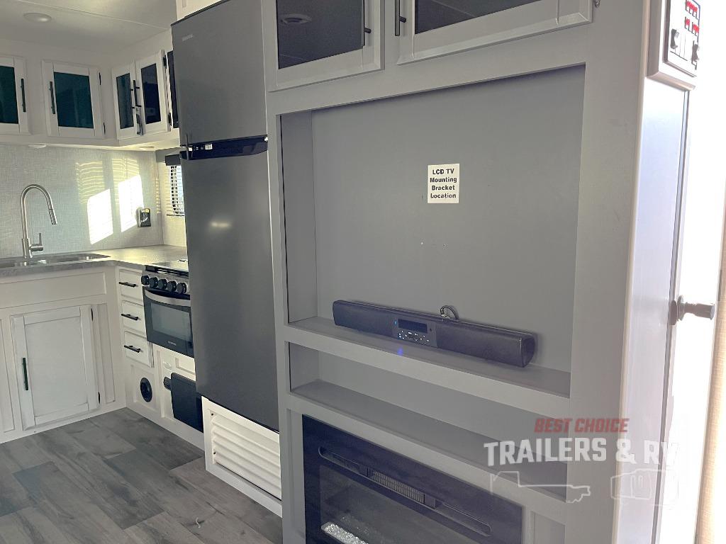 One look at this dual entry travel trailer and you will fall in love. The little ones can play with the dog on the floor thanks to the extra interior space provided by the large slide out. Here, your group can dine around the U-shaped dinette and relax on the 60" jackknife sofa, and the fireplace will give that special touch-of-home. The spacious full rear bath features a 30" x 36" shower, dual bath sinks, plus a closet that has been prepped to add an optional washer and dryer if you choose. Head to the front private bedroom where you can hang your clothes in the dual shirt closets, and get a great night's rest on the king bed. You even have your own exterior entrance door so that you can sneak out to your lawn chairs after everyone is asleep!