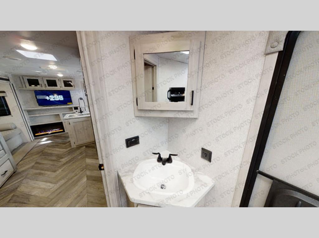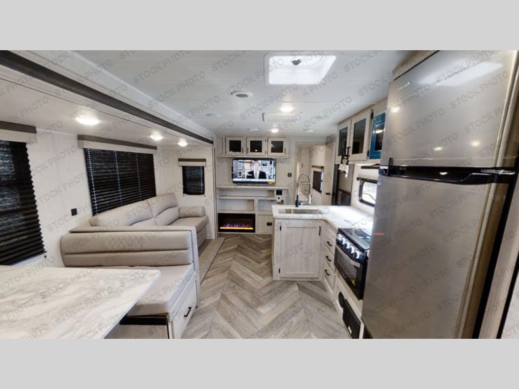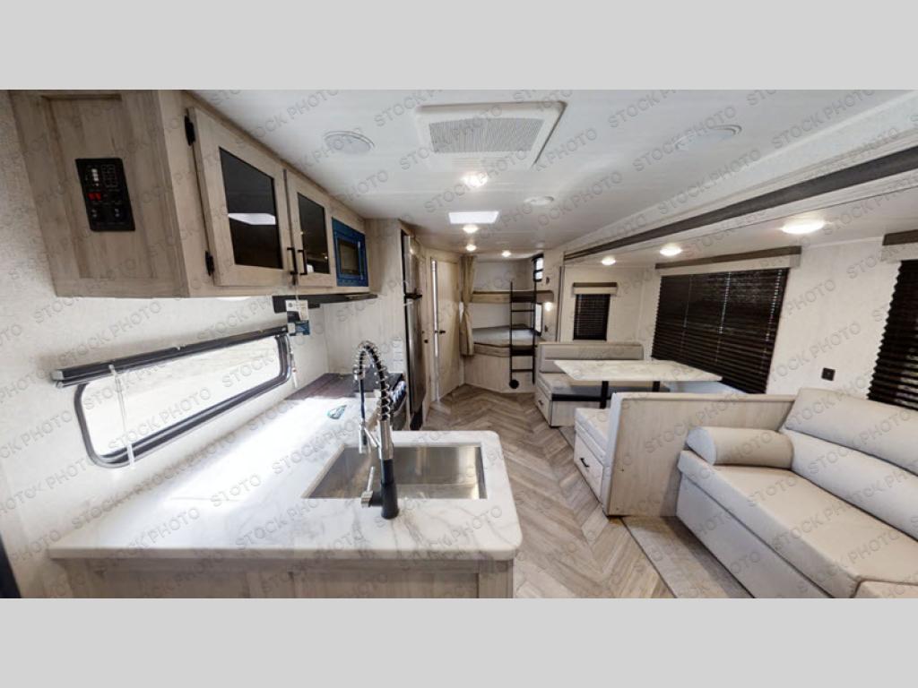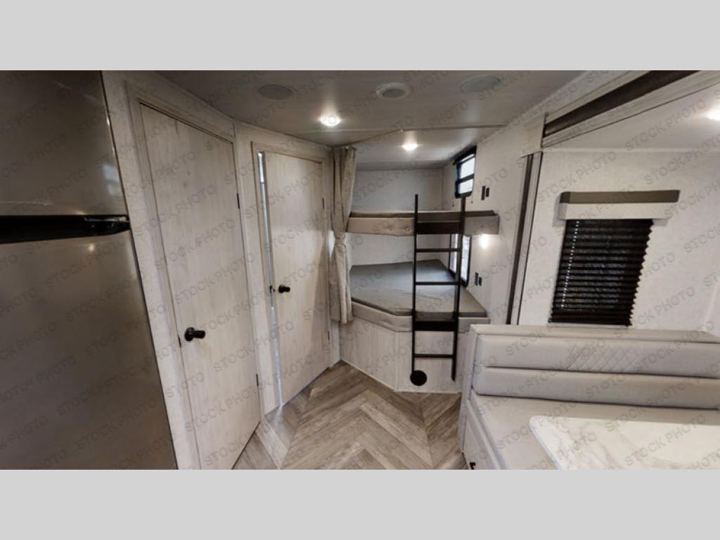 Load up the family, your clothes, gear, food and head out for a fun long-weekend at your local state park! As you easily load through the dual entry doors, you will find lots of storage throughout in the dual wardrobes in the private bedroom, underneath both the oversized booth dinette and jack knife sofa, and within the overhead cabinets and large pantry in the galley kitchen, plus the exterior oversized pass-through storage allows you to bring along the larger items. You will sleep like a king while the family loves sleeping on the double-size bunks and furniture once easily setup for nighttime. You have several more conveniences such as a second entry door into the full bathroom, a ladder for the bunks, a fireplace underneath the entertainment center and the option to add an outdoor kitchen.
