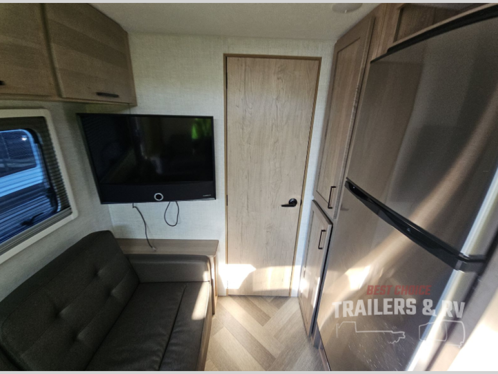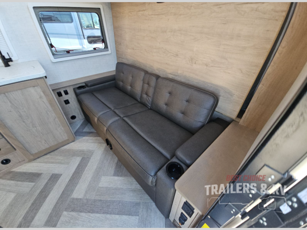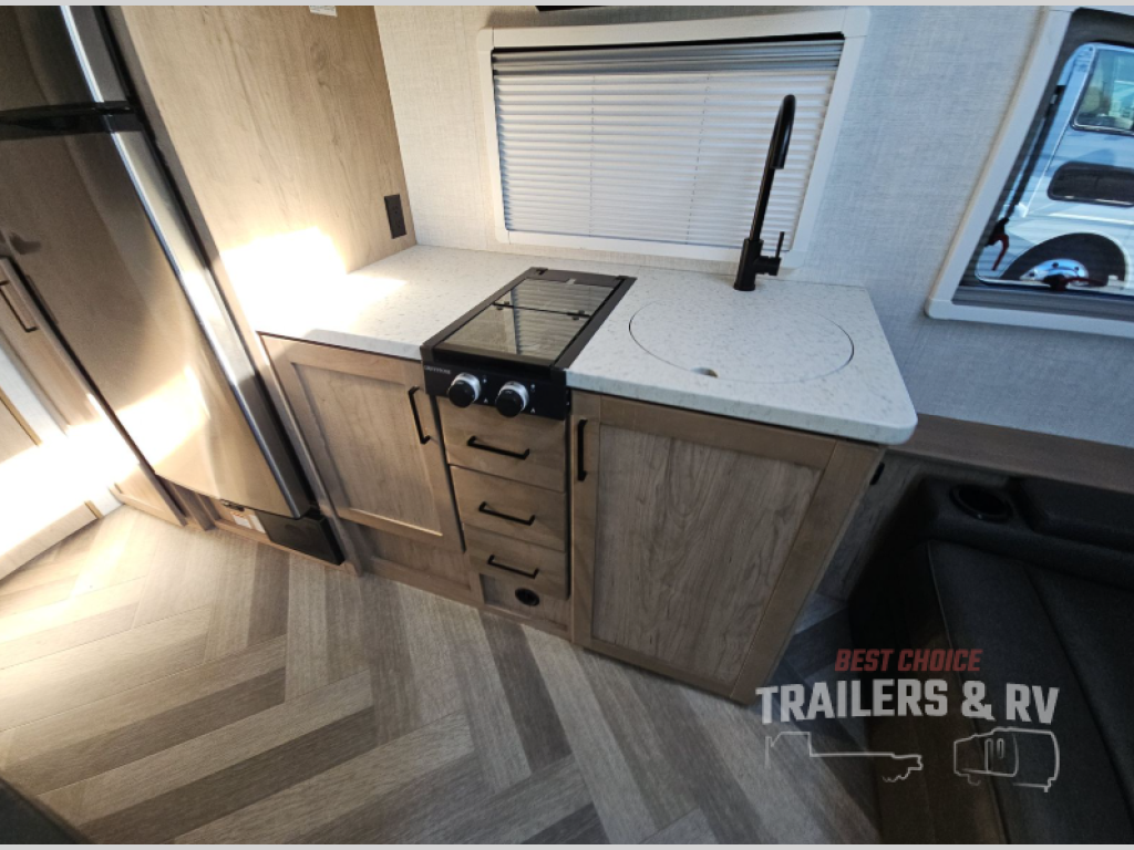 Go off-grid camping in comfort with this travel trailer! It features a full rear bathroom with a 24" x 40" shower to clean up in after a day of exploring and there is a wardrobe/linen closet to keep your towels close by as well. You can prepare your best meals with the two burner cooktop and 8 cu. ft. refrigerator, then enjoy them at the jackknife sofa with a removable table which is across from a 12V HDTV/AV system with a hidden wardrobe behind it. Store all of your outdoor gear in the exterior pass-through storage areas and stay protected by the 12' electric awning with dimmable LED light while you cook at the outside kitchen which has a 1.6 cu. ft. refrigerator and an optional griddle. When you're ready to wind down your nights, lay down on the front 60" x 80" Murphy bed and admire the beautiful stars through the "Stargazer" skylight!