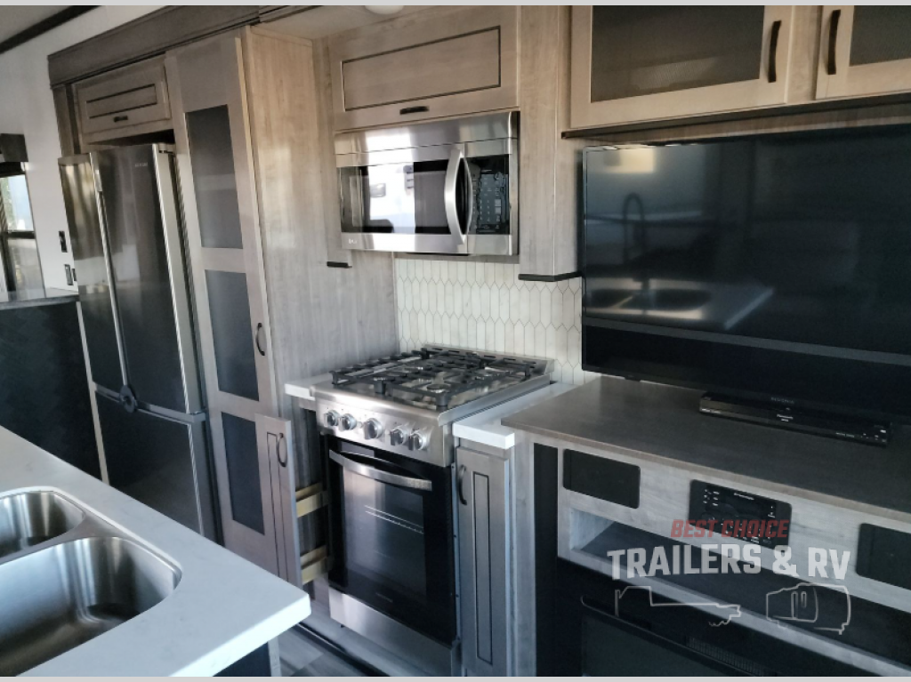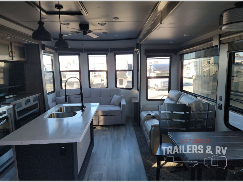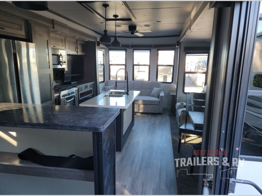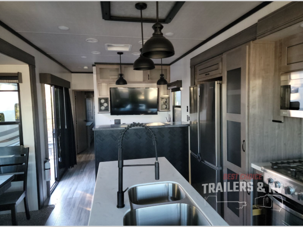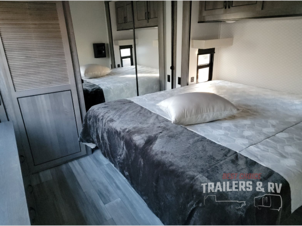 This Cedar Creek Cottage destination trailer will be the perfect entertaining companion! There is a wet bar with peninsula countertop, sink, and mini refrigerator that you can use to serve drinks to your friends when they stop by. The opposing slides at the front will give you plenty of room to work around the kitchen island or rest in the power theater seats and hide-a-bed sofa. The pantry will store all of your goodies, and you can even add an optional dishwasher to create more convenience. The king bed slide back in the private bedroom sits right next to the large wardrobe, and the ceiling-mounted, individually-switched overhead reading lights in the slide will let you read that last chapter before bed.