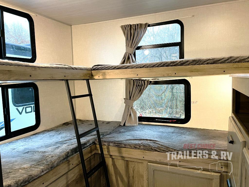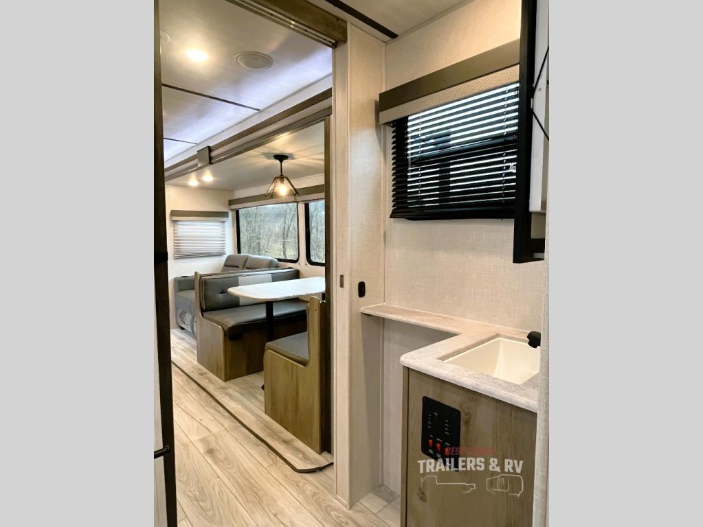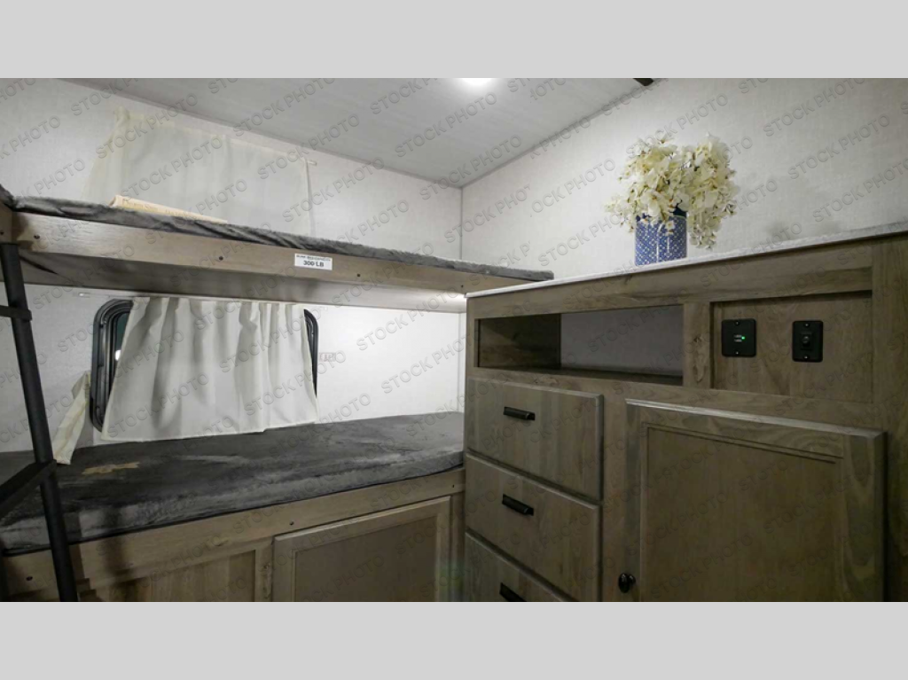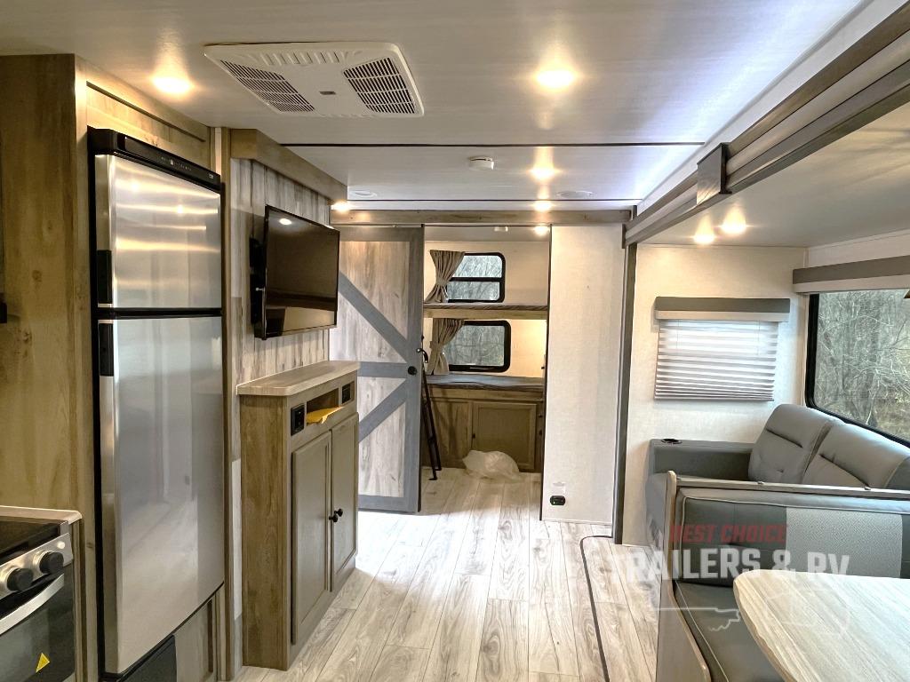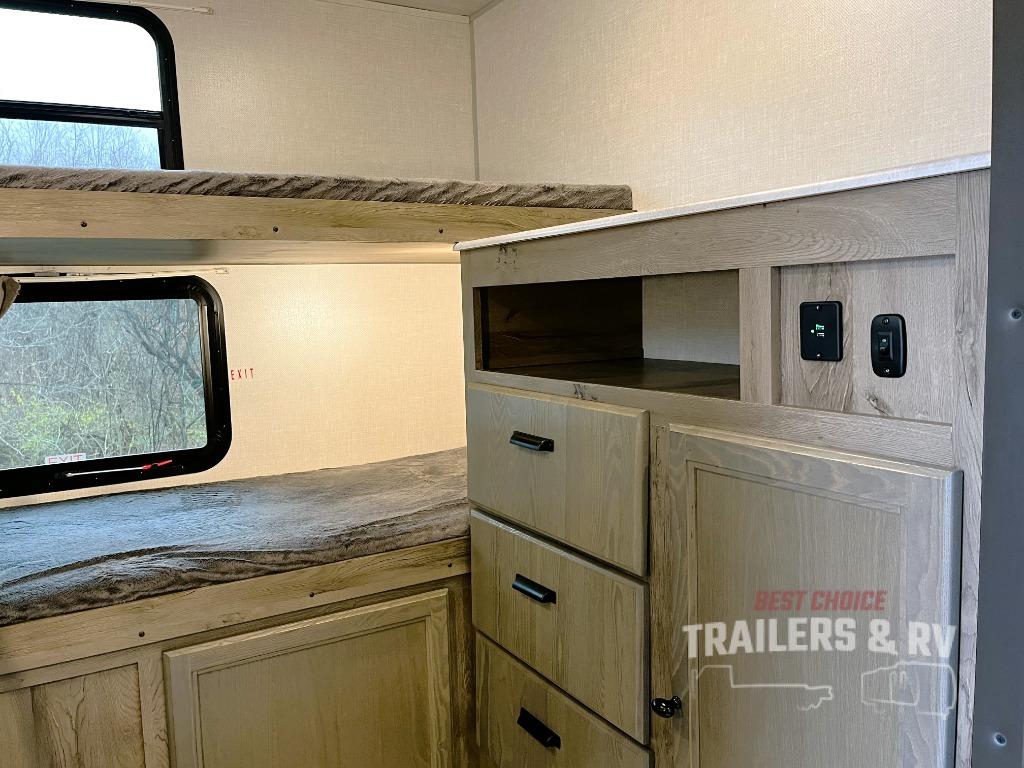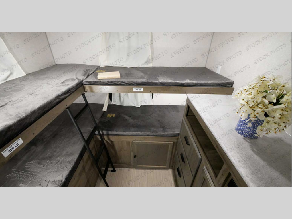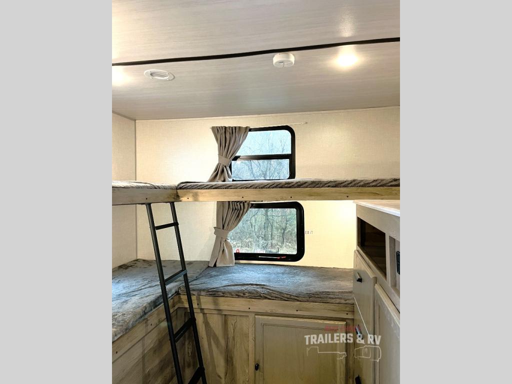 This spacious travel trailer is perfect for those who need plenty of sleeping space! There are four bunks in the bunkhouse for little ones or your friends, and the front master bedroom will feel just like home with its queen-size bed and dual drawers. You'll find a sofa and U-shaped dinette within the large slide in the main living area, and there is a walk-in pantry to store food, jackets, or umbrellas. Don't overlook the exterior that includes an outside kitchen, a 21' one touch electric awning, and outside storage!