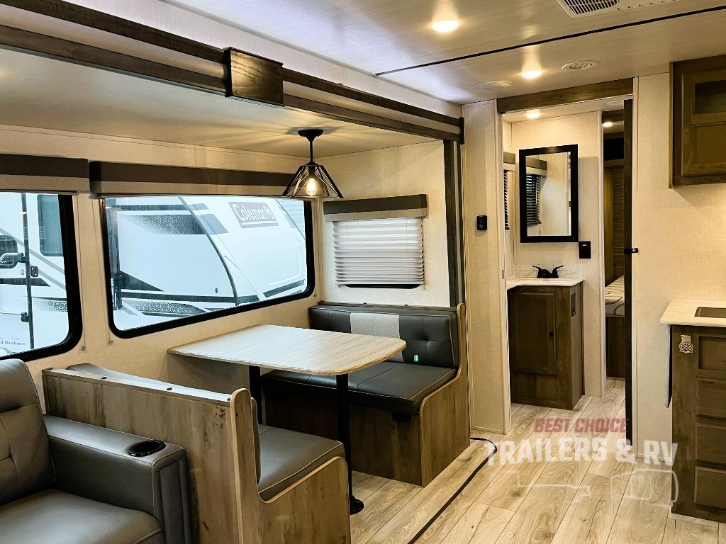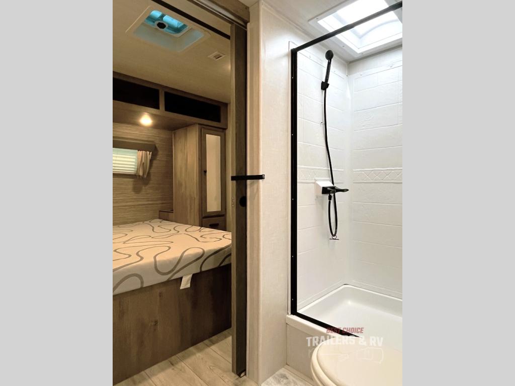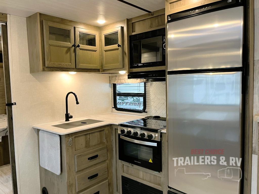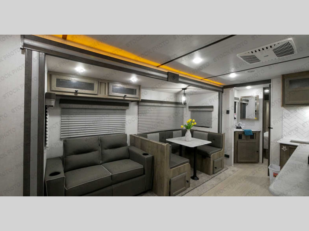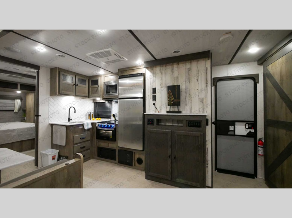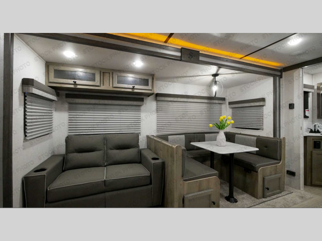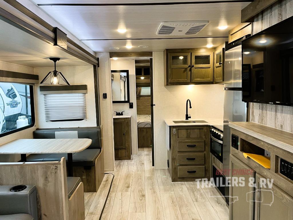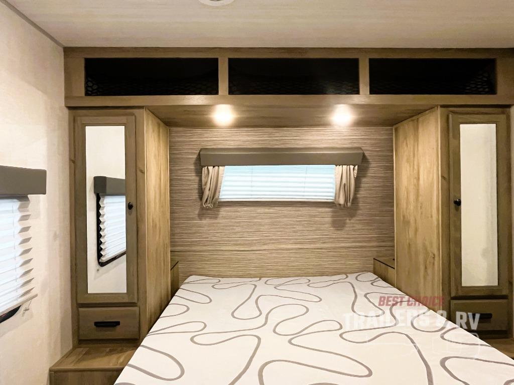 This spacious travel trailer is perfect for those who need plenty of sleeping space! There are four bunks in the bunkhouse for little ones or your friends, and the front master bedroom will feel just like home with its queen-size bed and dual drawers. You'll find a sofa and U-shaped dinette within the large slide in the main living area, and there is a walk-in pantry to store food, jackets, or umbrellas. Don't overlook the exterior that includes an outside kitchen, a 21' one touch electric awning, and outside storage!