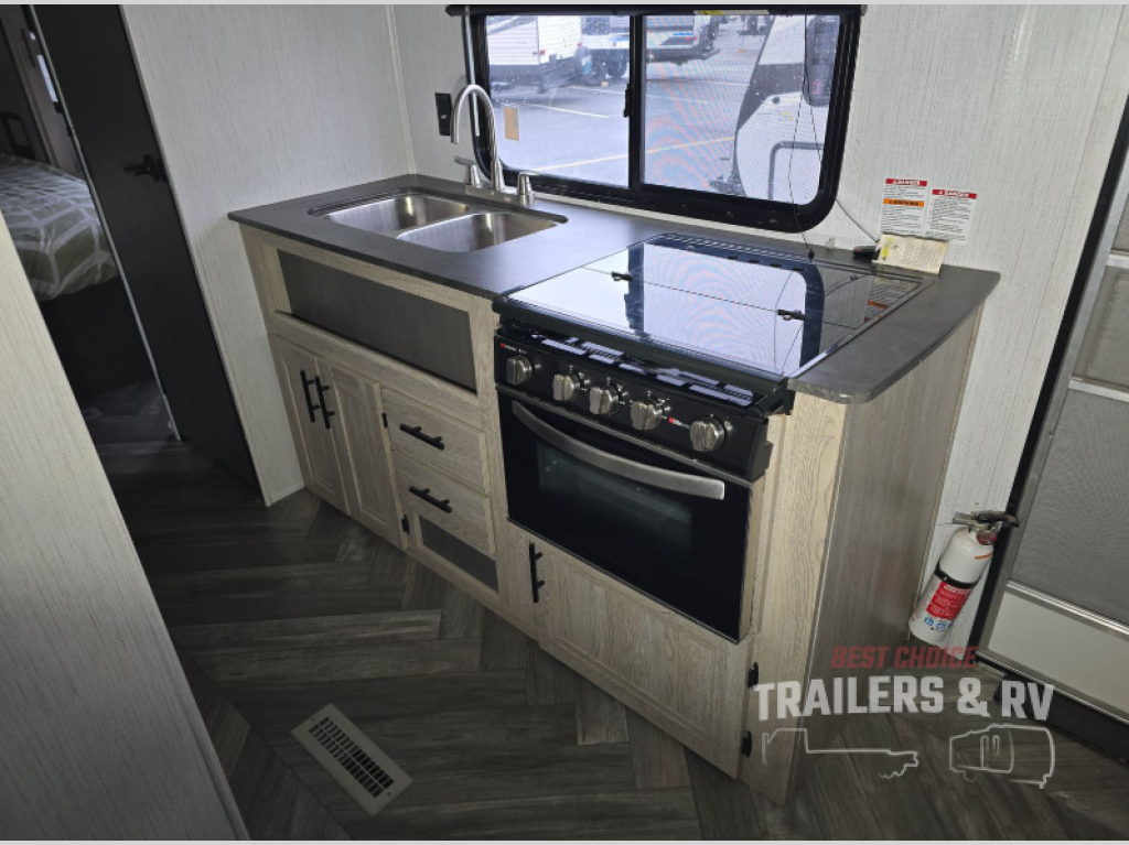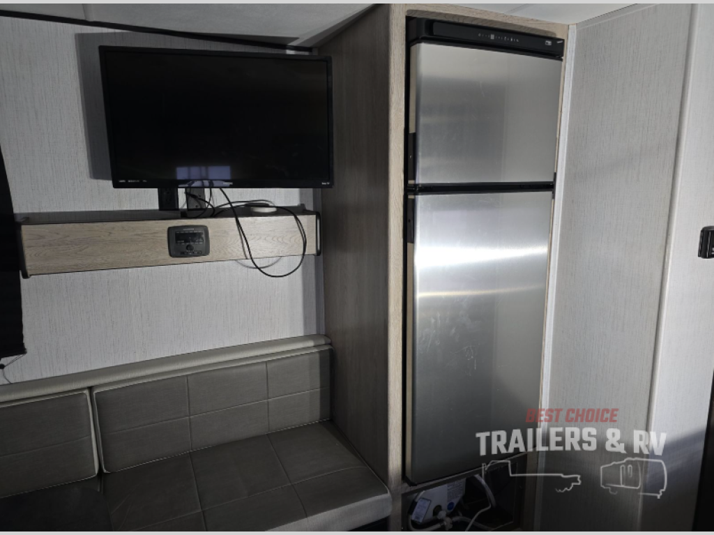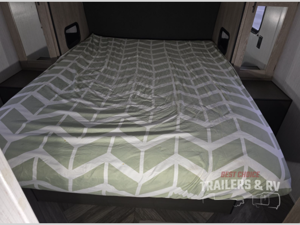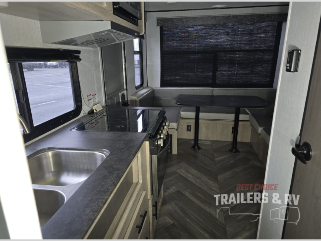 This is the perfect upgrade if you're ready to go from a tent to a travel trailer. You will have your own queen bed in the front private bedroom, plus dual shirt wardrobes to keep your clothes wrinkle-free. The U-shaped dinette in the back provides a place to dine at, and your guests can sleep here if you have any. Whip up your best meals on the three burner cooktop or in the microwave oven, and the pull-out faucet will make clean-up a breeze. This model also includes a pantry/wardrobe to store jackets, shoes, and dry goods.