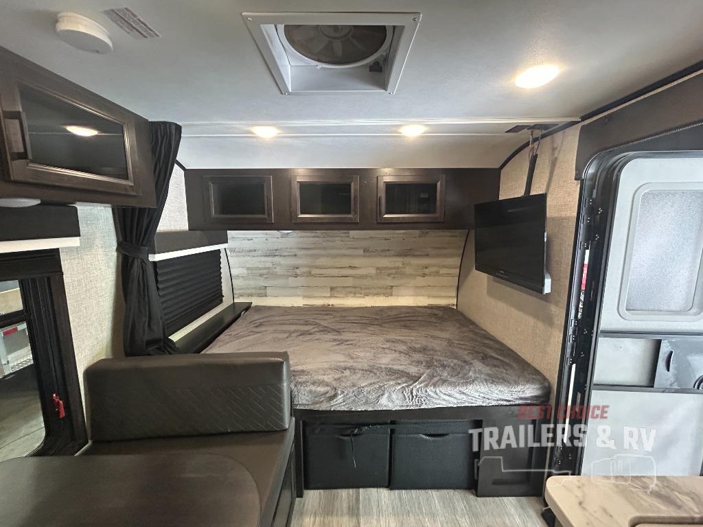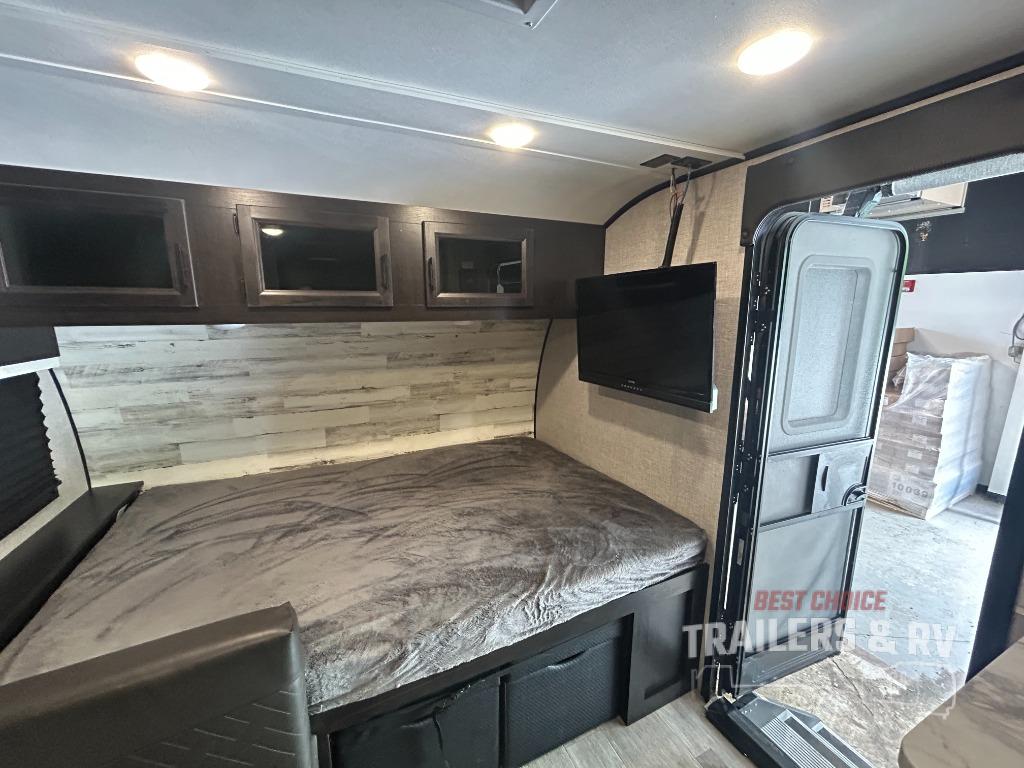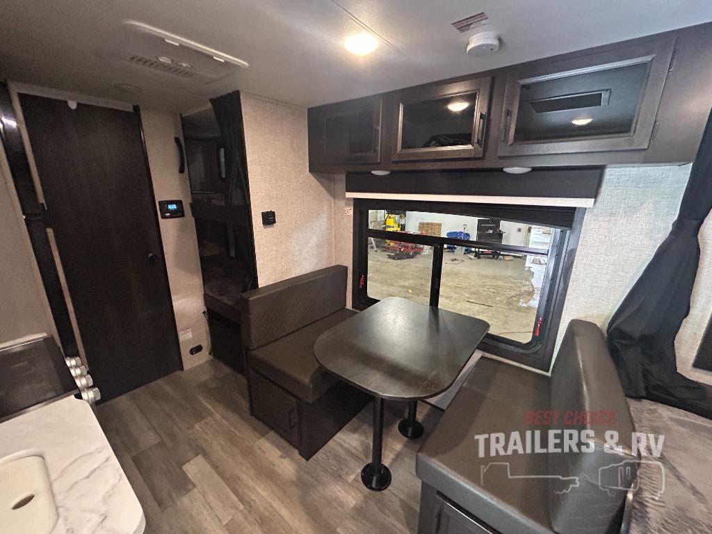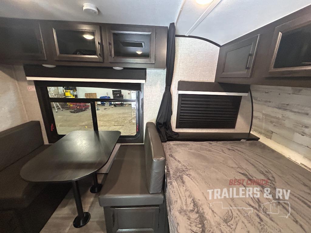 If you've been looking for a lightweight travel trailer with more sleeping space, your search is over with this model! There are bunk beds in the back near the full bath for convenience, a front queen bed, plus a booth dinette that will double as dining and sleeping space. This model also includes overhead compartments for your belongings, plus exterior storage for you fishing poles or tackle boxes.