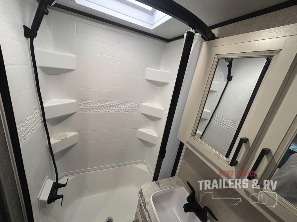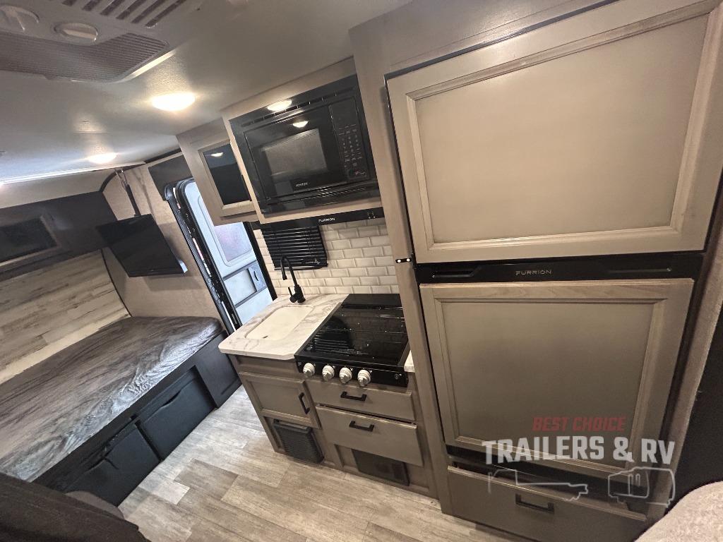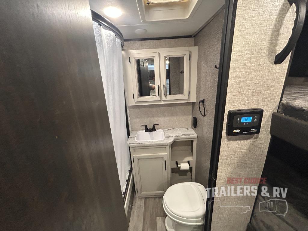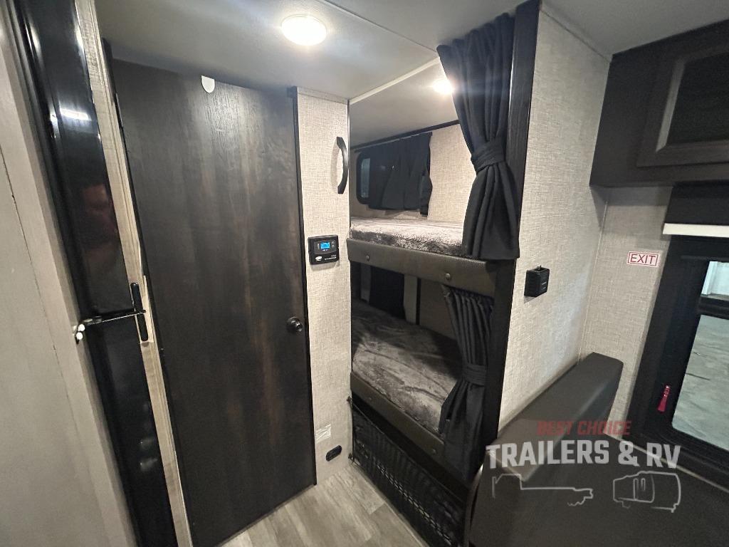 If you've been looking for a lightweight travel trailer with more sleeping space, your search is over with this model! There are bunk beds in the back near the full bath for convenience, a front queen bed, plus a booth dinette that will double as dining and sleeping space. This model also includes overhead compartments for your belongings, plus exterior storage for you fishing poles or tackle boxes.