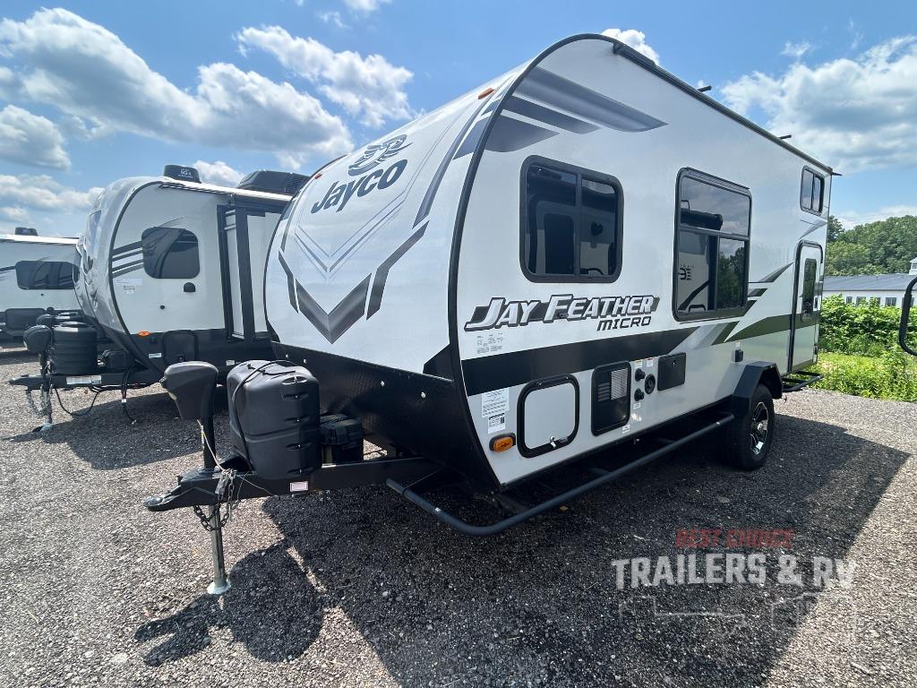 The Jay Feather Micro travel trailers by Jayco are for those looking for lightweight camping, while not sacrificing comfort and convenience. The modern retro graphics package is sure to be eye-catching, and the newly designed interiors will have you feeling right at home. Each model features an American-made frame with an integrated A-frame, Goodyear off-road tires, plus galvanized steel and impact-resistant wheel wells for added protection during transport. Some of the interior comforts you will enjoy are the residential vinyl flooring with cold crack resistance, screwed and glued cabinetry, and LED lighting. Adventure is waiting for you with a Jay Feather Micro travel trailer. Choose your favorite floorplan today!