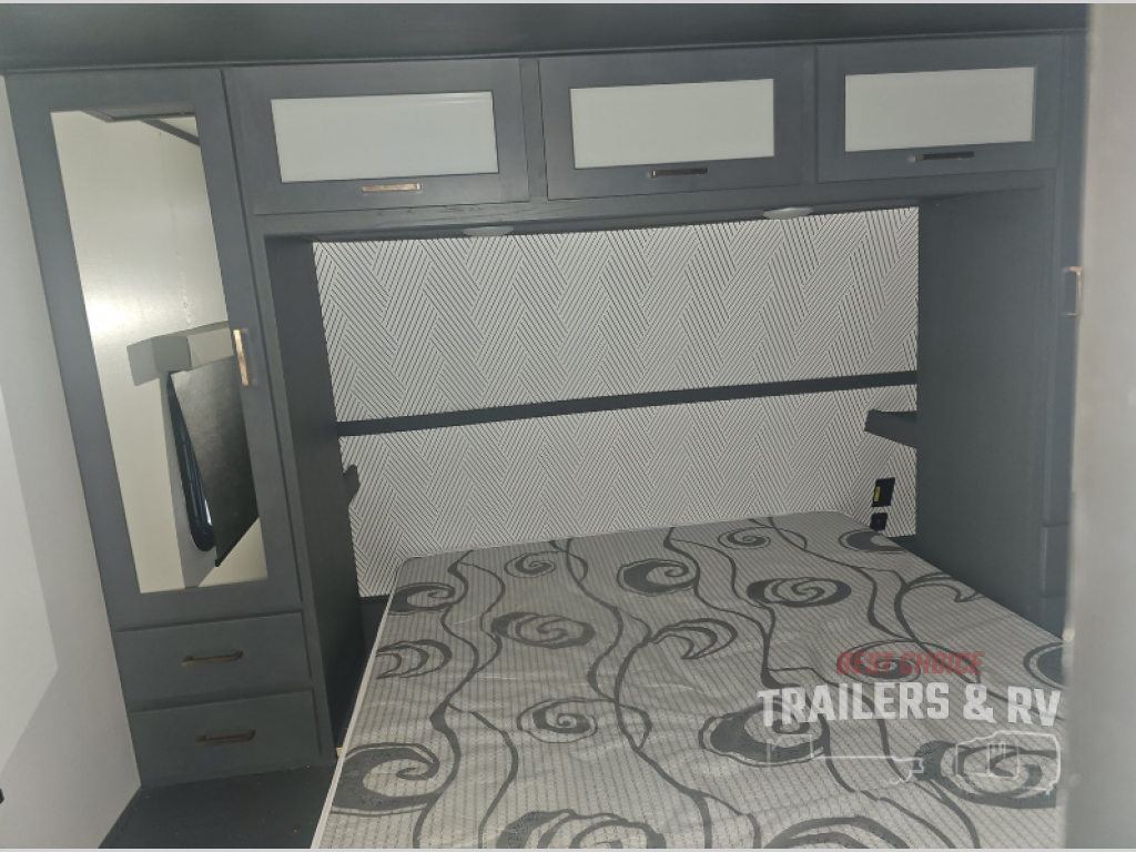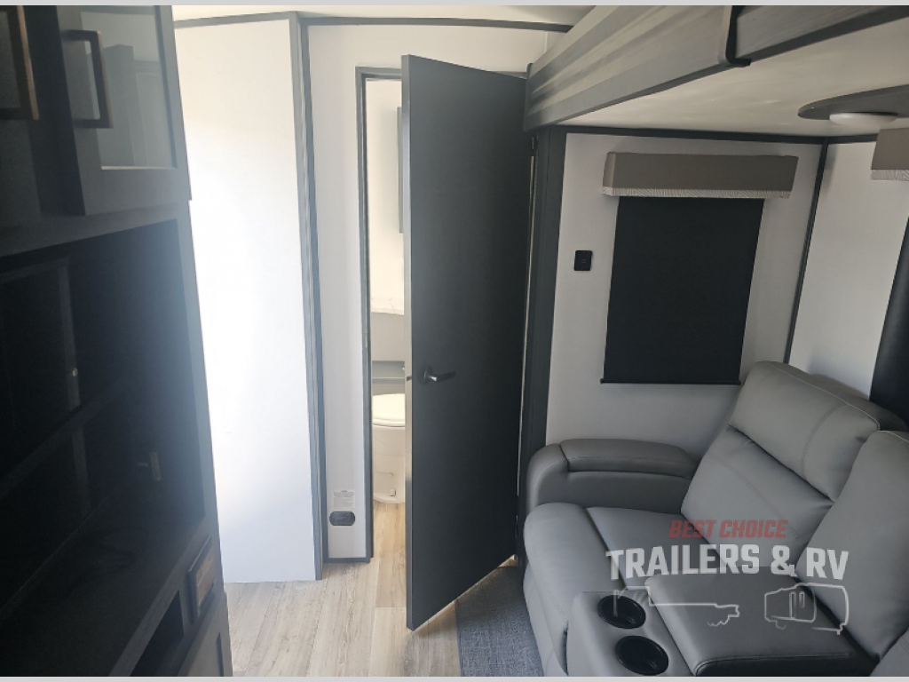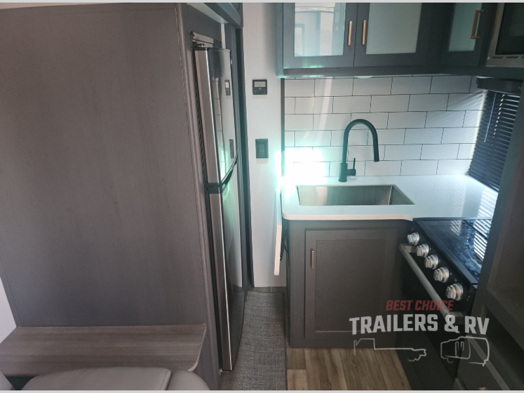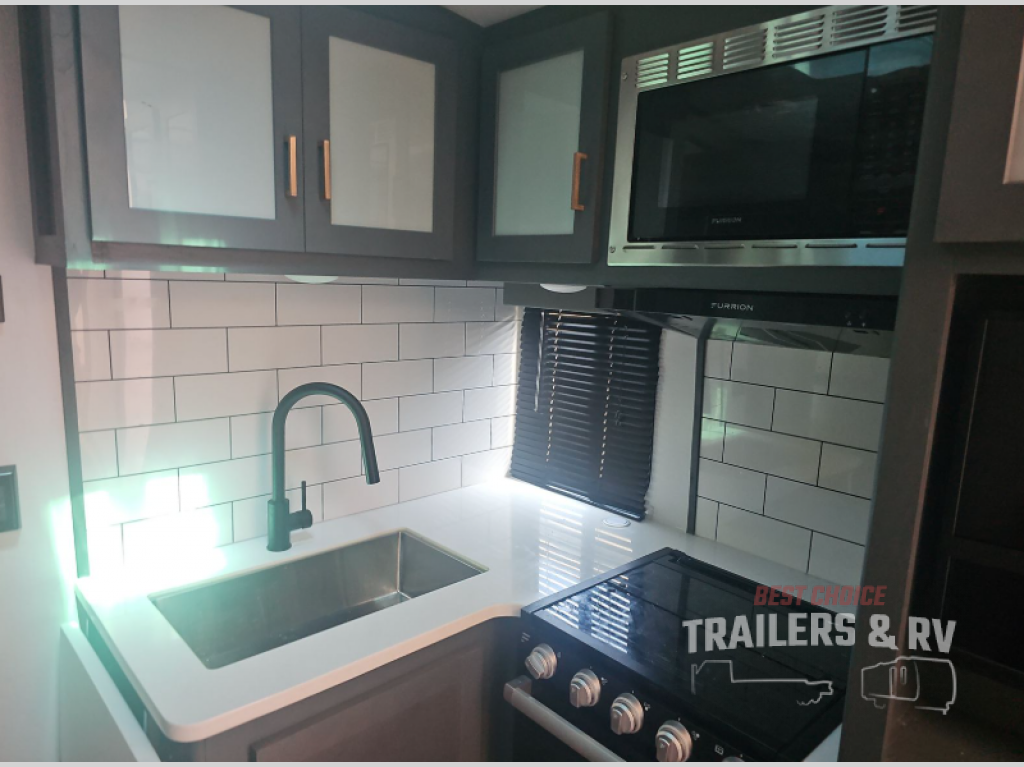 If you're looking for a lightweight travel trailer that is packed full of convenient camping features then look no further! This unit has a front private bedroom with a queen bed that has wardrobes on either side and a laundry chute that leads to the exterior pass-through storage area. The full rear bathroom has a walk-in shower with a skylight above and two linen closets to keep your towels and toiletries out of the way. The chef can choose to either cook indoors with the three burner Furrion gas range or breathe in some fresh air while cooking with the outside kitchen with a two burner cooktop, sink, mini refrigerator, and overhead cabinets for your cooking essentials. Enjoy all of your meals at the U-shaped dinette which can also transform into an extra sleeping space, but you could switch the dinette out for the optional luxury cinema recliners to relax in while watching a movie with the entertainment center!