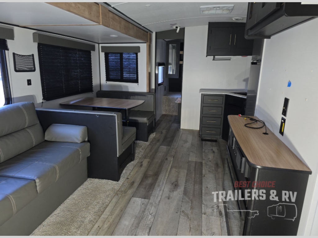You will have plenty of room for hosting and sleeping up to nine individuals throughout your vacation in this travel trailer. There is a queen bed in the front private bedroom, double-size bunks in the rear, plus a sofa and a booth dinette slide out that folds down so that you can have extra sleeping space. You will have places for relaxing, cooking, playing games, or talking late into the night with your loved ones inside and outside. Don't be afraid to bring along as much as you want thanks to the walk-in pantry, the overhead cabinets, the dual closets in the bedroom, plus the exterior storage for your outdoor gear.