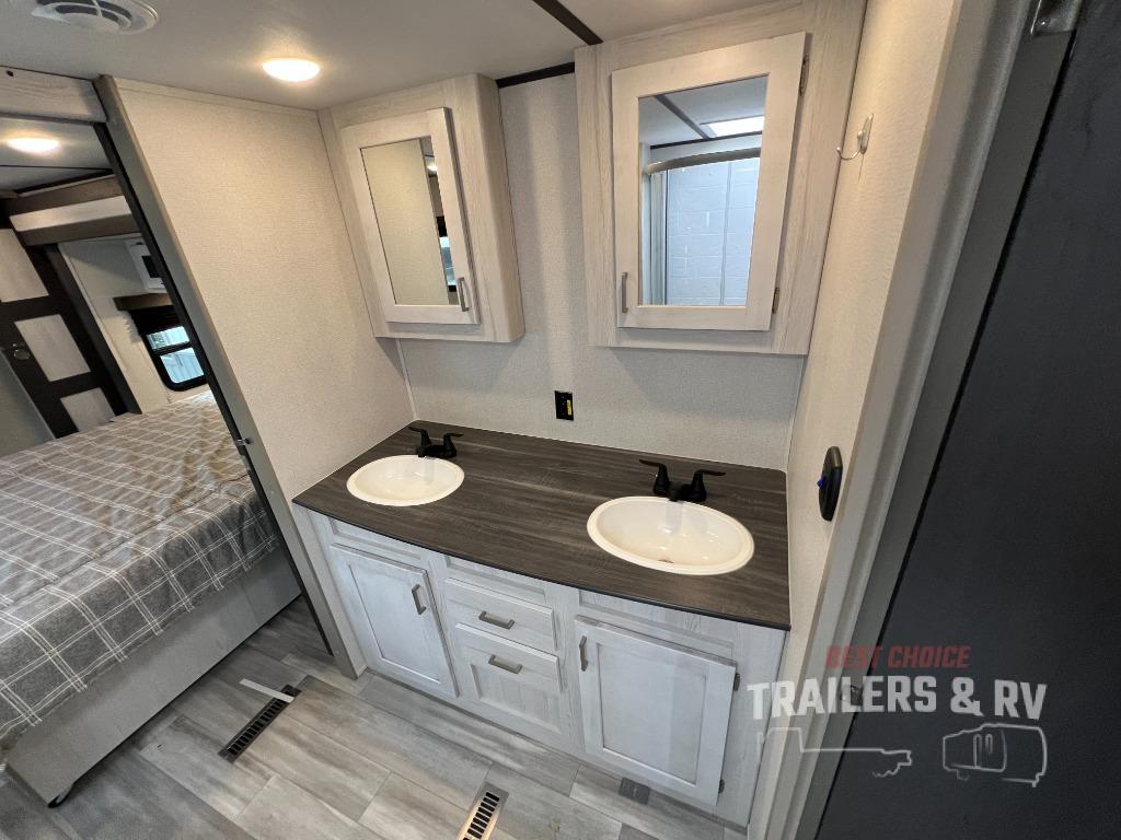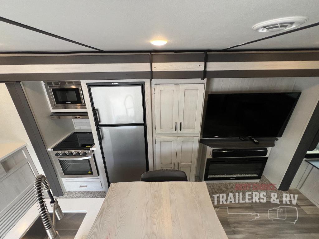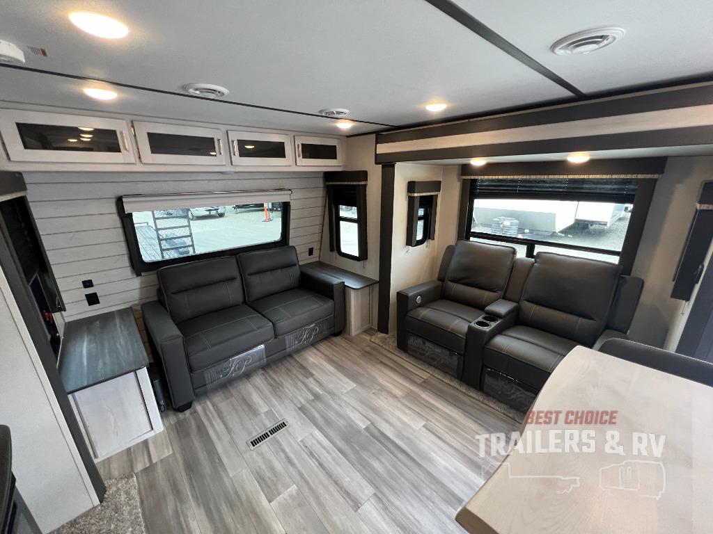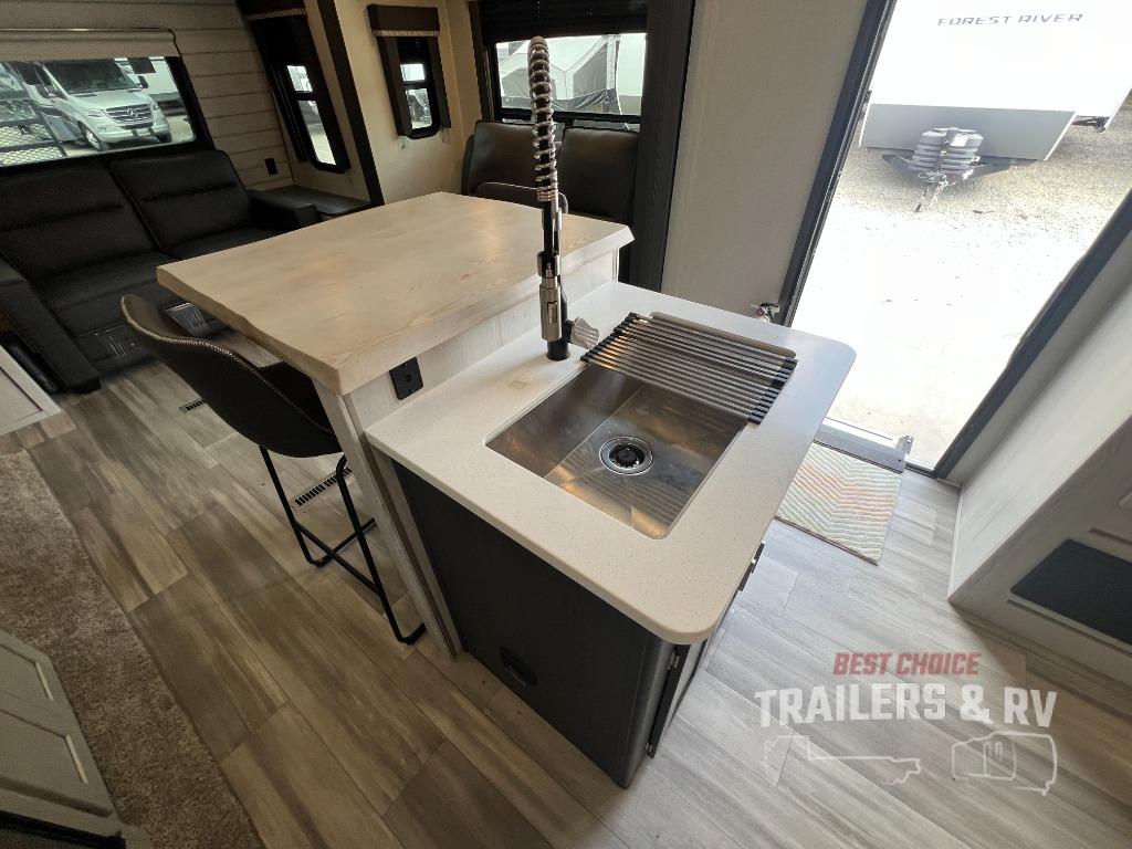 This Sprinter Limited travel trailer has a great kitchen that offers you a solid-surface island top with seating on either side. The kitchen also has a prep area, a range with glass top, two pantries, and an 8-cubic foot refrigerator. The kitchen is incorporated into the main living area, so you can all be together when dinner is being prepared. You can lounge on the queen-size tri-fold sofa or the full-reclining theater seating with massage, lights, and USB. You'll stay warm with the fireplace, and the 50" LED HDTV will provide entertainment when you're ready to watch a movie. The walk-through bathroom connects the main living area to the rear bedroom, and it offers you a dual-sink vanity to help you stay out of your spouse's way as you both get ready in the morning.
