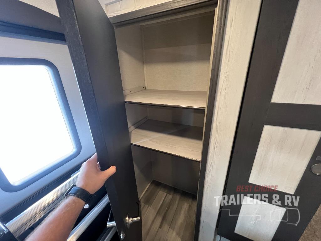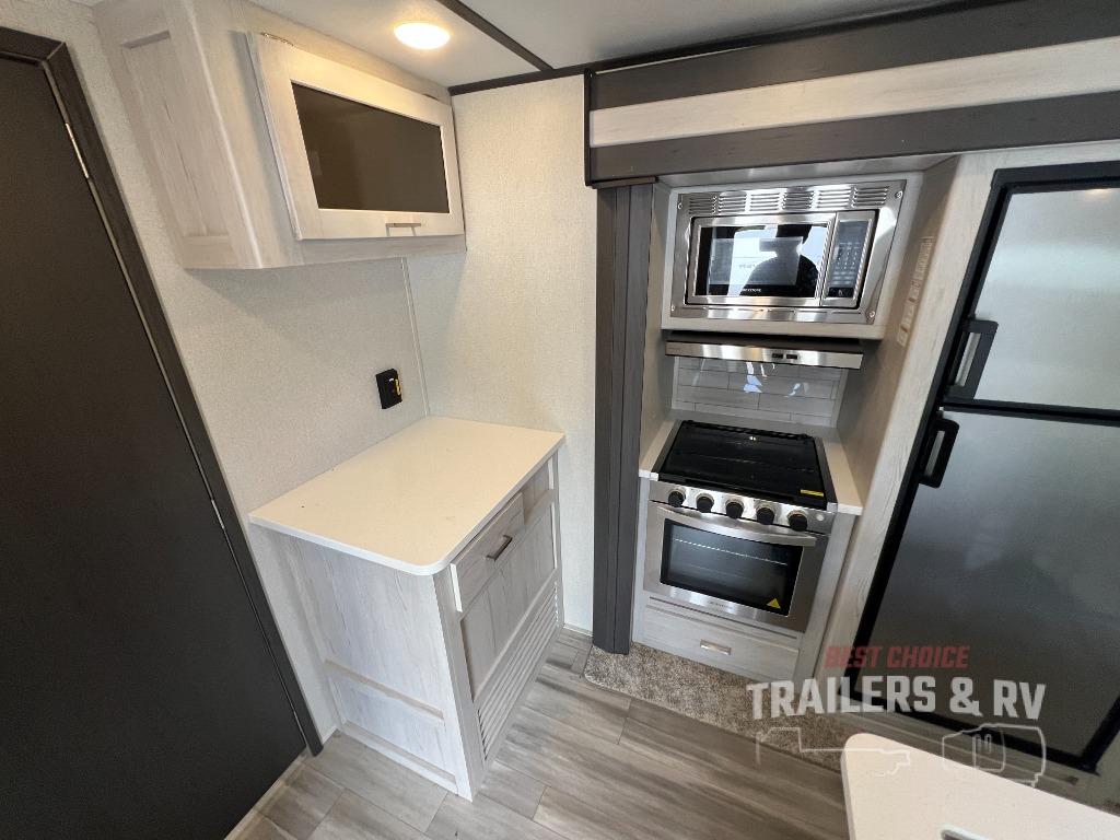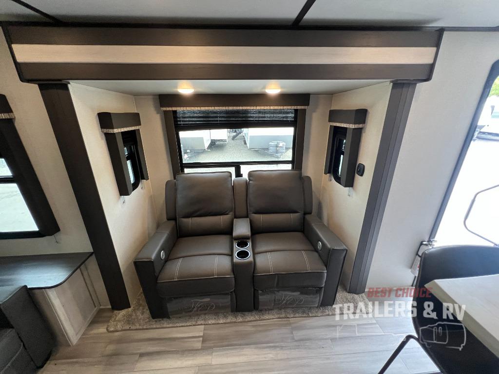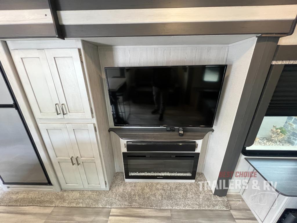 This Sprinter Limited travel trailer has a great kitchen that offers you a solid-surface island top with seating on either side. The kitchen also has a prep area, a range with glass top, two pantries, and an 8-cubic foot refrigerator. The kitchen is incorporated into the main living area, so you can all be together when dinner is being prepared. You can lounge on the queen-size tri-fold sofa or the full-reclining theater seating with massage, lights, and USB. You'll stay warm with the fireplace, and the 50" LED HDTV will provide entertainment when you're ready to watch a movie. The walk-through bathroom connects the main living area to the rear bedroom, and it offers you a dual-sink vanity to help you stay out of your spouse's way as you both get ready in the morning.