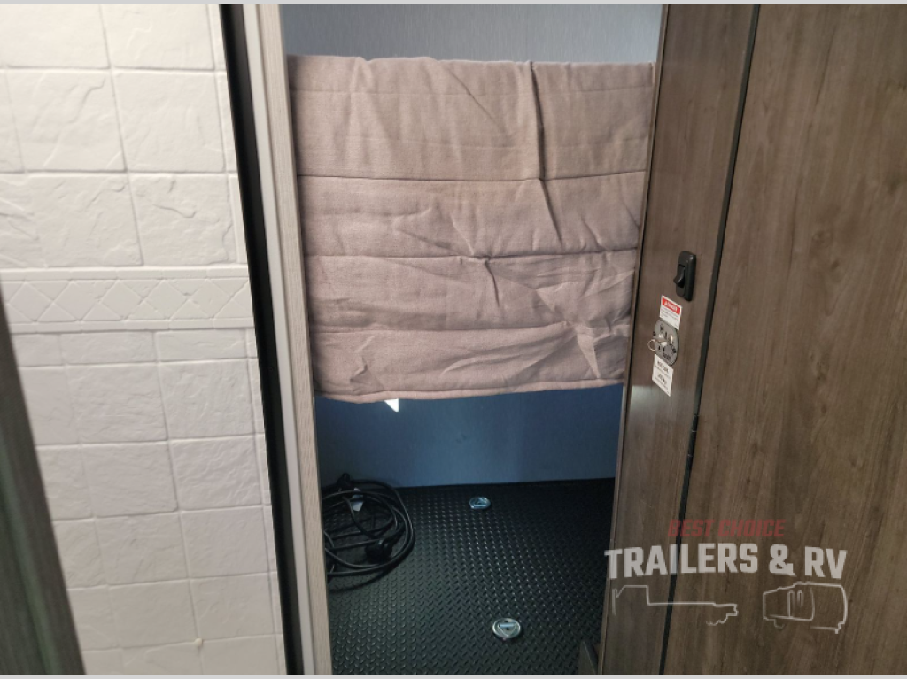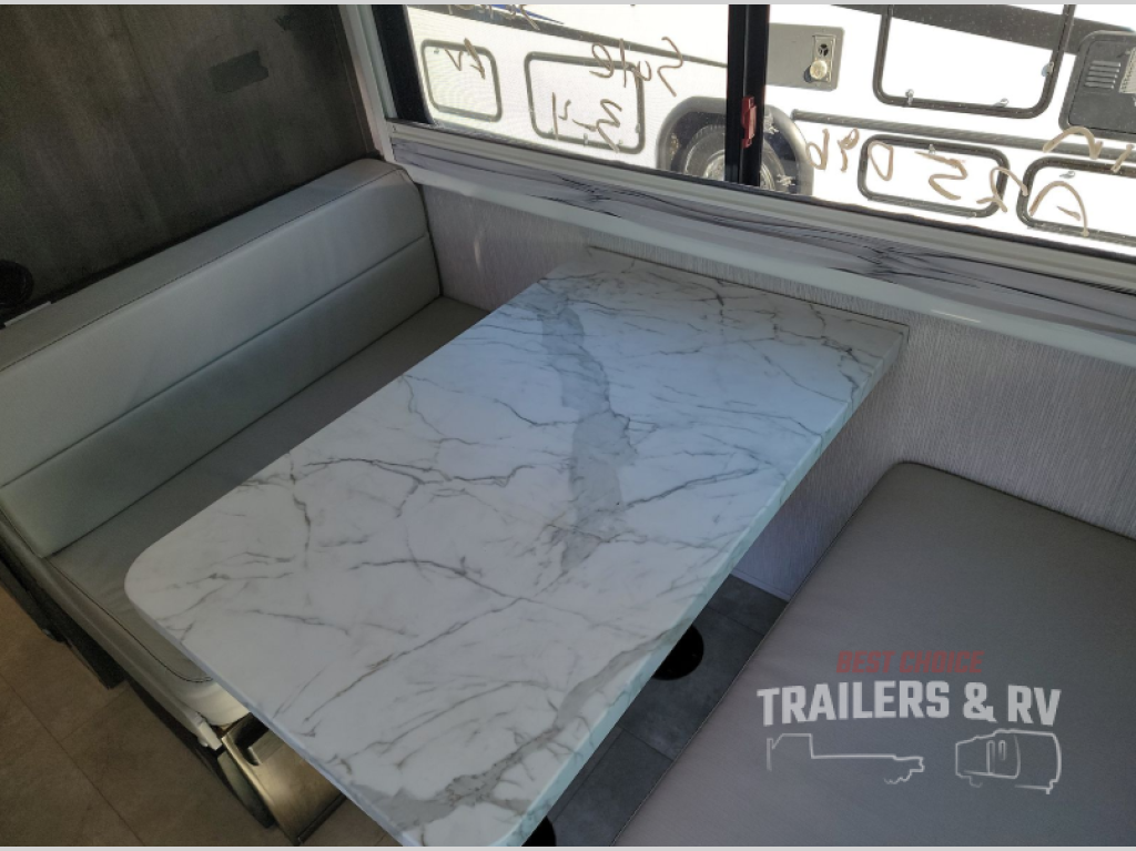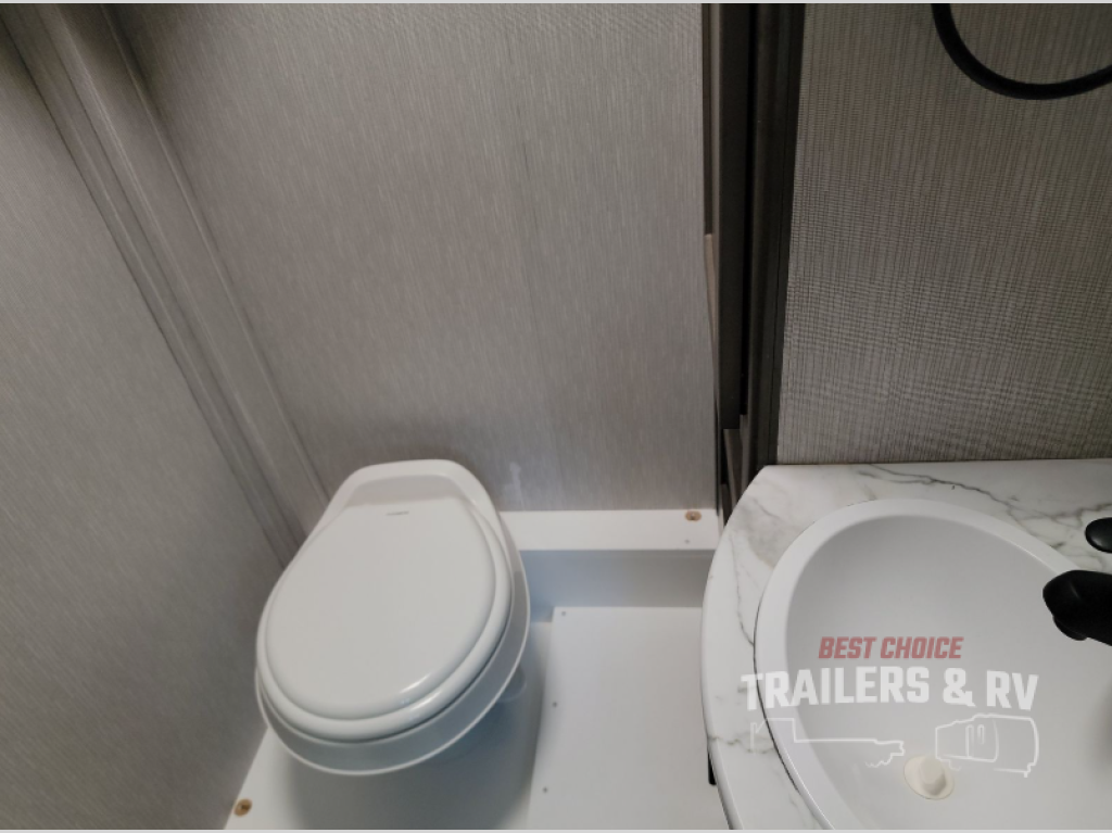 This coach is compact and full of features for you and your favorite person or family of three to enjoy road trips and camping in tighter spaces than most! The chef of your group can prepare a quick lunch on the two burner cooktop, and you can dine together on the dinette/sofa that offers sleeping for one at night. There is a large shower to clean up in, and the private toilet and sink is just across the hall so two people can freshen up at once. This coach also includes plenty of storage space in overhead compartments, within the pantry for snacks and paper goods, and even under the double-size bed where you might like to store your bike through the exterior cargo doors that open on both sides!