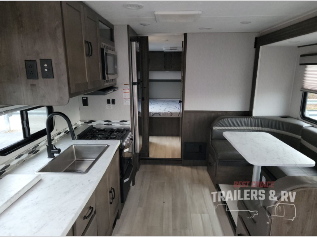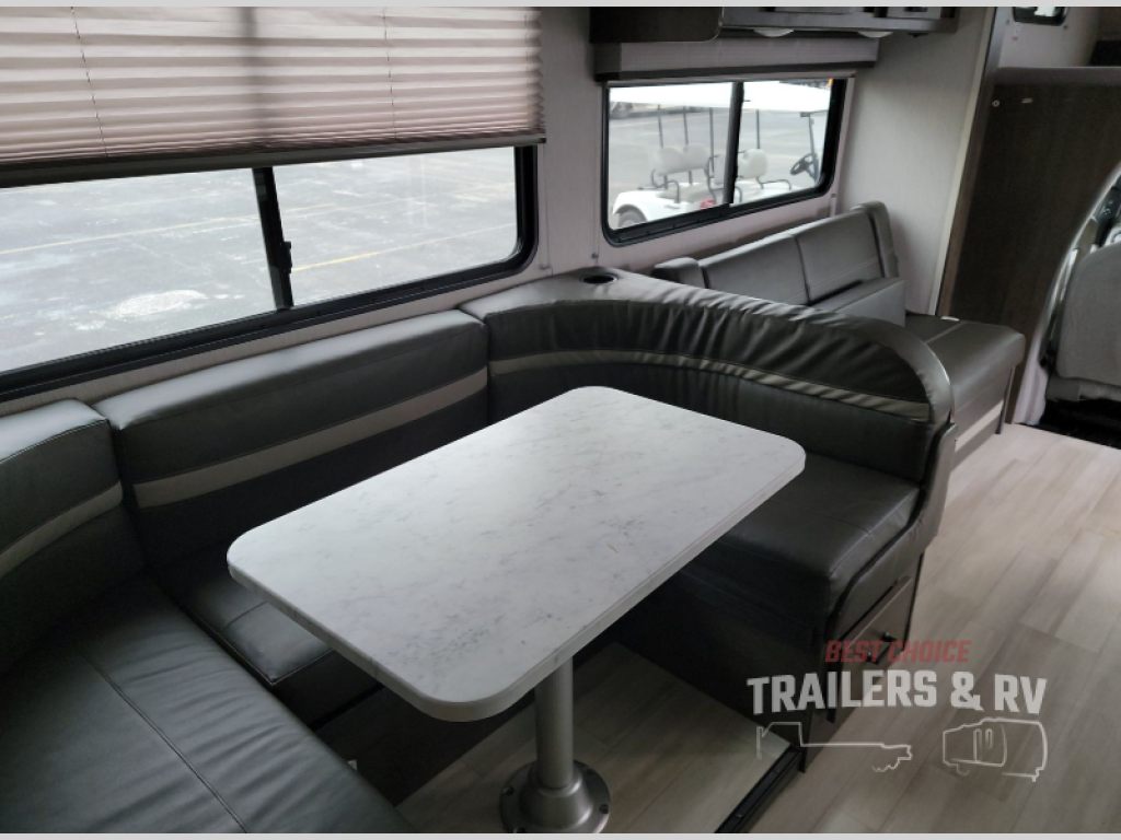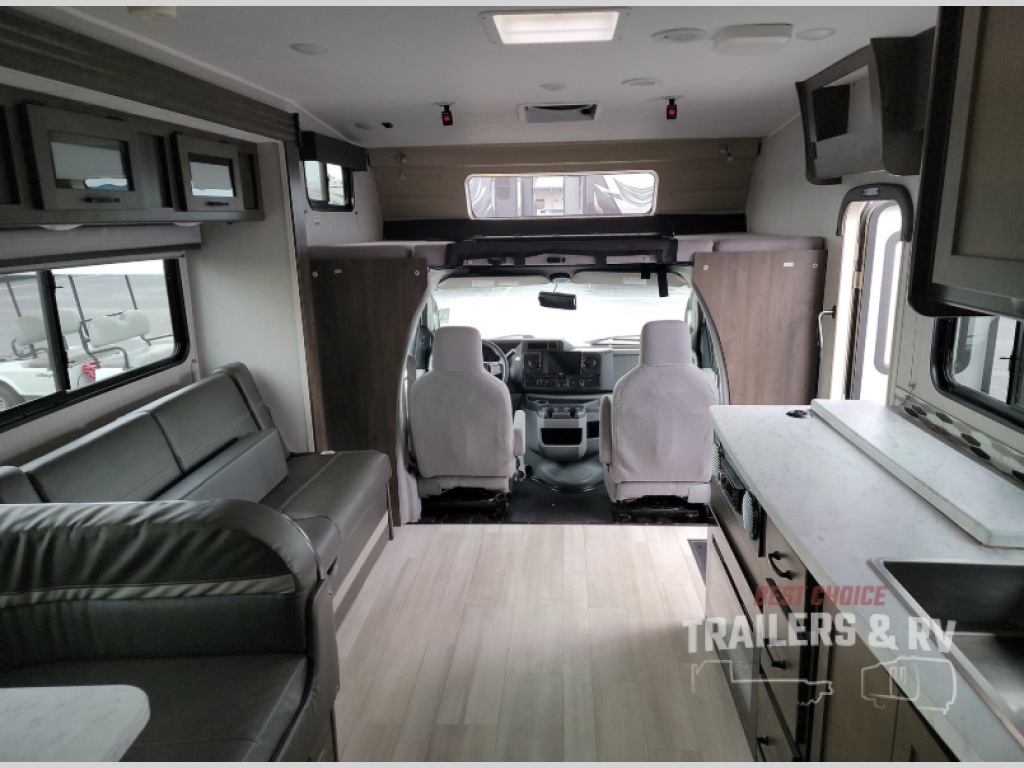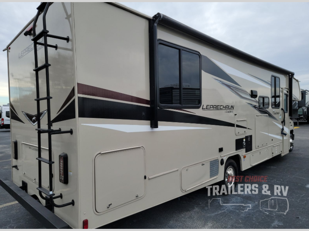 With each Leprechaun Class C gas motorhome by Coachmen you will enjoy "better" interior appointments, like the premium hardwood cabinet doors and drawer fronts, the one-piece thermofoil countertops, and the premium vinyl flooring. You will sleep soundly each night on the upgraded mattress, and staying clean will be easy with the premium showerhead and faucet in the bath. These models include reclining cockpit seats, cruise control, and a rear backup camera so you can easily get in and out of the campground. The Leprechaun is constructed with Azdel composite sidewalls, CrossFlex PVC, polyester reinforced roof material, and vacu-bond laminated walls, roof, and floor for a durable motorhome made to last.