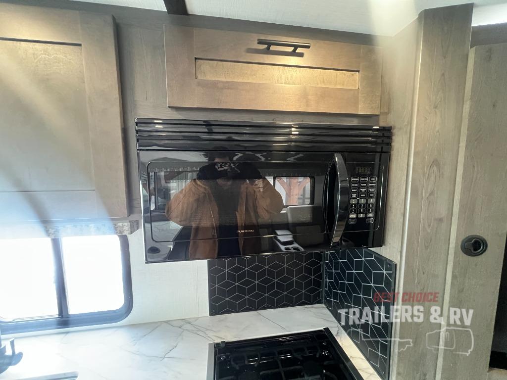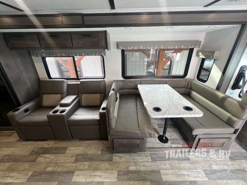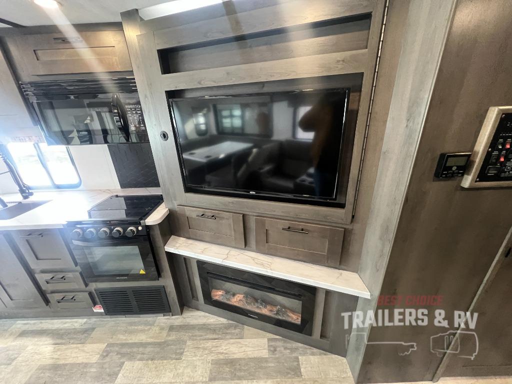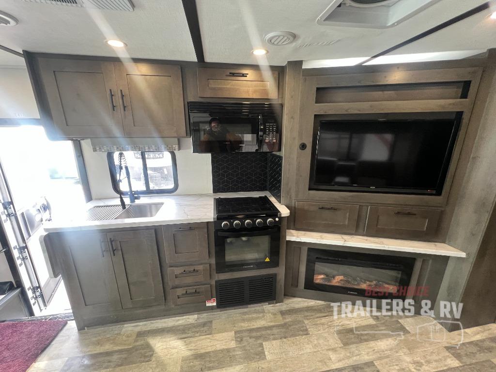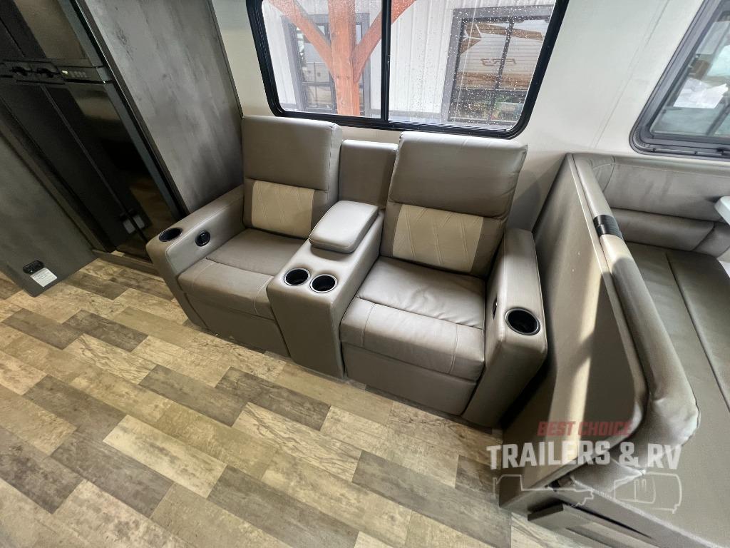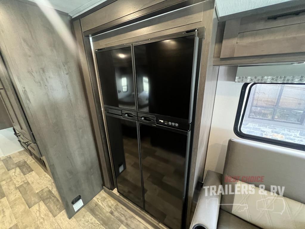 Spacious and inviting for couples or families, this FR3 Class A gas motorhome offers convenience throughout including a half bath for the kids and guests and a full rear bathroom for the owners. This full bathroom is located within the rear master suite where you will also find a king-size bed for relaxing. Once at your destination, you can quickly set up the power awning to relax outside while watching the exterior TV and visiting with other RVers. You might have decided to add the washer and dryer option in the bedroom, so a load of laundry might even get done. Once you are ready to fill your tummy, the full kitchen offers everything you need plus a residential microwave. You might even decide to relax on one of the theater seats after dinner as you watch the big game on the 40" LED 12V TV with a fireplace below.